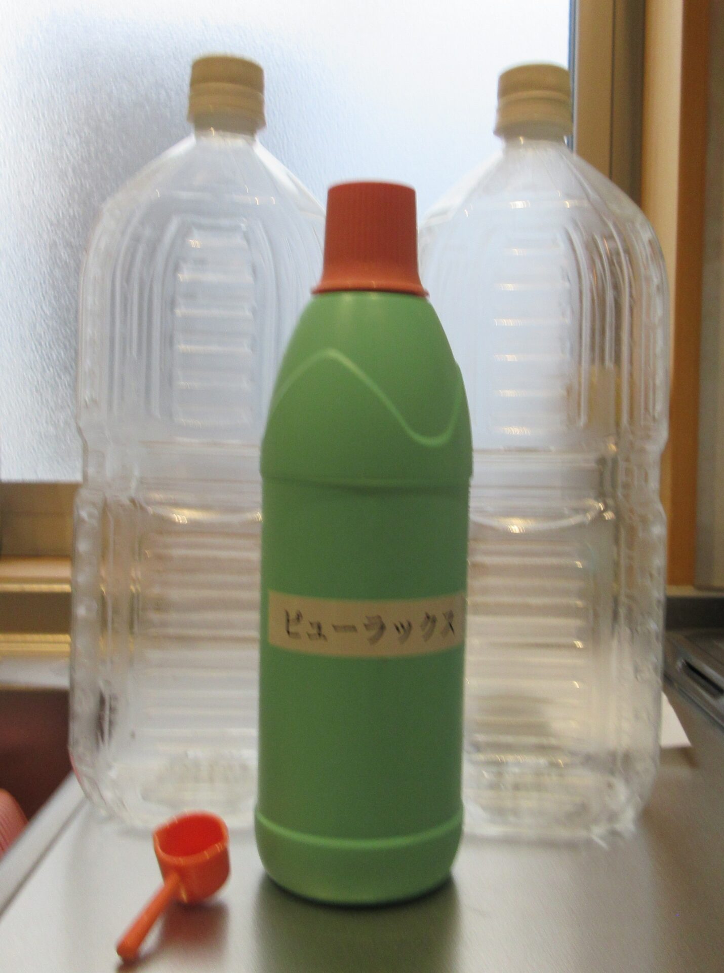 「もしも」に備えて、2Lのペットボトル2本に0.02%の『次亜塩素酸Na』を作っています。
