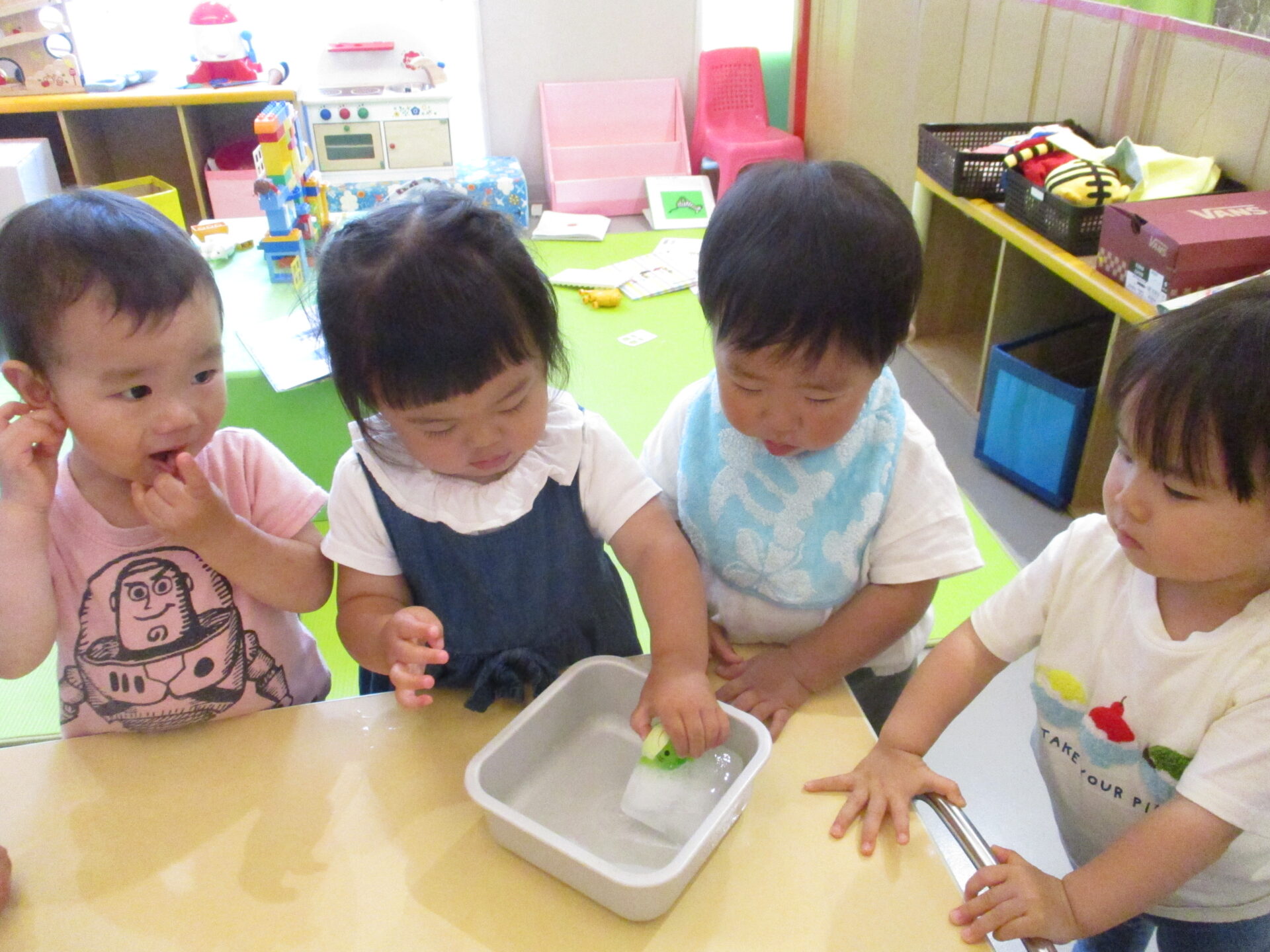 先生が、先日から、凍らしていた氷にも触ってみました。冷たい感触に、驚いて、泣きそうになったお友だちもいました。(1歳児クラス)