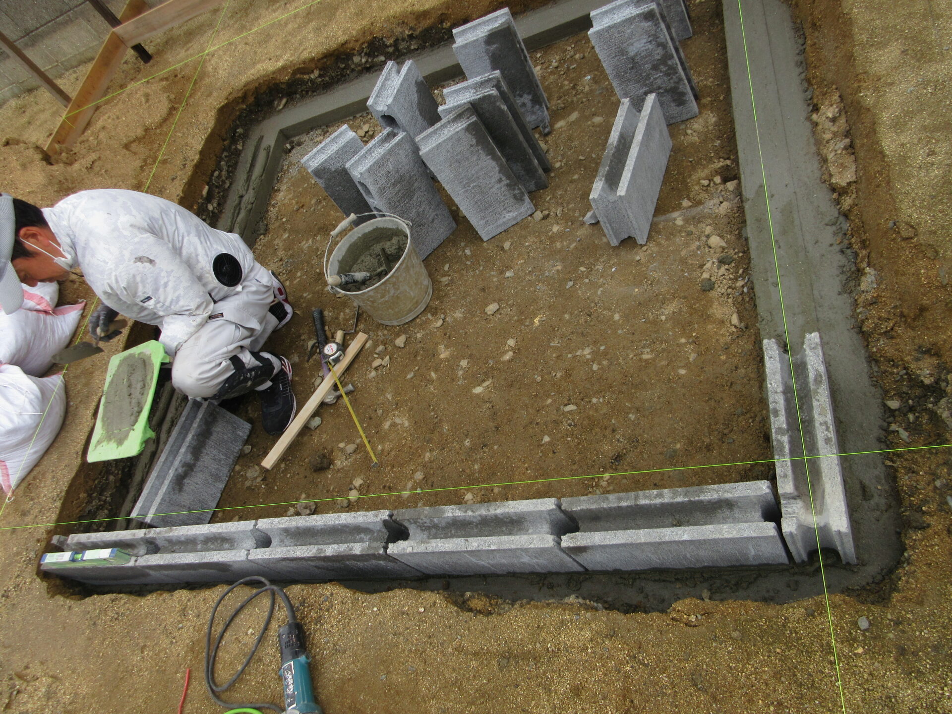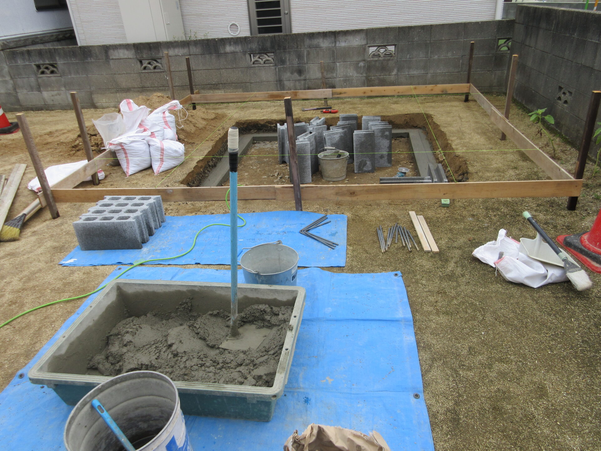 今日は、昨日モルタルを入れた上に、ブロックを敷き詰める作業でした。