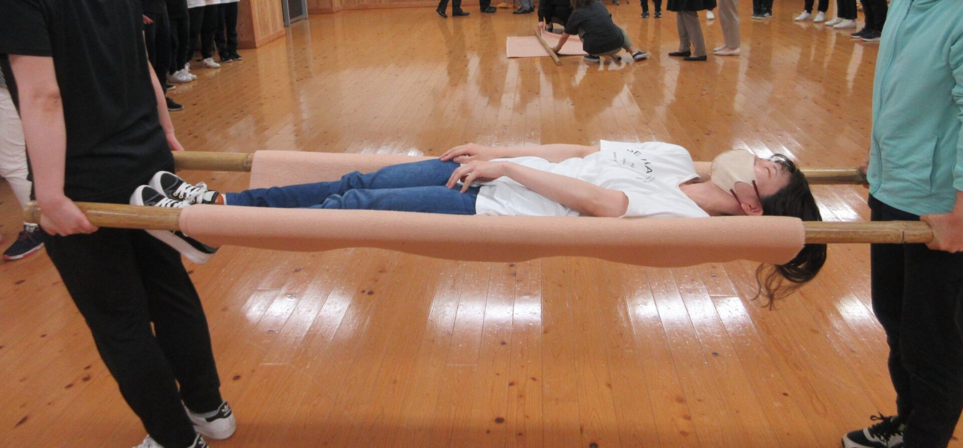 毛布と竹で、タンカを作り運ぶ方法も学びました。