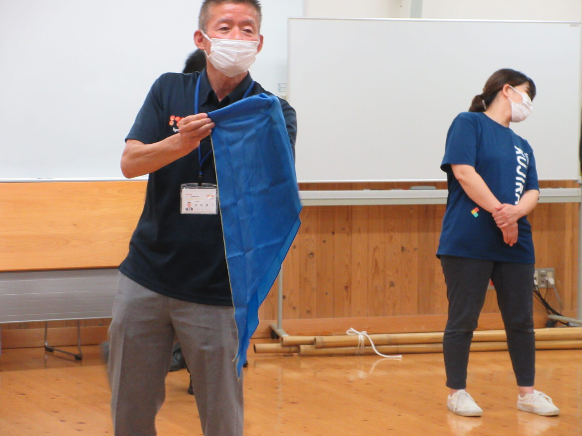 ところが、三角巾を上手く帯状に出来なくて…講師の方に何度も教えていただきました。