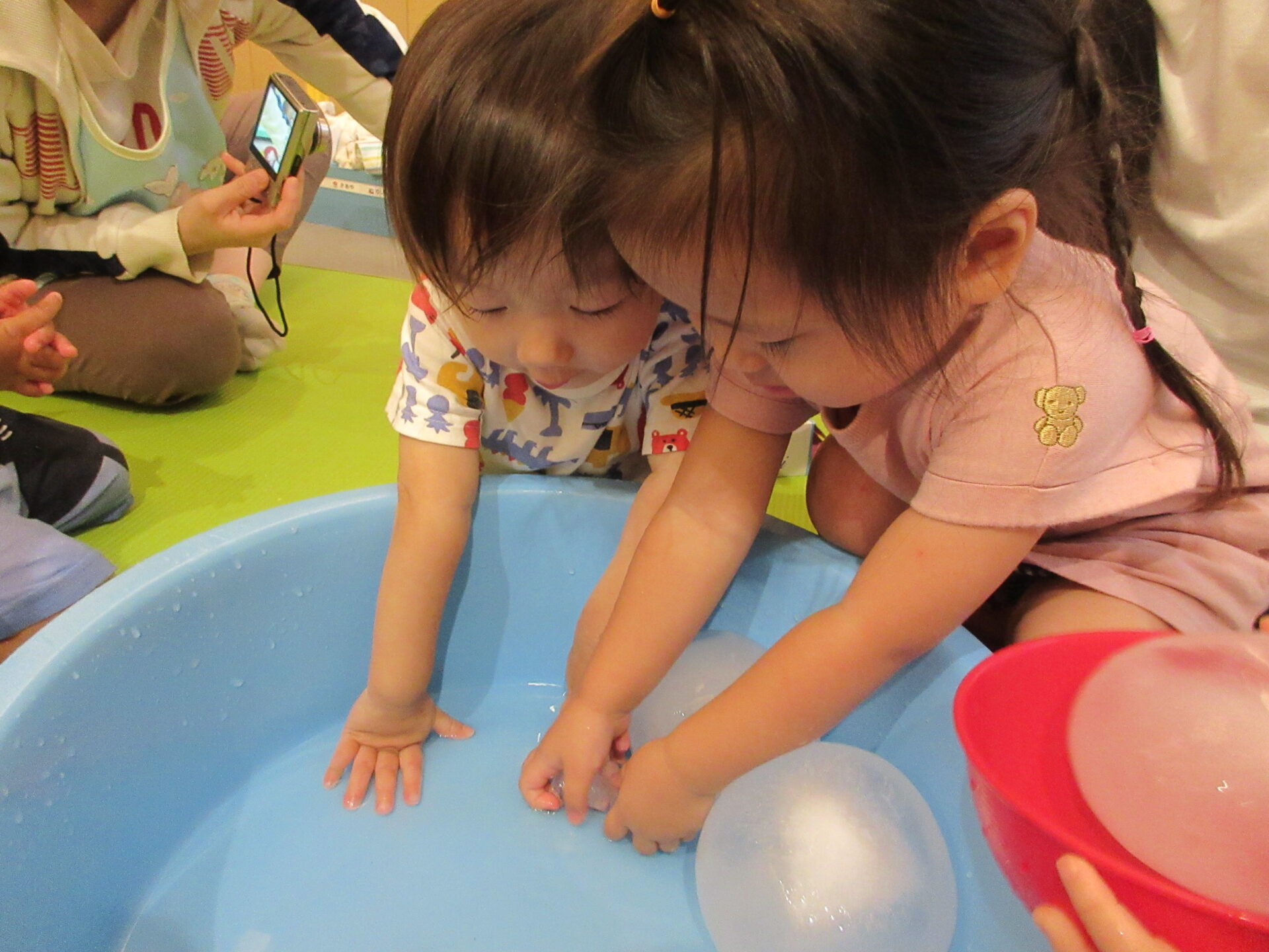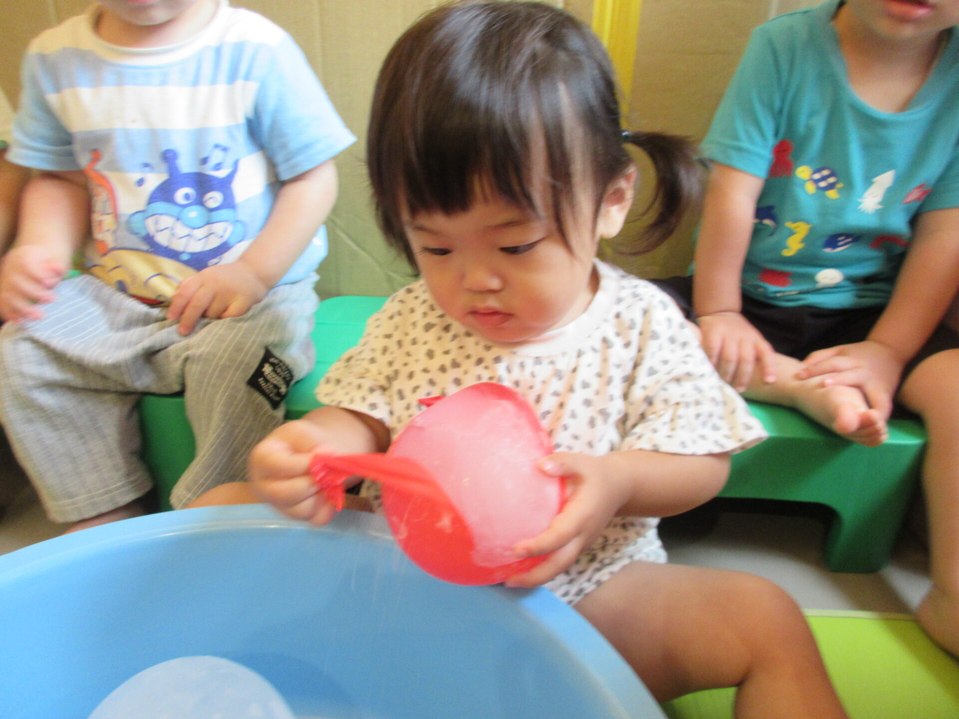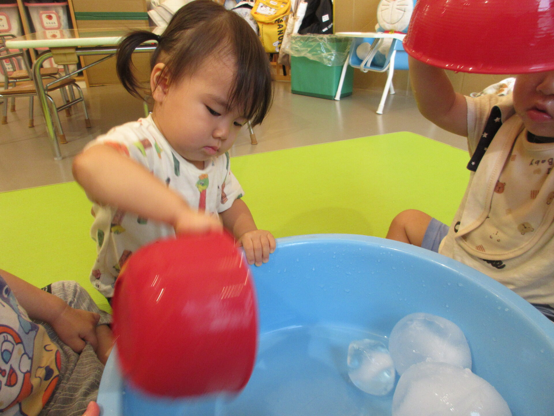 氷を持ってみたり、入れ物に入れたりして楽しみました。