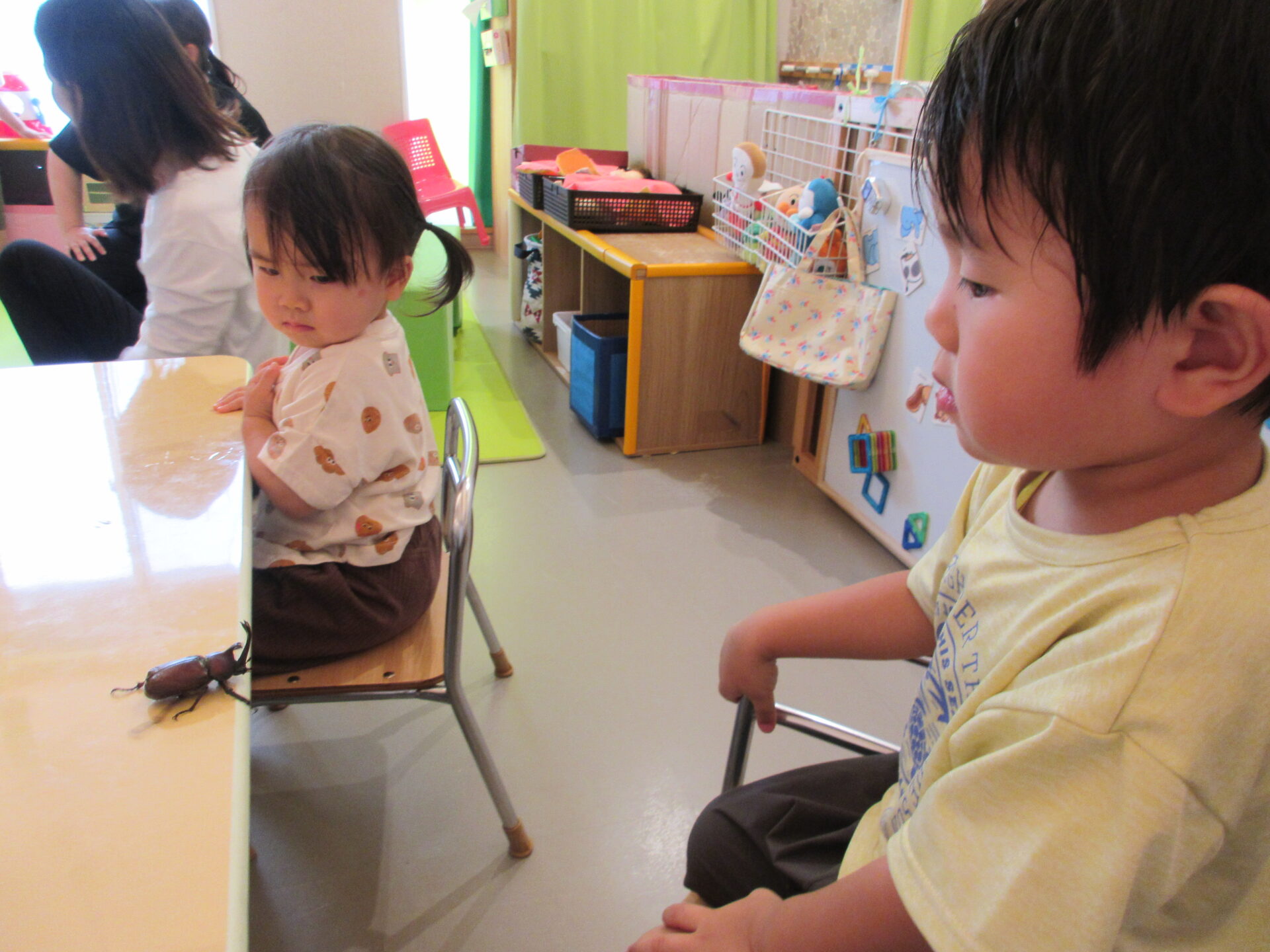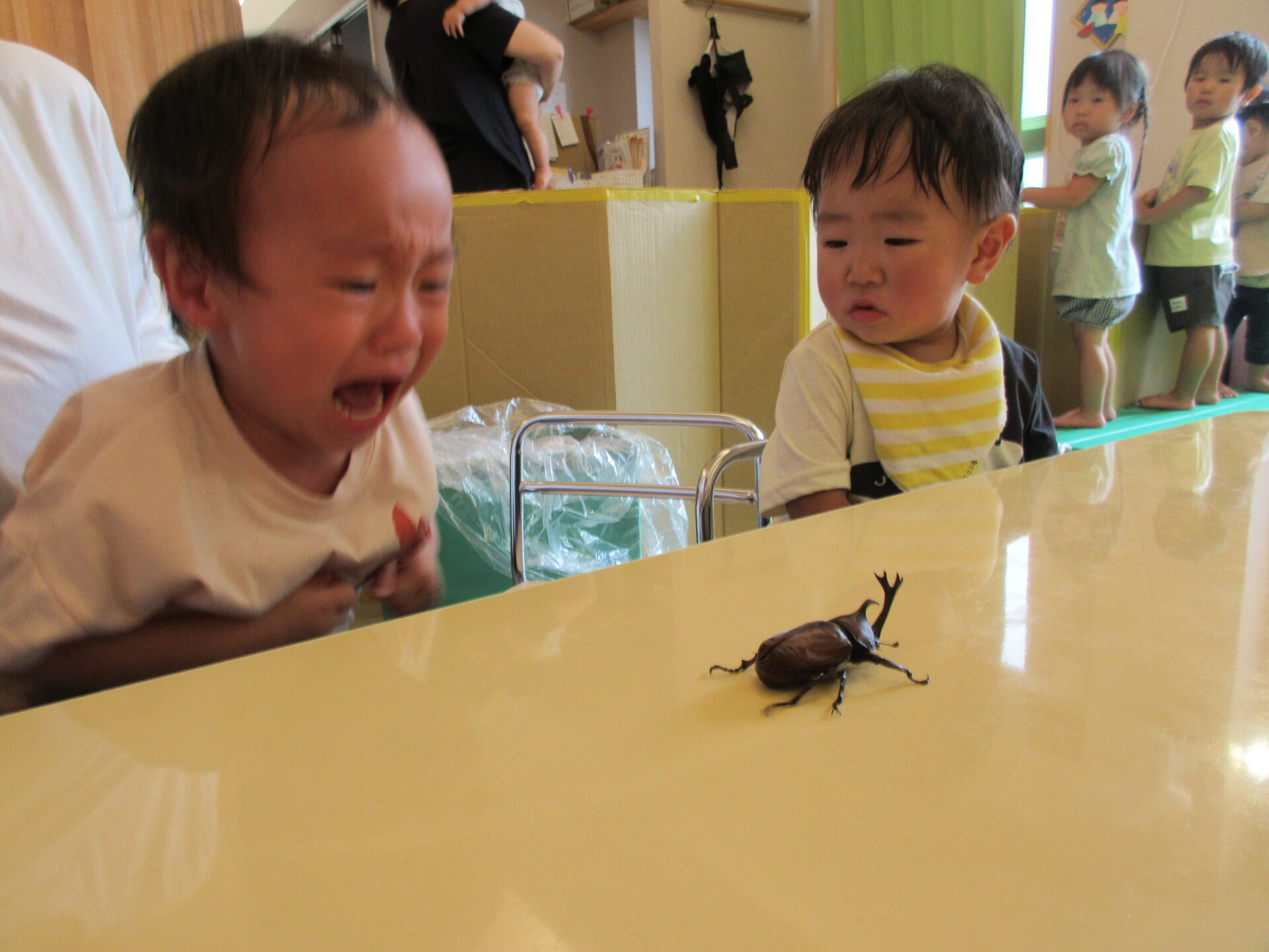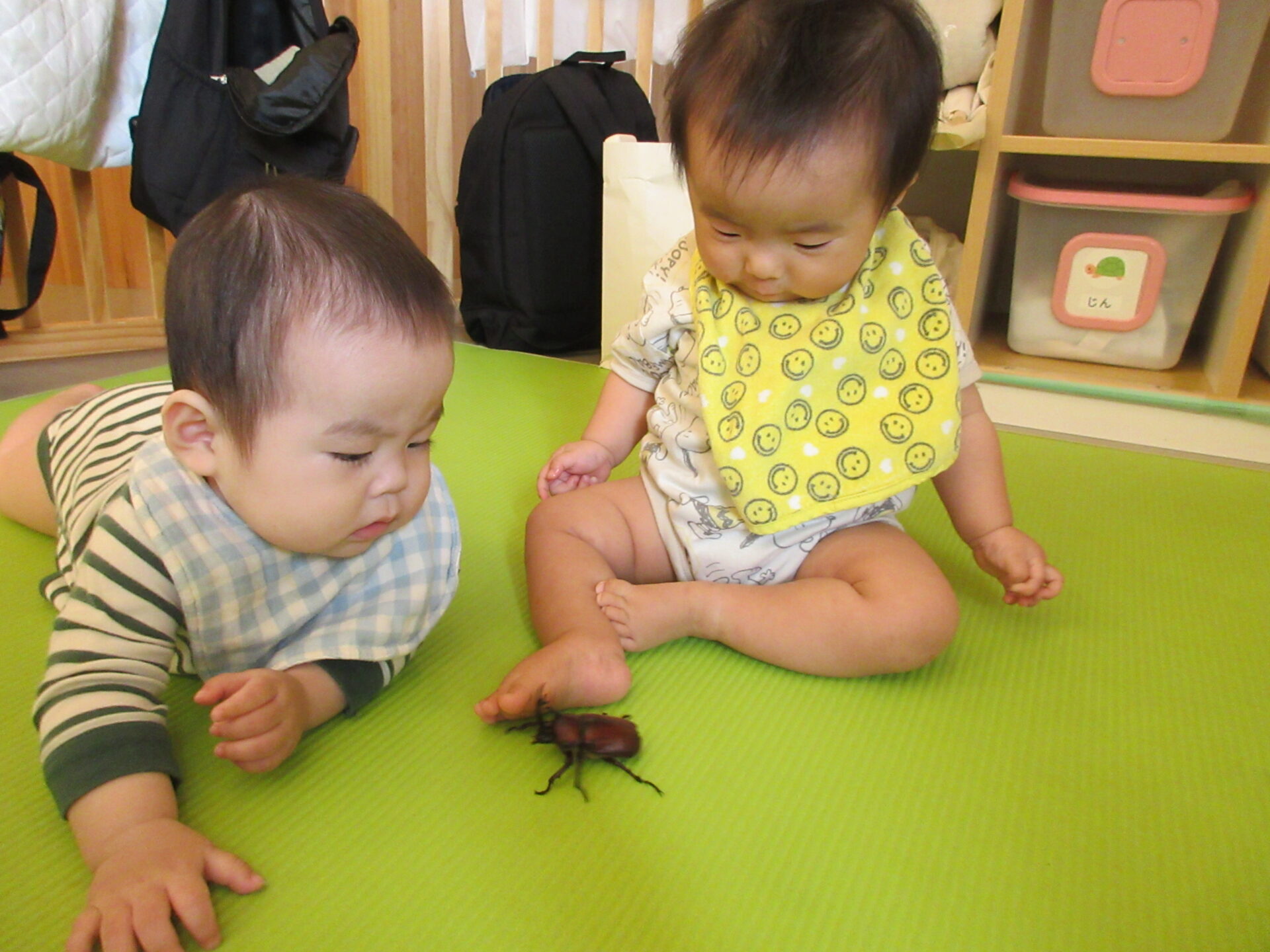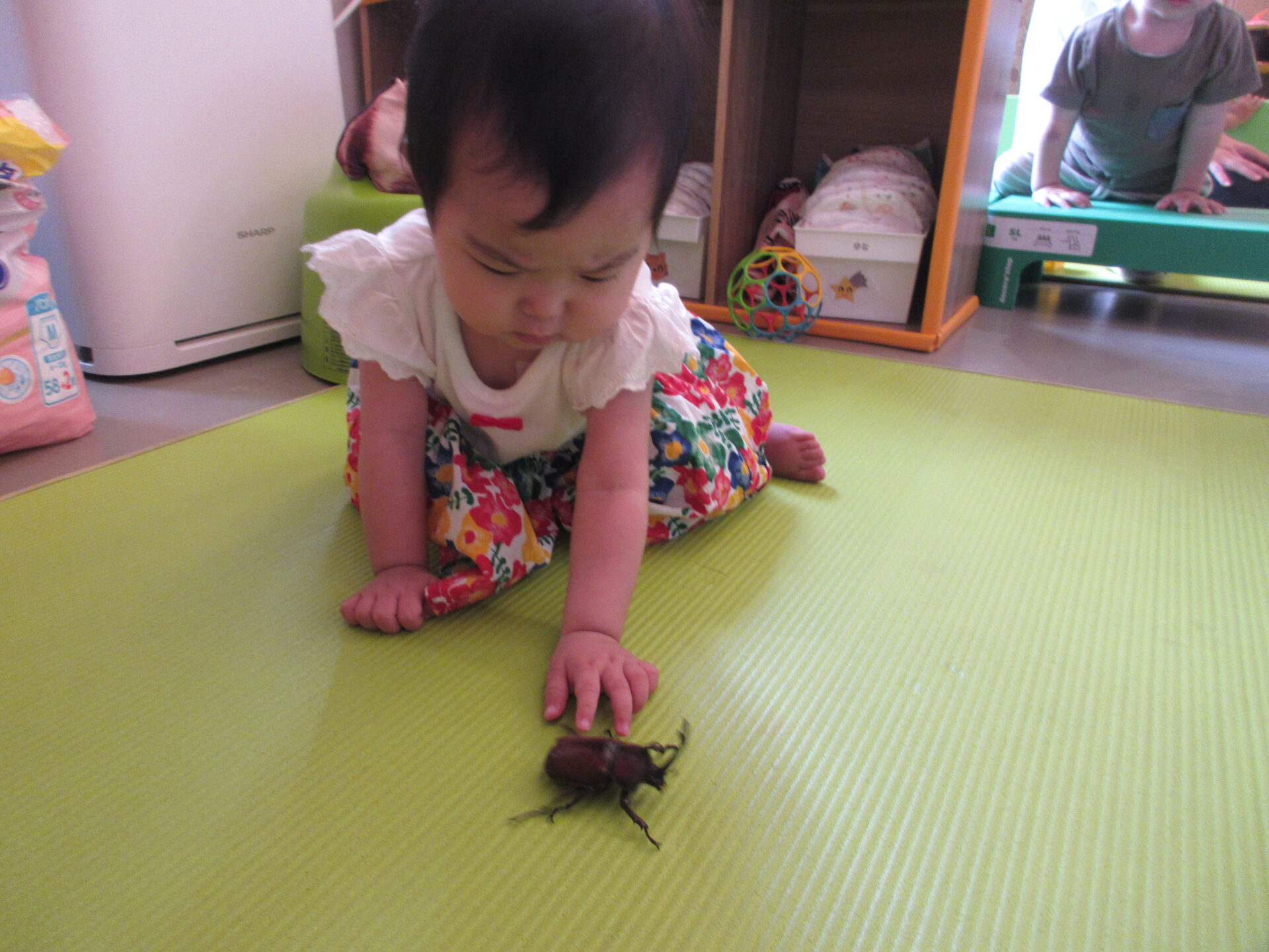 うみ組(0歳児)の子どもたちは、初めてカブト虫と出会いました!