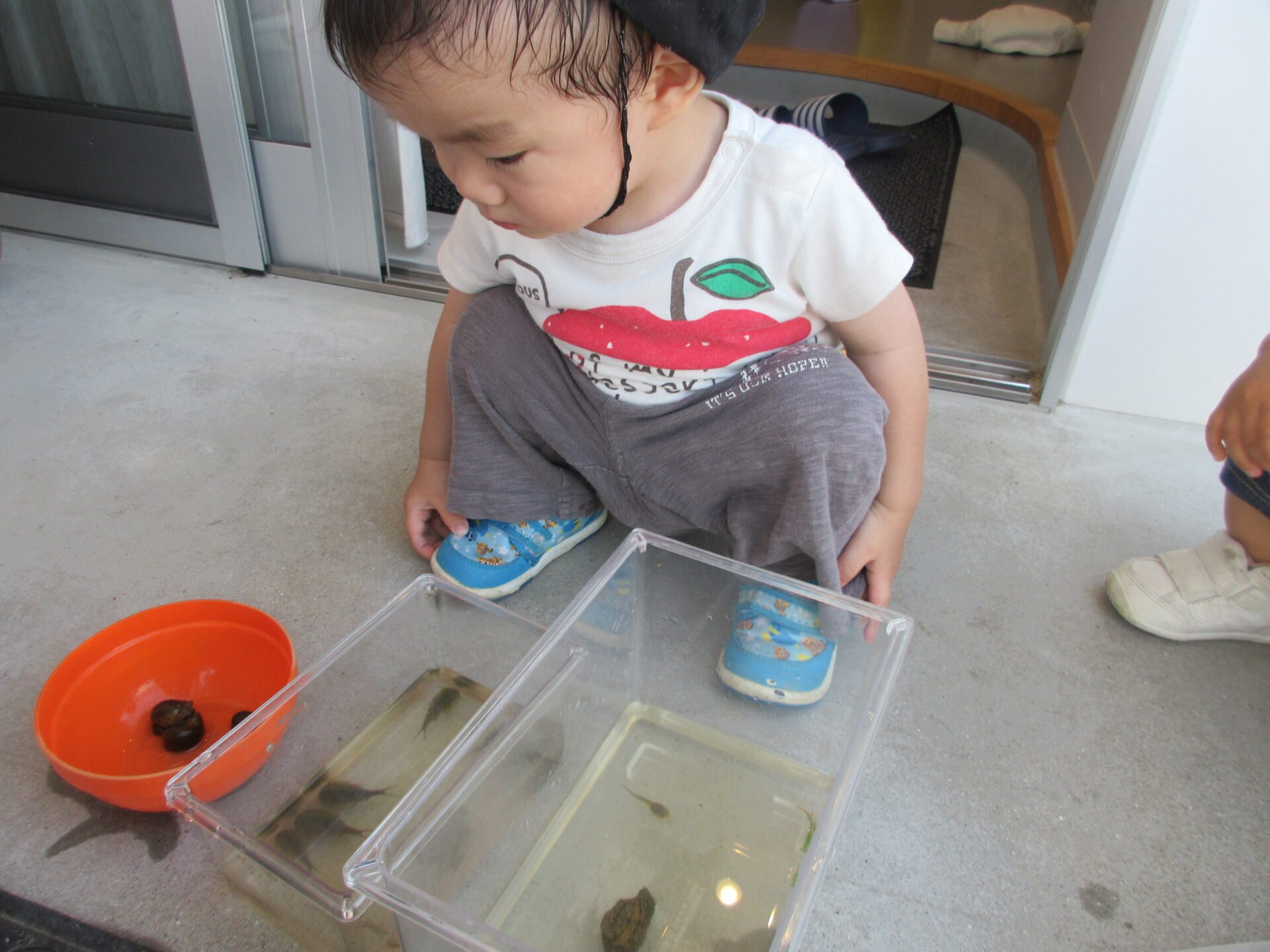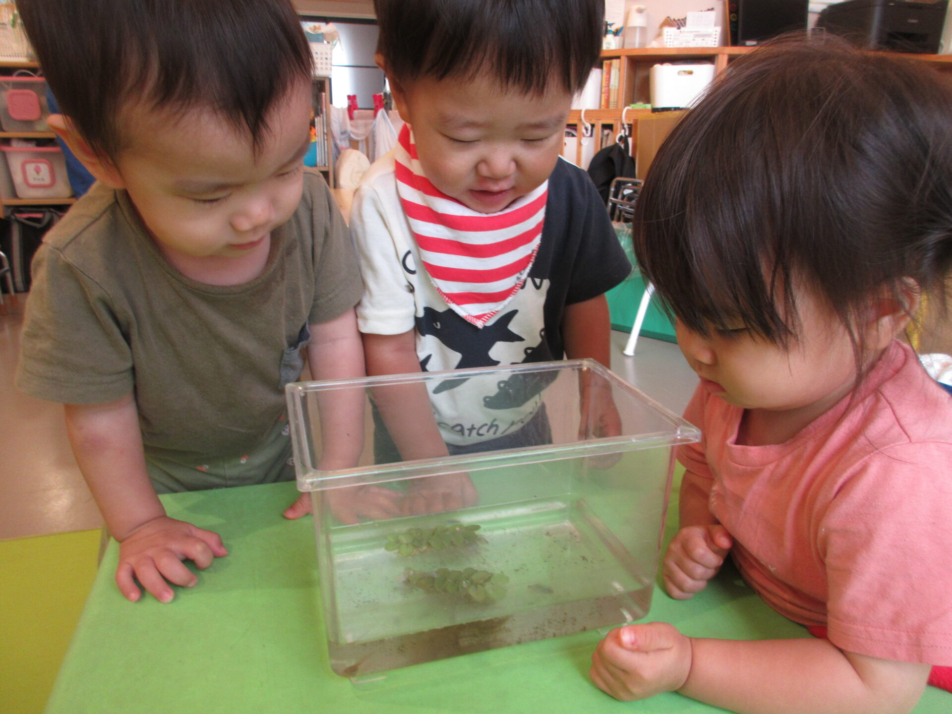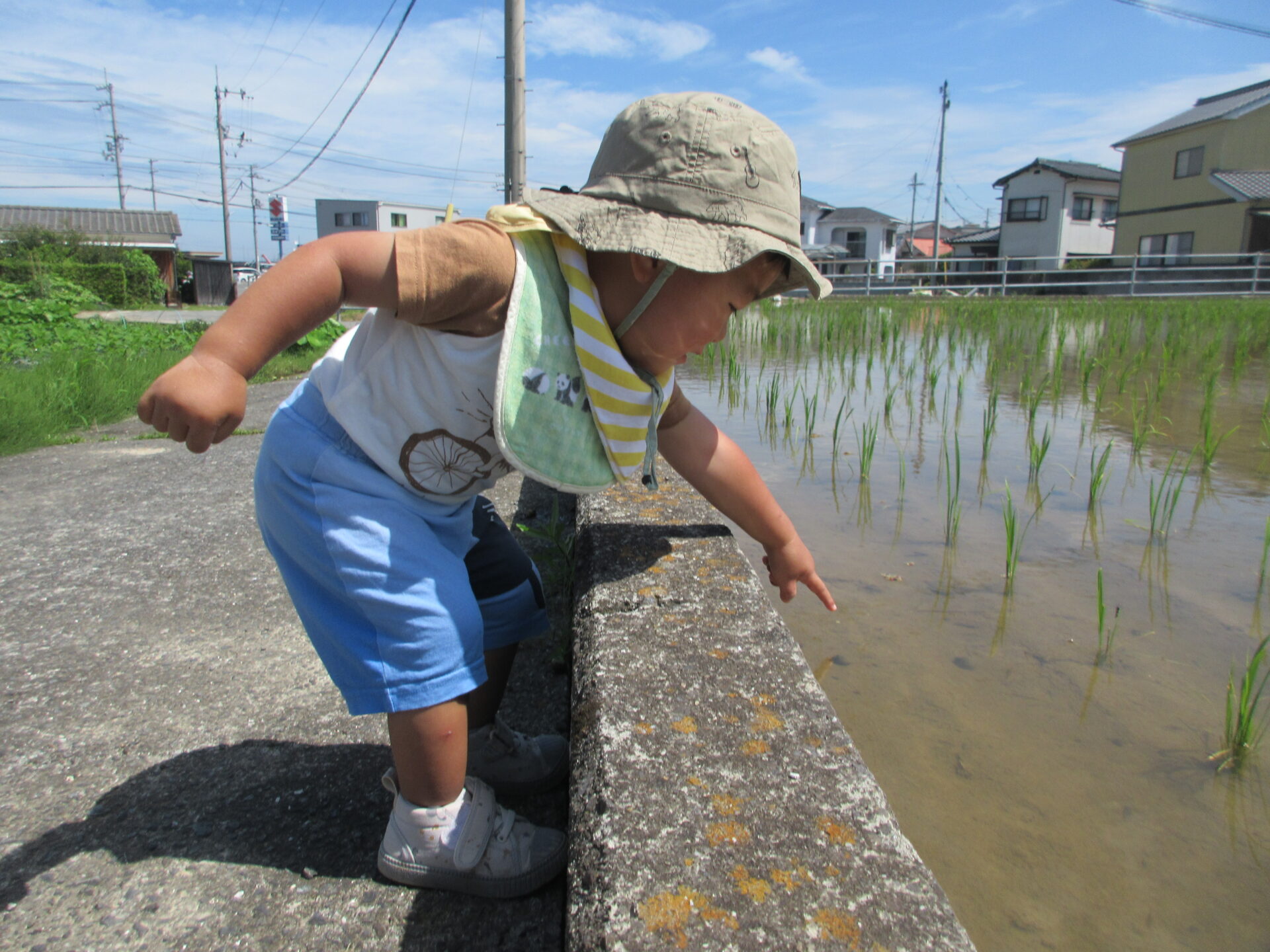 田んぼに行き、泳いでいるのを見つけると、「あっ」と言いながら「見つけたよ」と指さしていました。