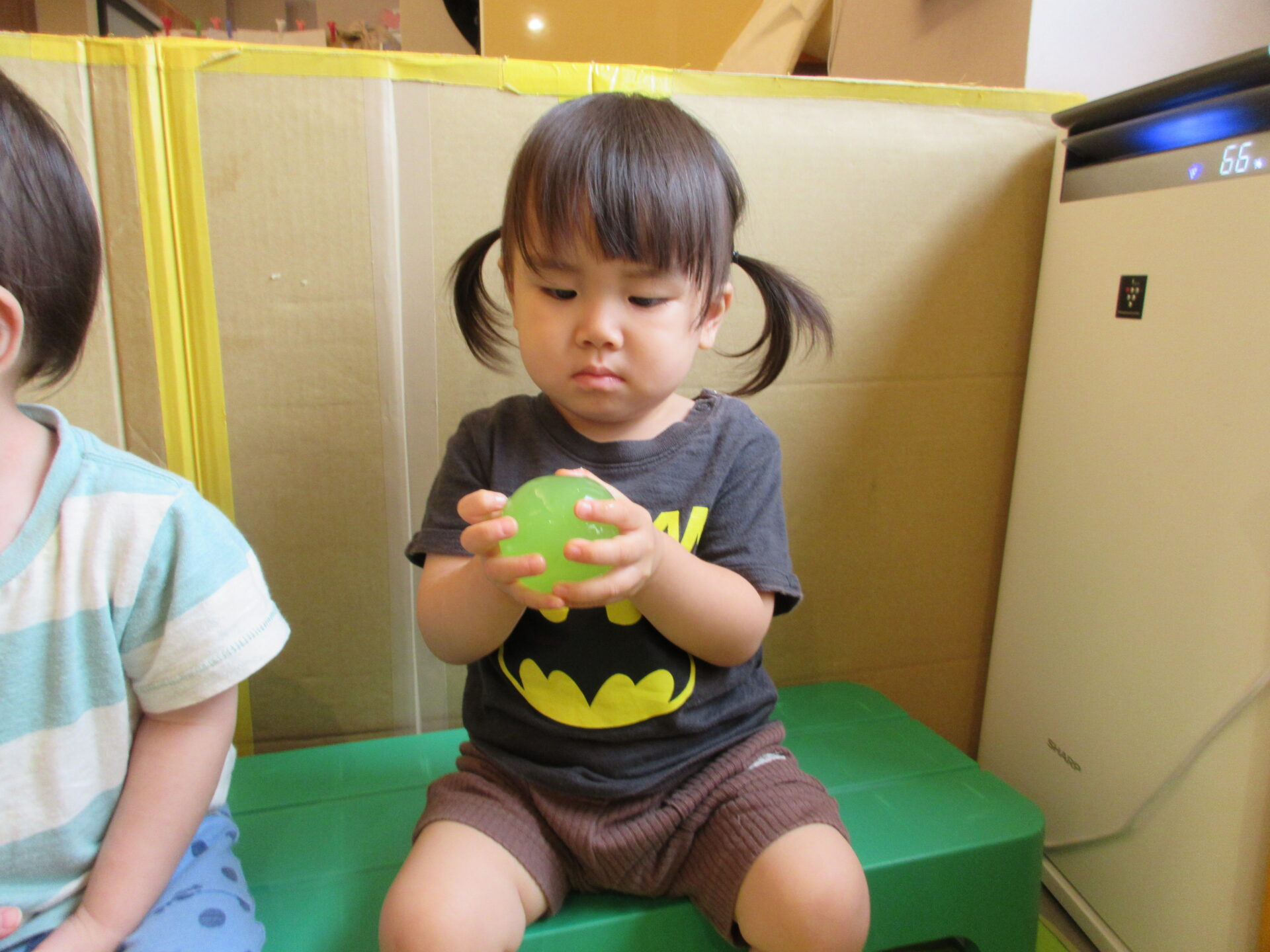 丸い形の寒天ゼリーは、ボールだと思ったのか投げる子もいました。