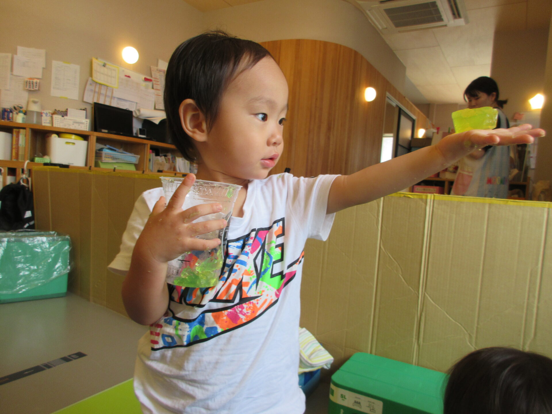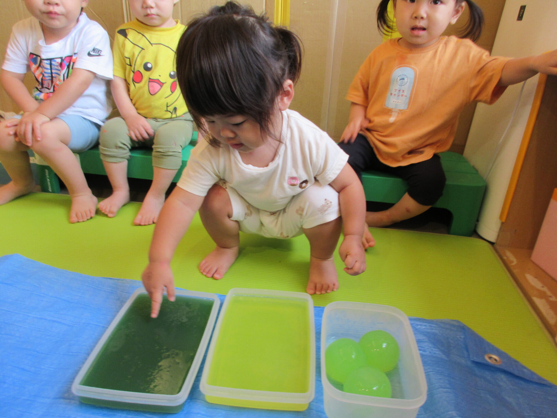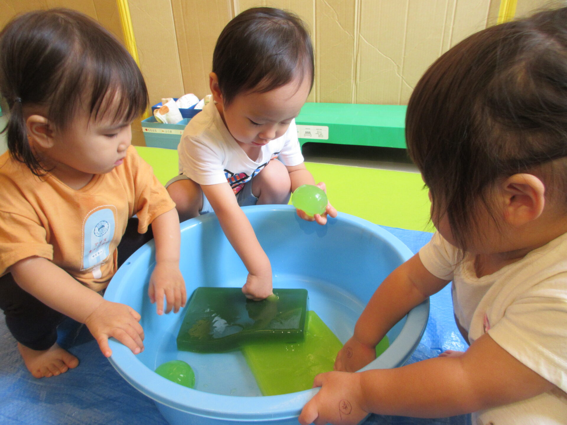 いろんな色や形の寒天を見せ、触ると弾力があり、「うわぁ」と言っていました。