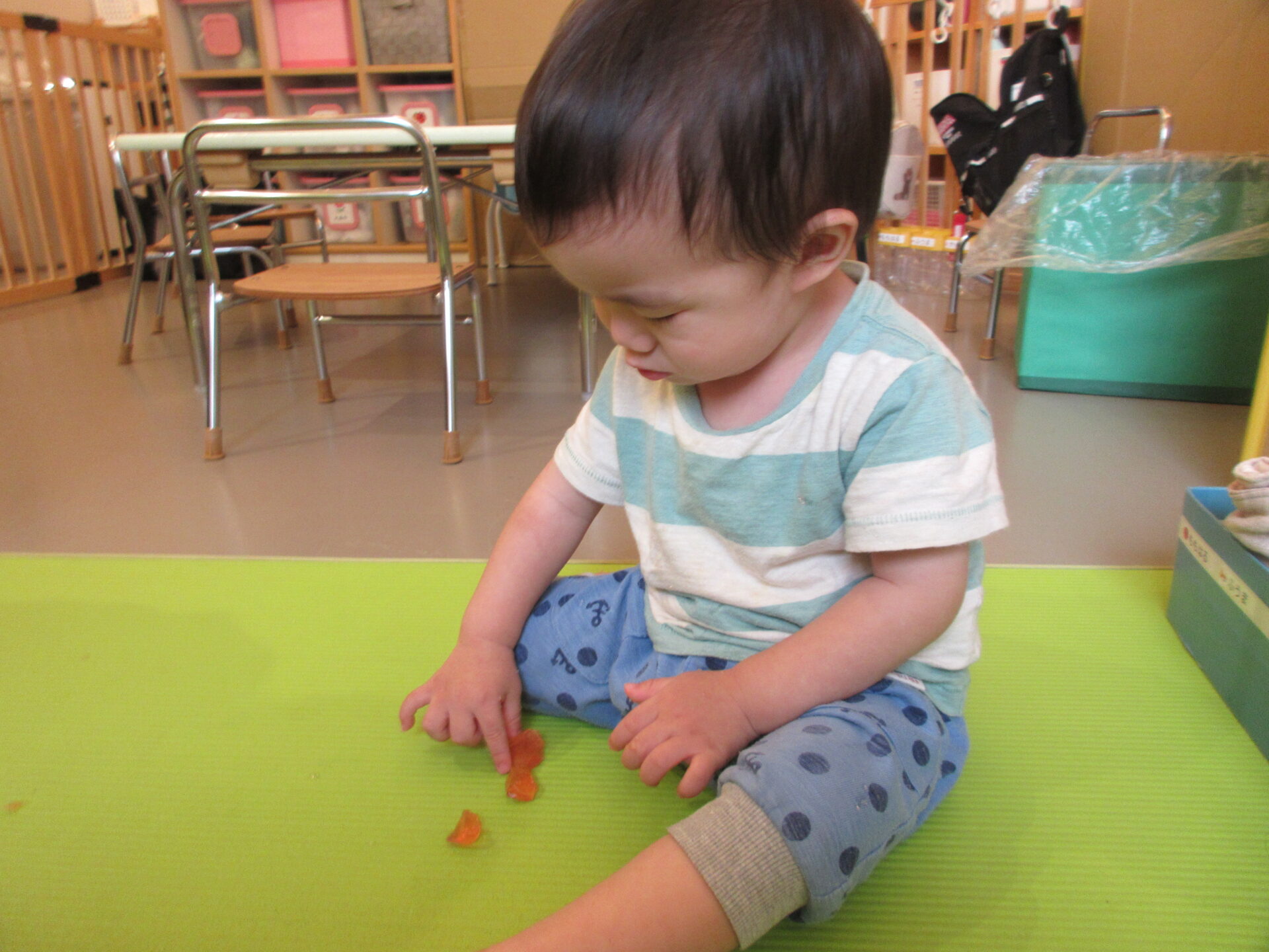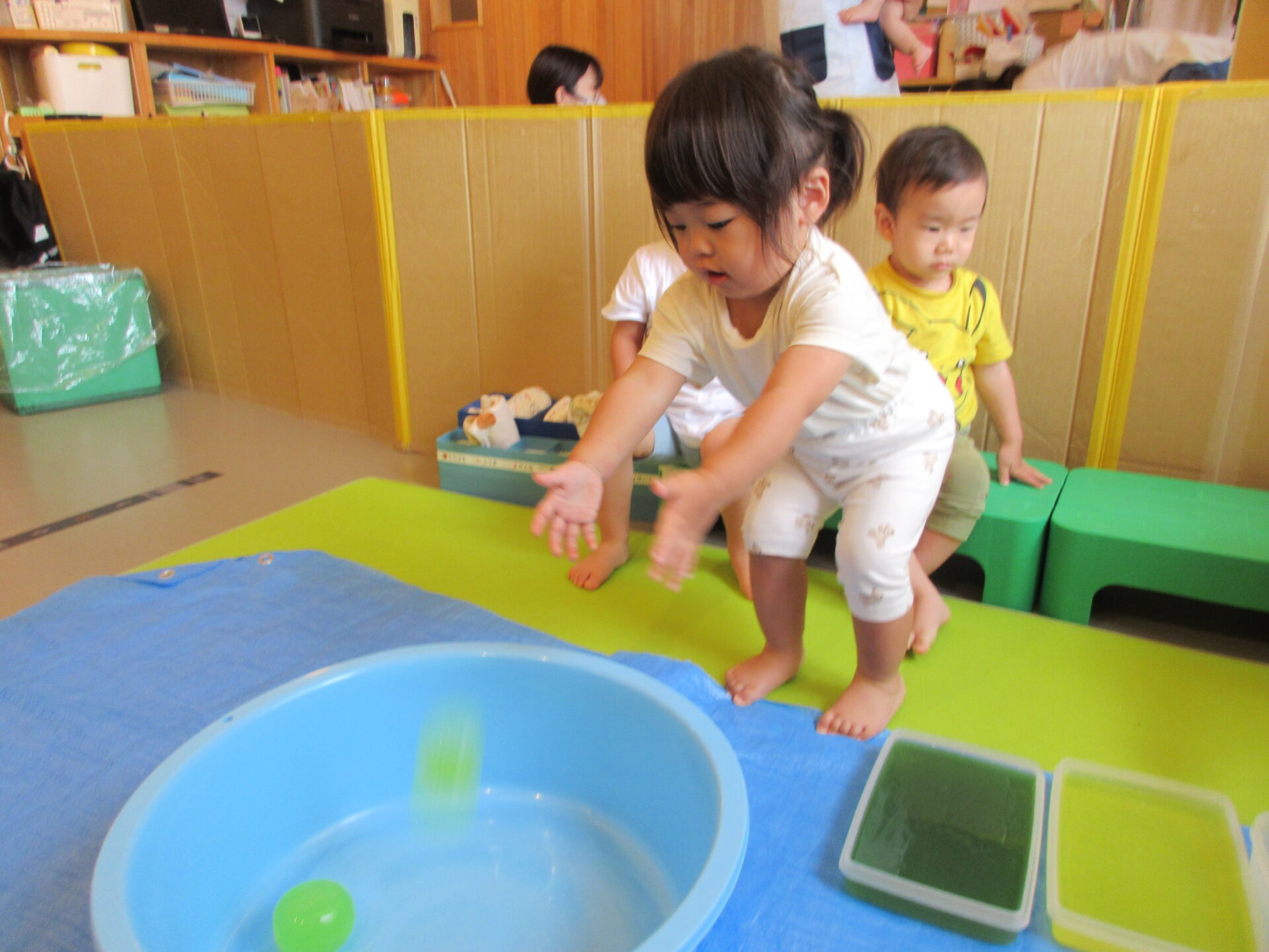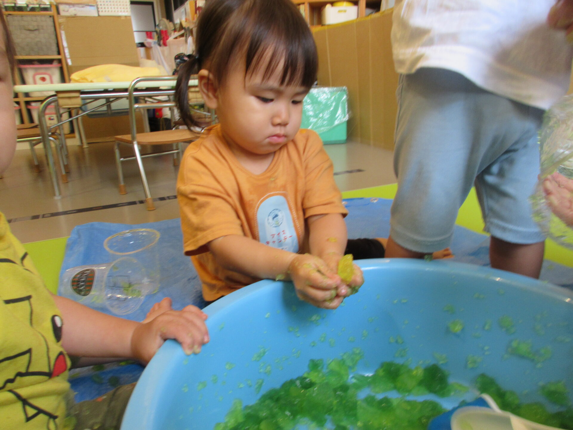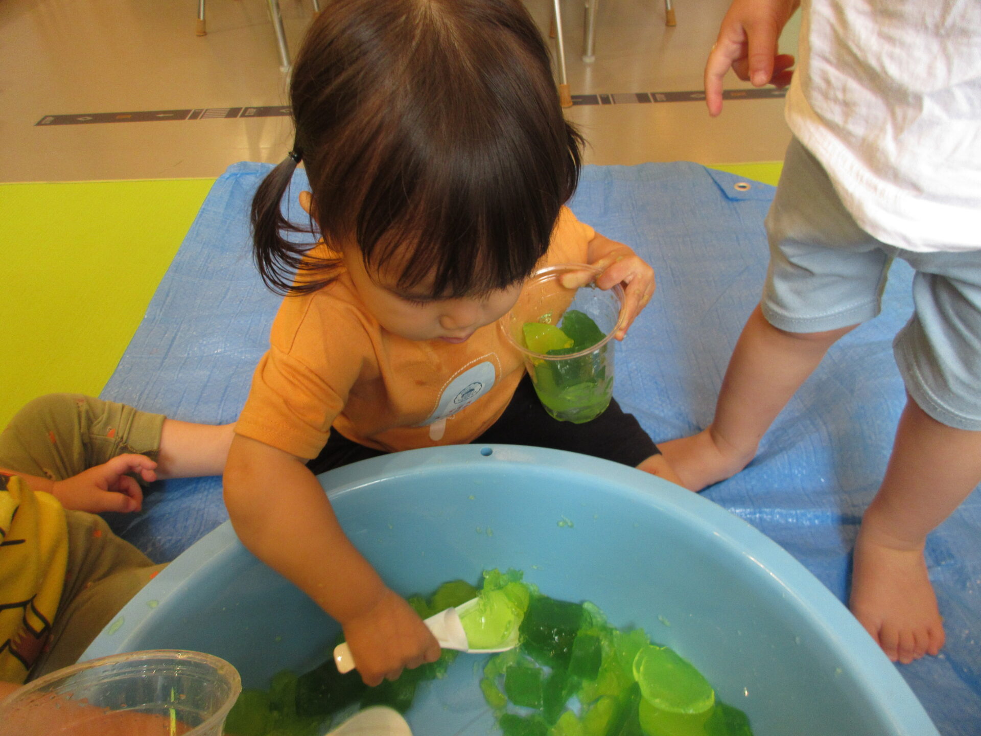 いろんな色や形の寒天を見せ、触ると弾力があり、「うわぁ」と言っていました。