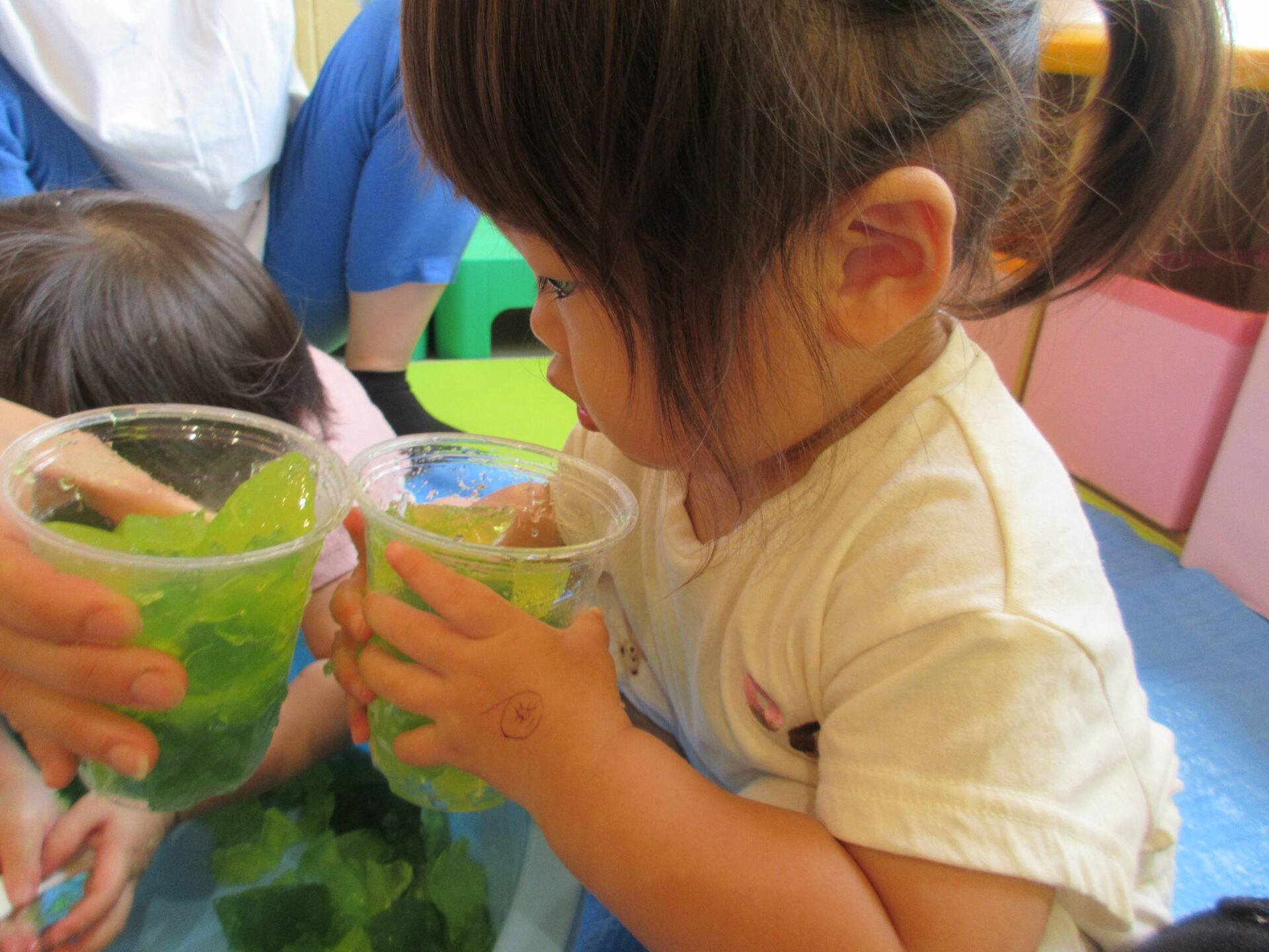 カップを用意すると、寒天ゼリーを入れてジュースに見立てて飲む真似をしたり、光に向けてきれいに輝く様子を見たりしていました。