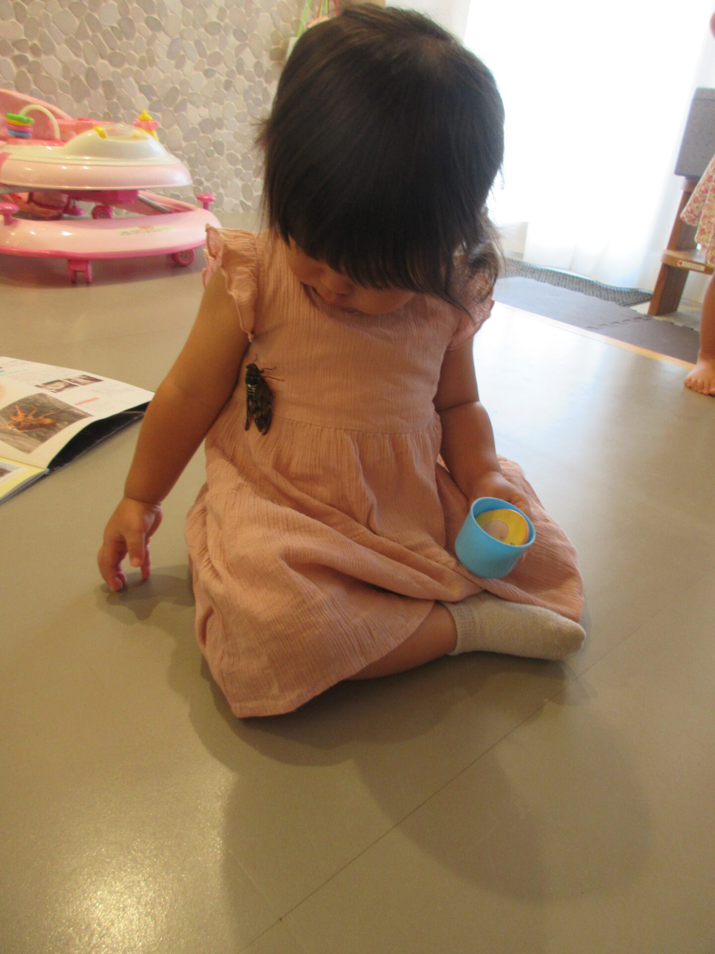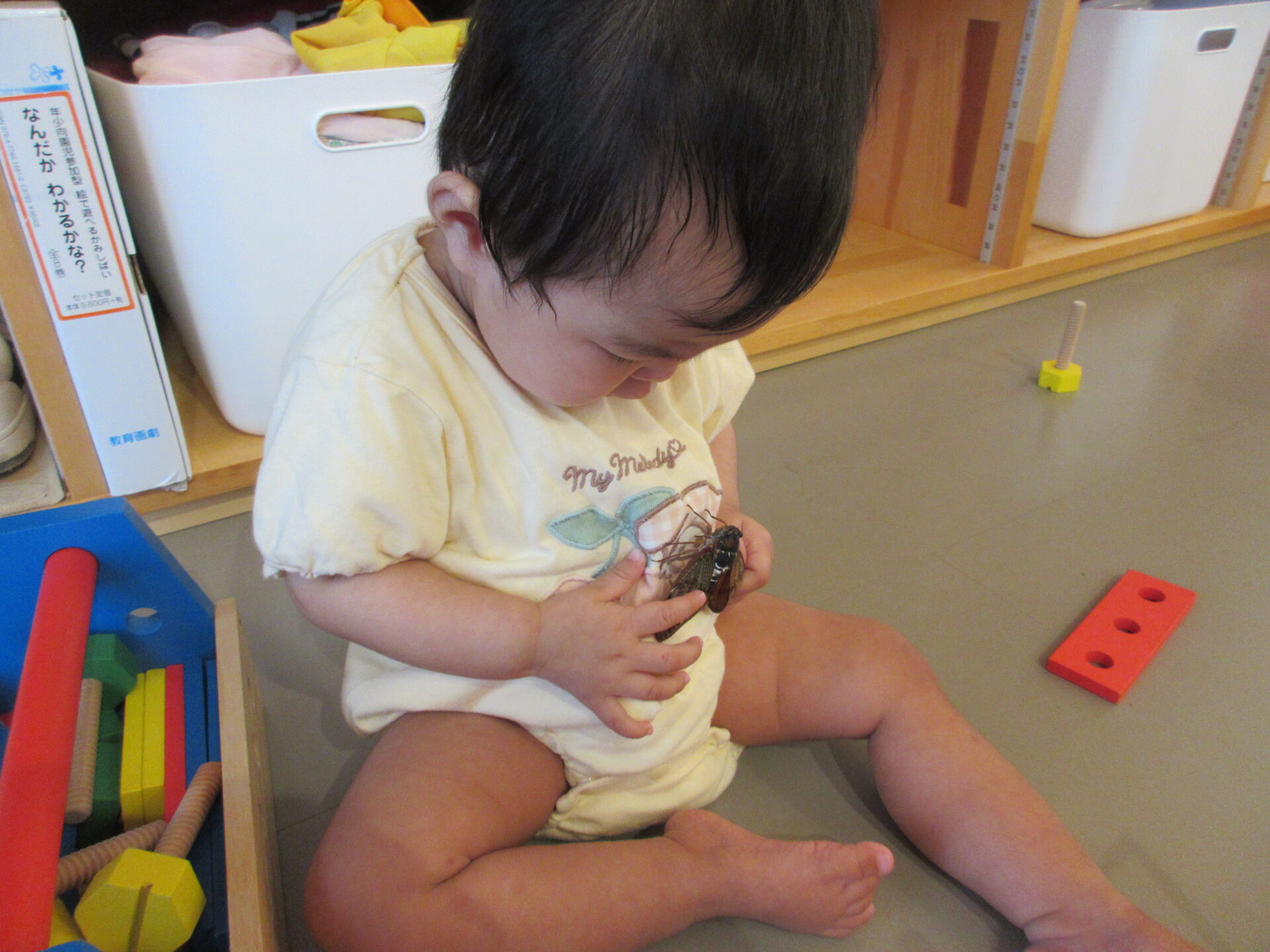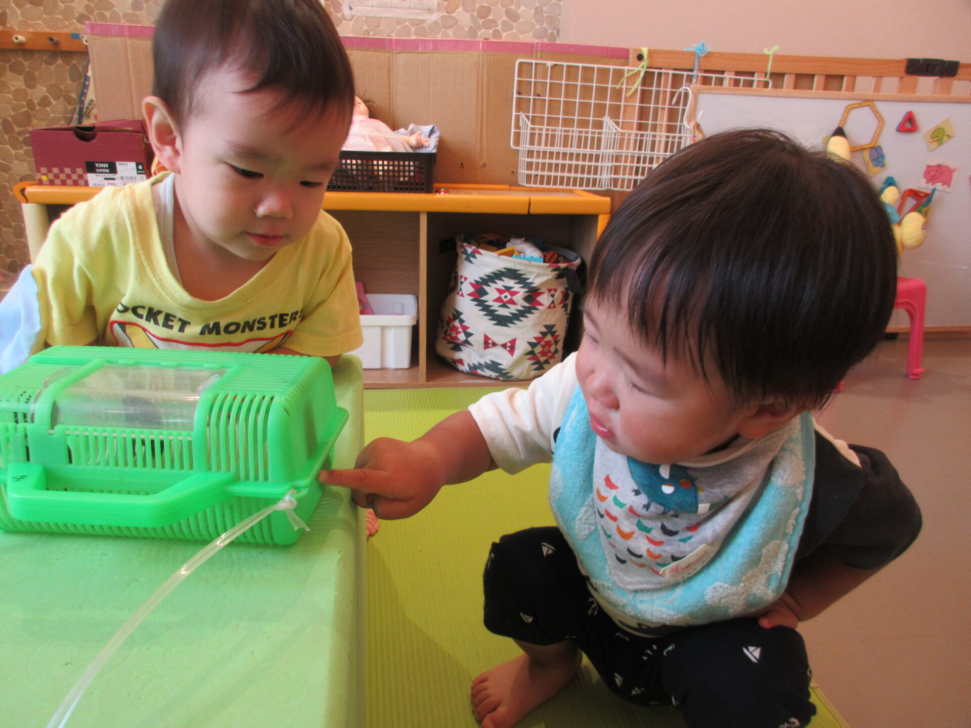 「怖くないよ」と保育士が触って見せると、虫かごの外からセミの足を触っていました。