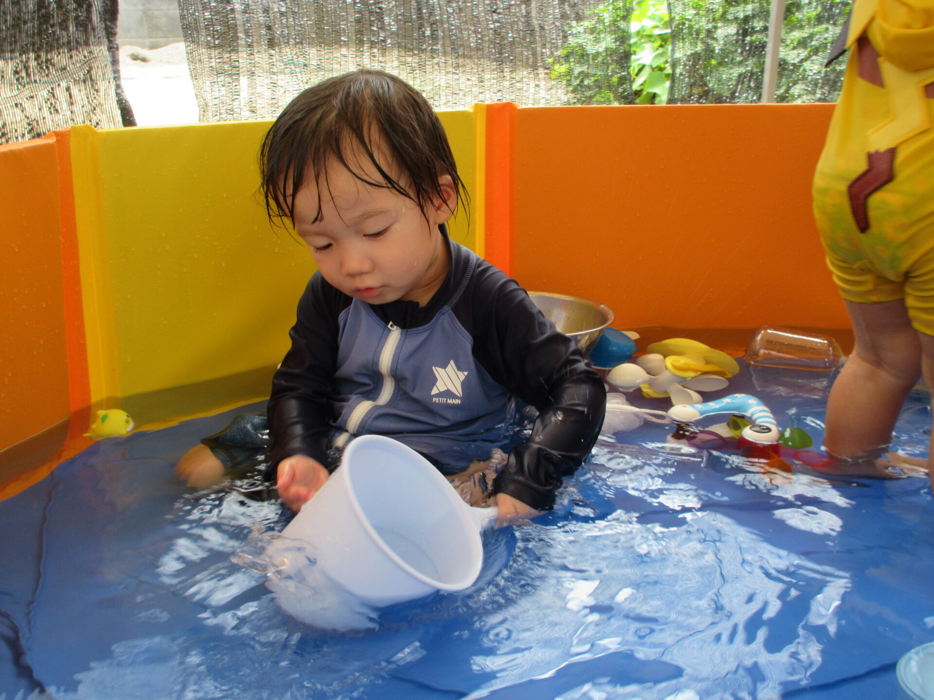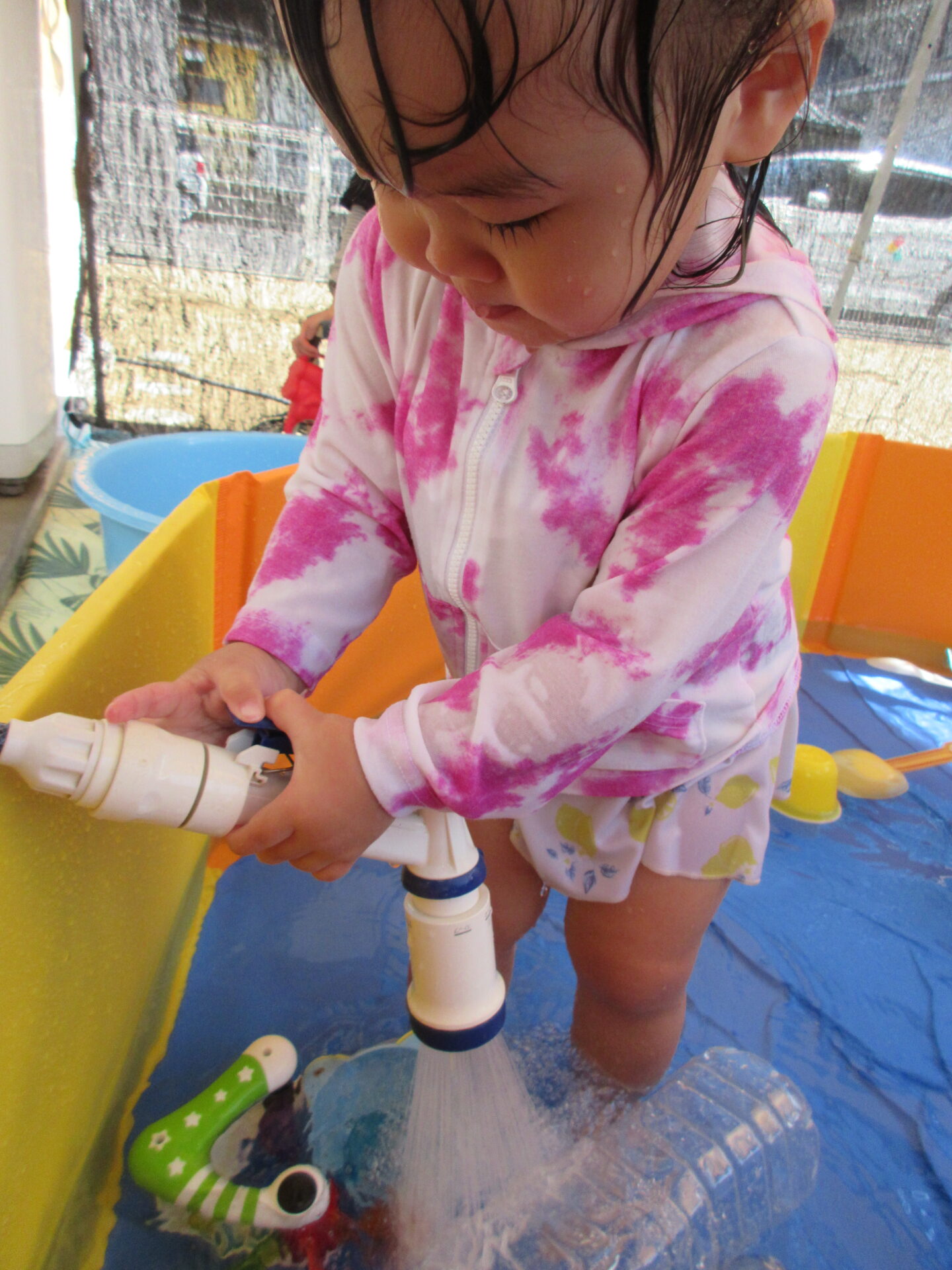 最初は水がかかるのを怖がって、カップに水を入れて遊ぶ所から始まりました。