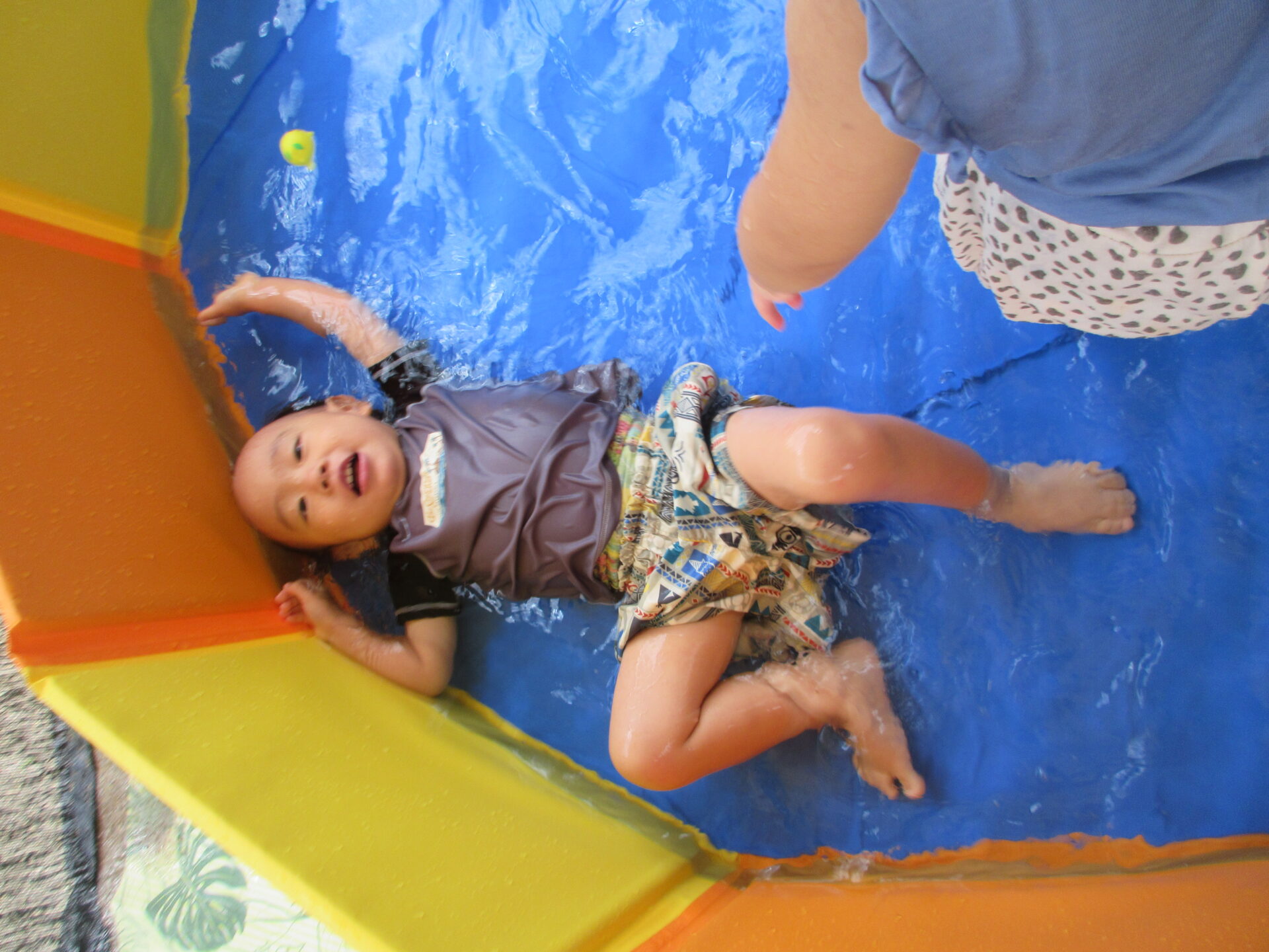 慣れてくるにつれて、大胆になり、ハイハイしたり、泳ぐ真似をしたり、寝転がったりしていました。