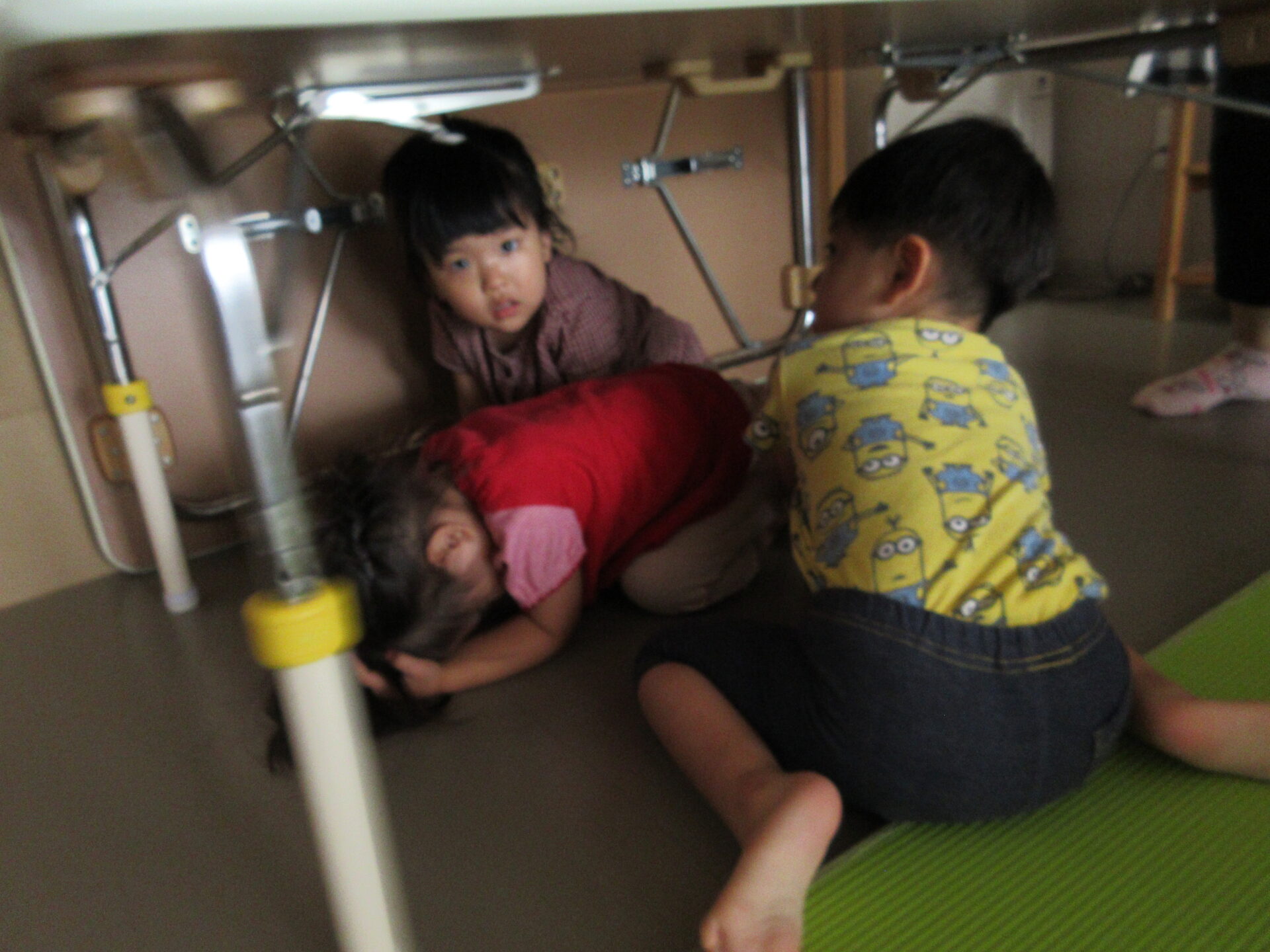 上手に、机の下に避難できています。