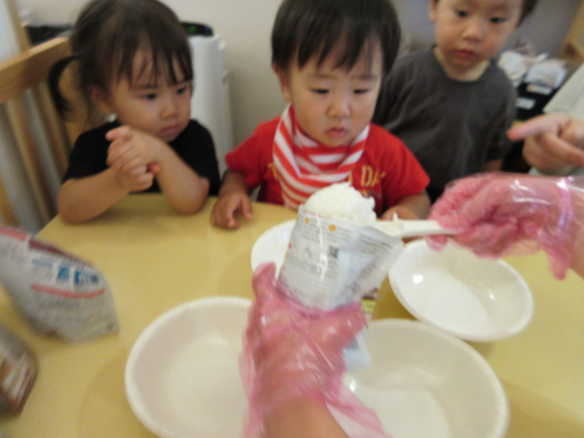 お皿にご飯を取り分ける様子を真剣なまなざしで見つめる子どもたち。