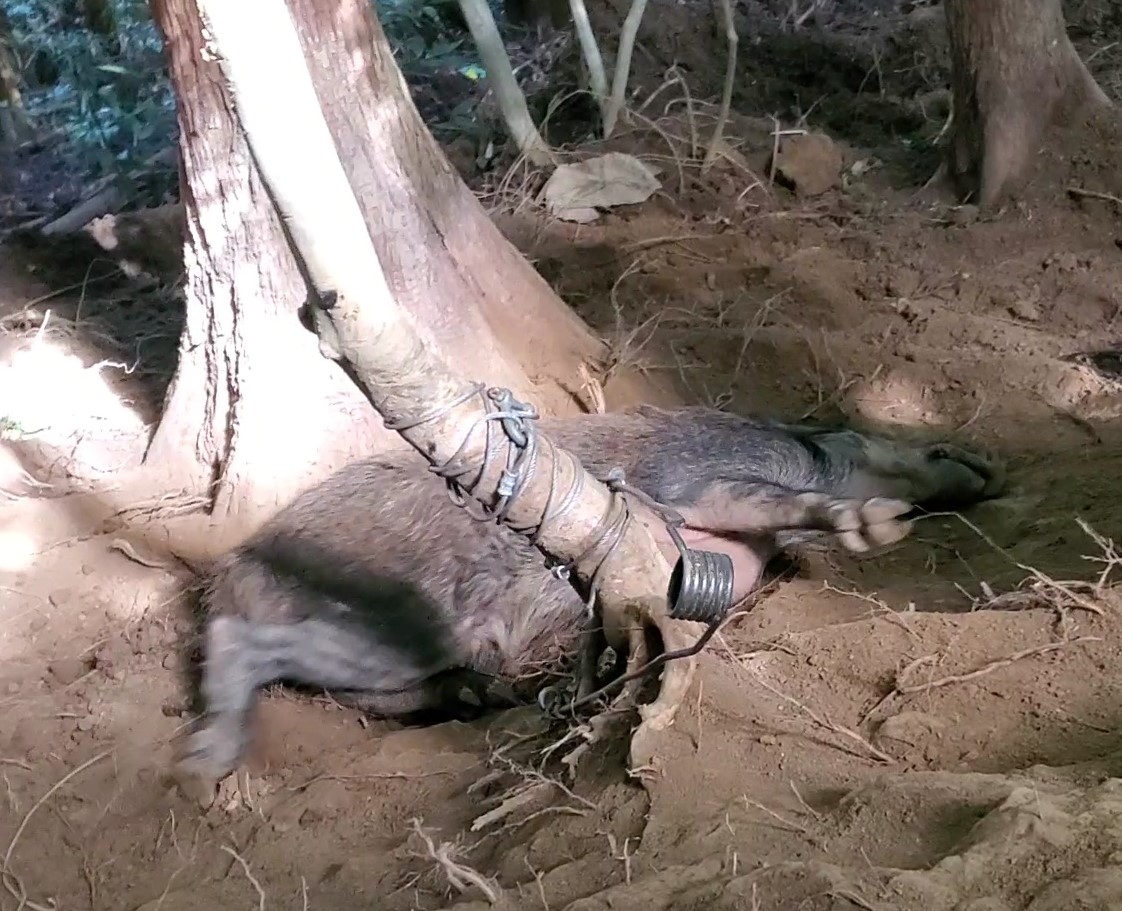 しかし、こちらが思っているほど、簡単に罠にかかってくれるはずもなく、なかなか捕獲出来ないのが現状です。この日も、仕掛けた檻の様子や、餌を見て回っていたところ、たまたま、『ククリ罠』にかかっているイノシシを発見したとのことでした。