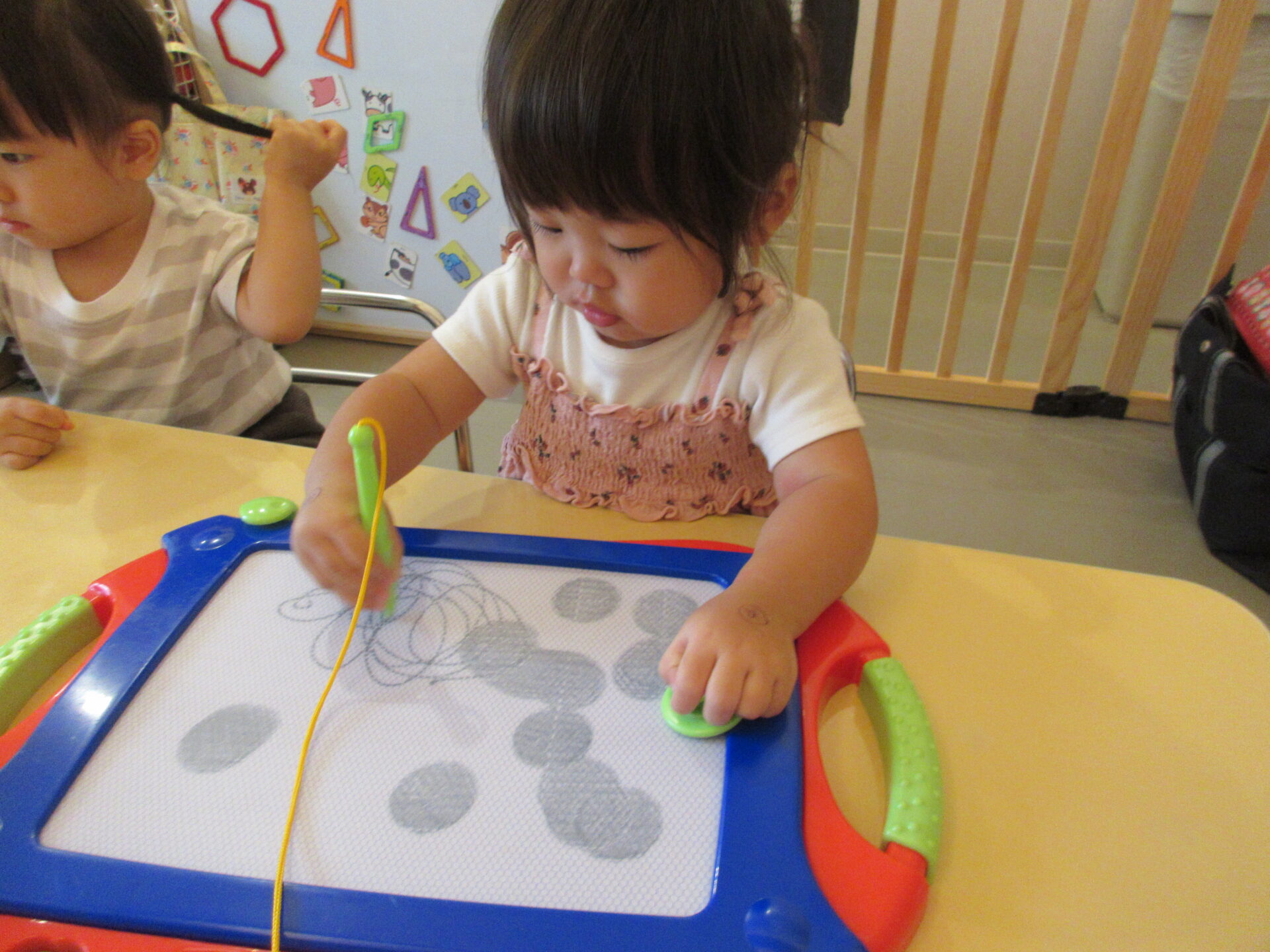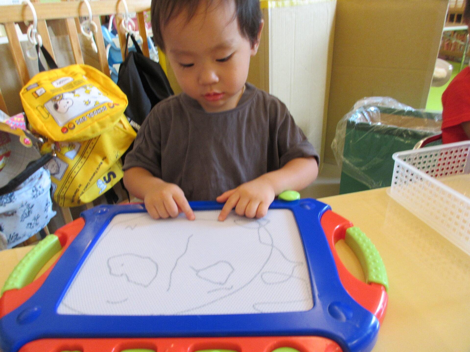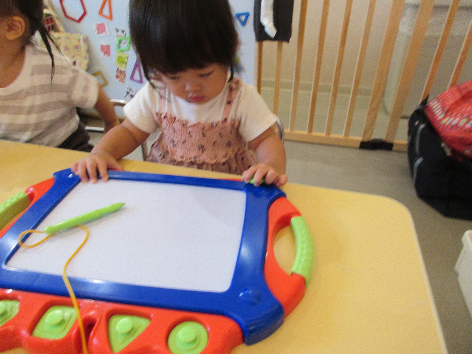 そら組(1歳児)さんは、お絵かきボードを使ってお絵かきをするのが好きです。