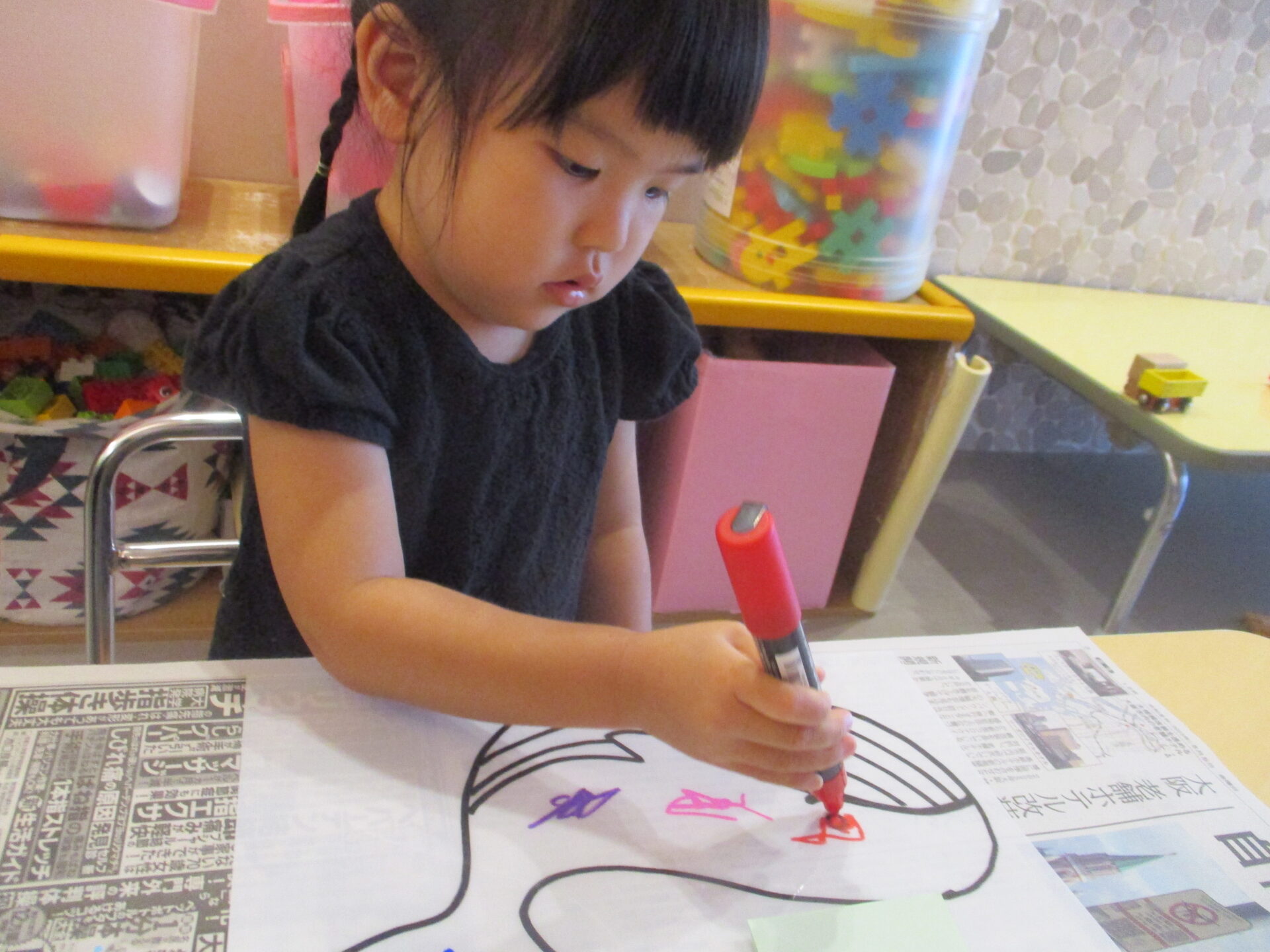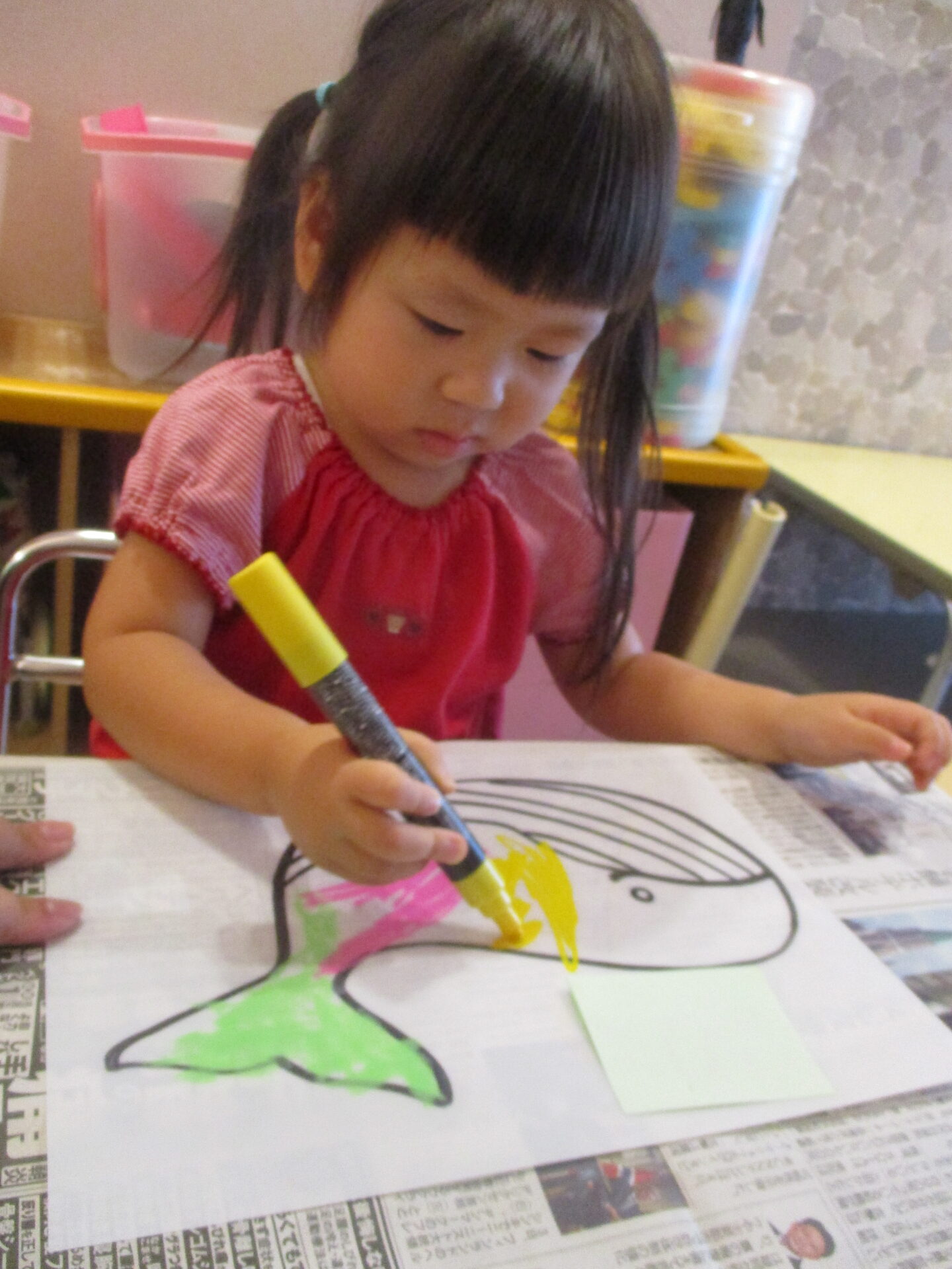 そして、自分が選んだくじらのイラストに、好きな色を使って、塗りました。