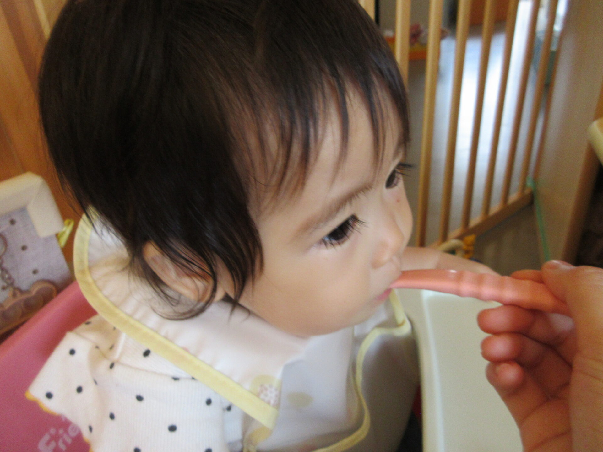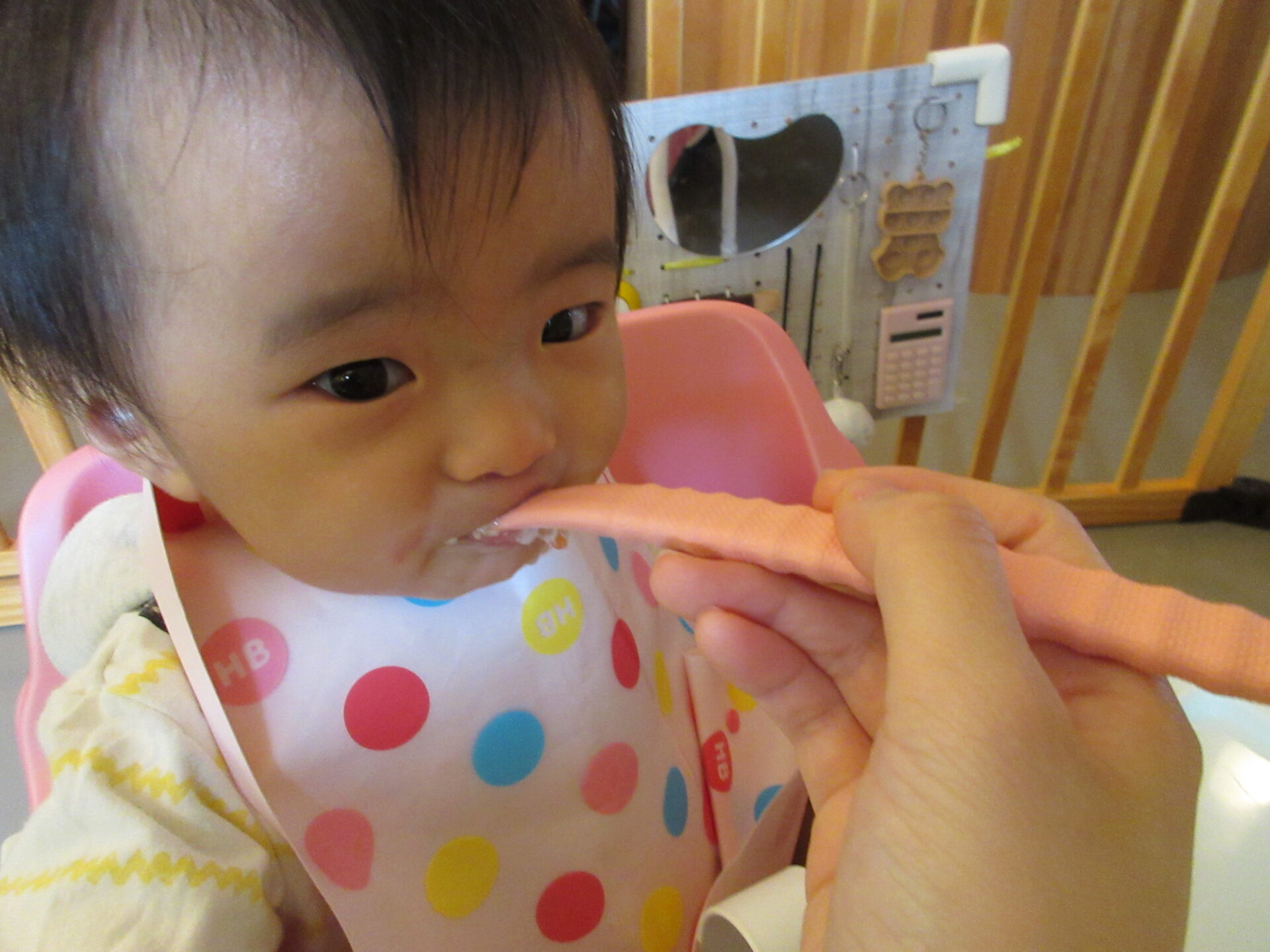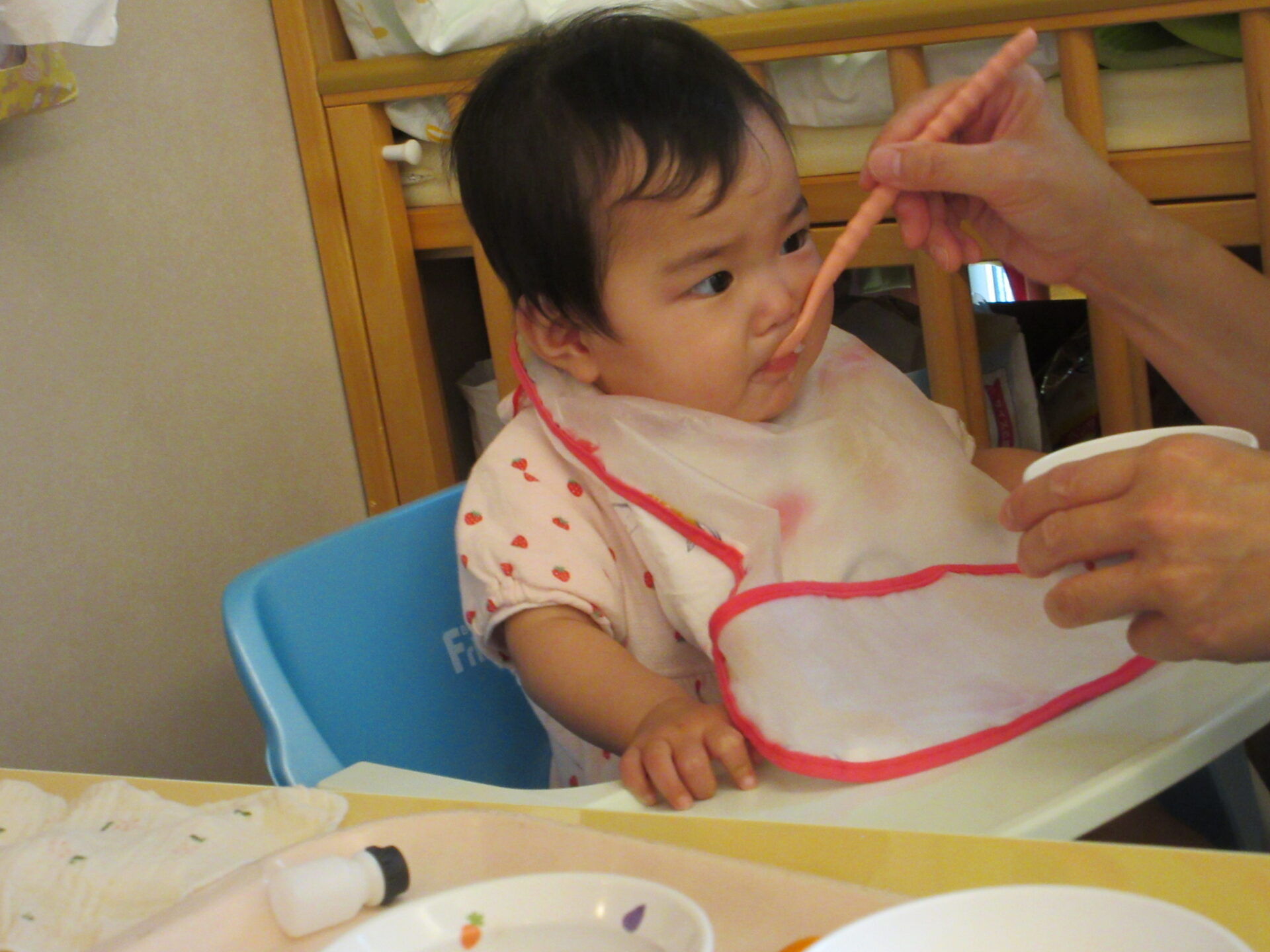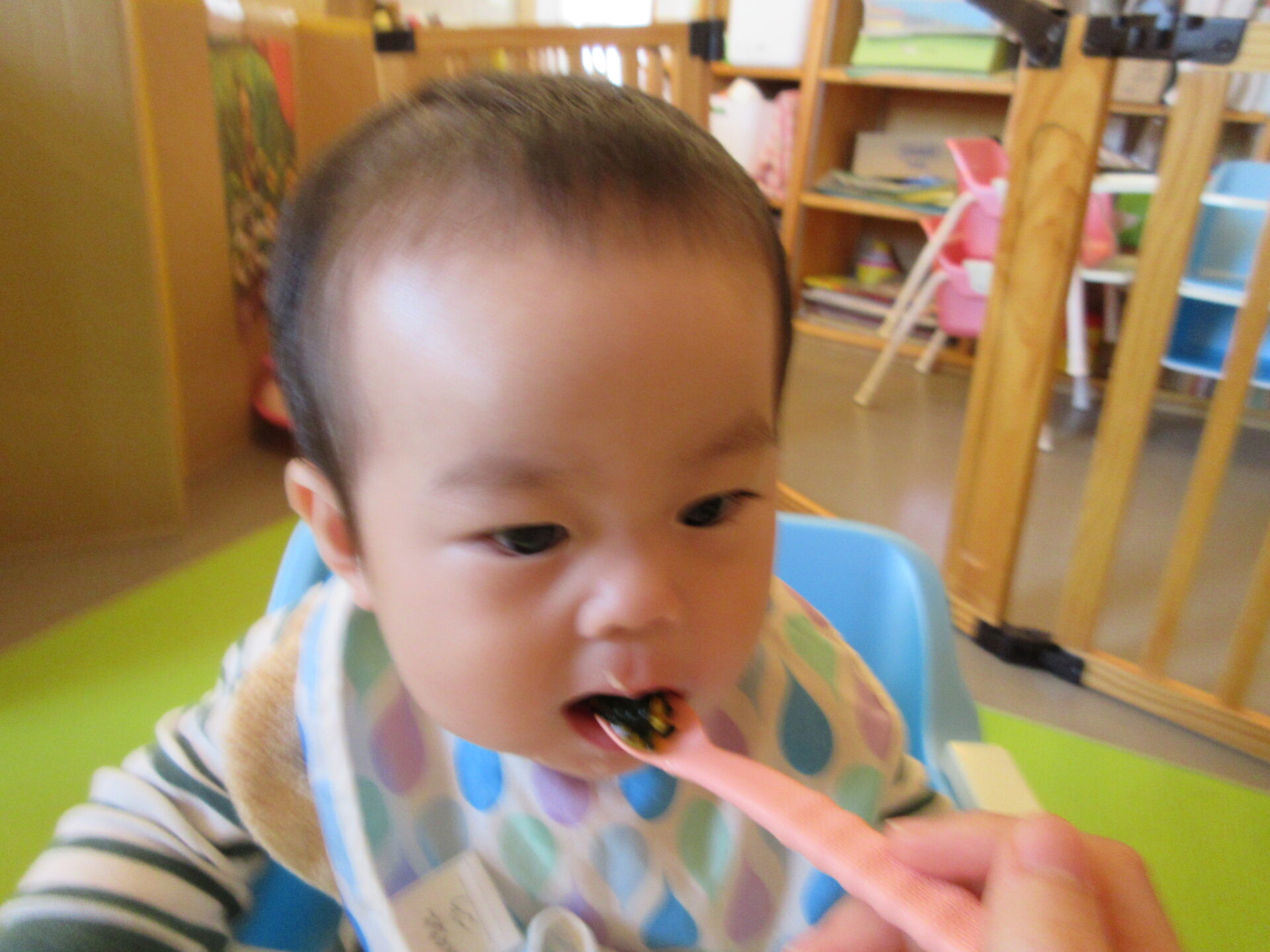 入園当初はミルクだけを飲んでいた0歳児さんですが、離乳食(中期食)が始まり、モグモグゴックンが上達し、たくさんの食材を食べて、現在は、後期食になりました。保育園の給食も、よく食べています。