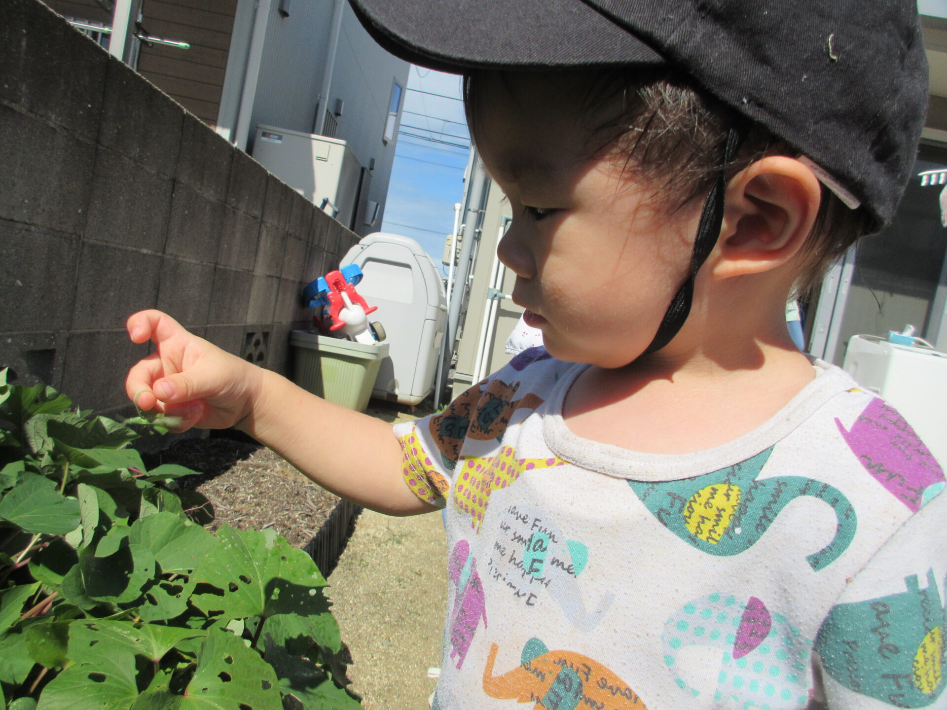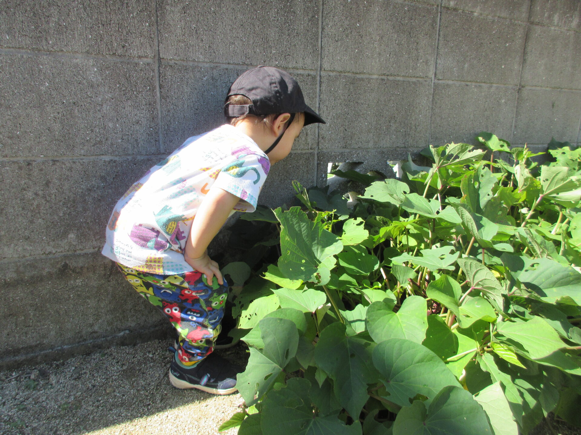 子どもたちもサツマイモ畑にバッタがいるのを知っているので、外に出ると「バッタいるかな?」と葉っぱを覗いて見ています。