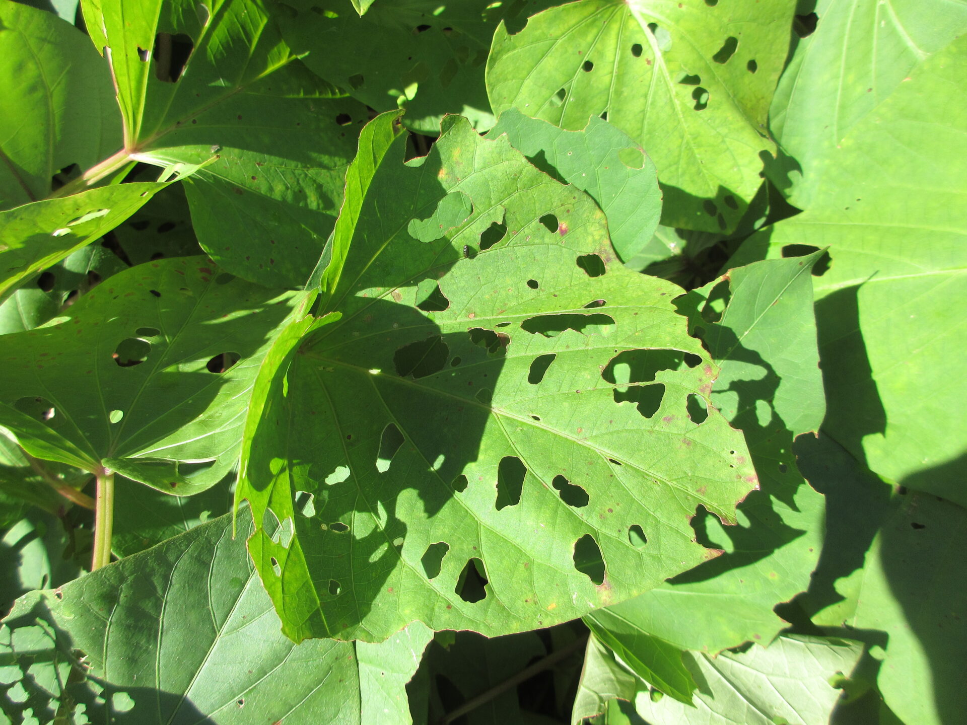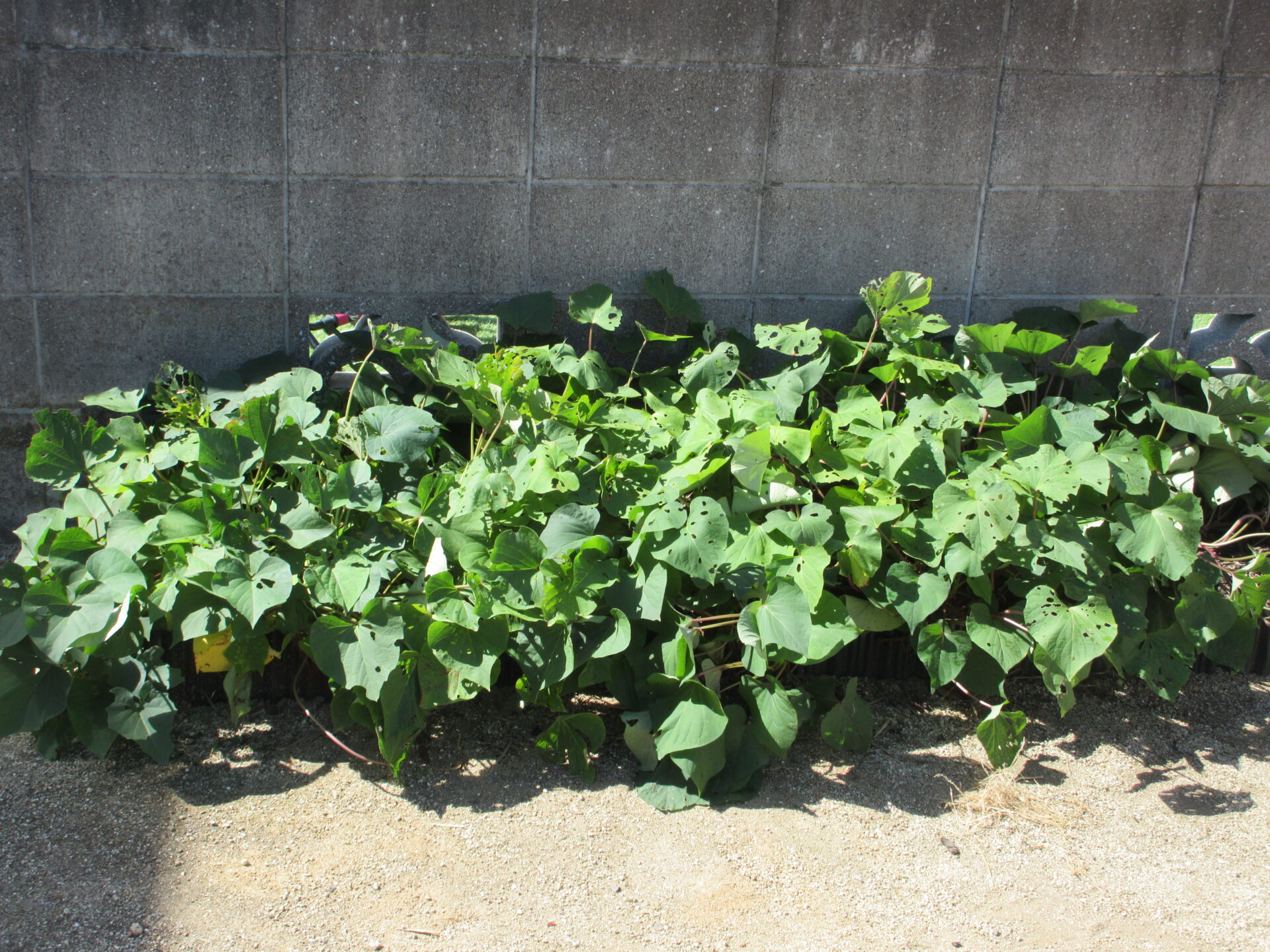 バッタたちもサツマイモの葉っぱが美味しいようでよく食べ、葉っぱは穴だらけです。