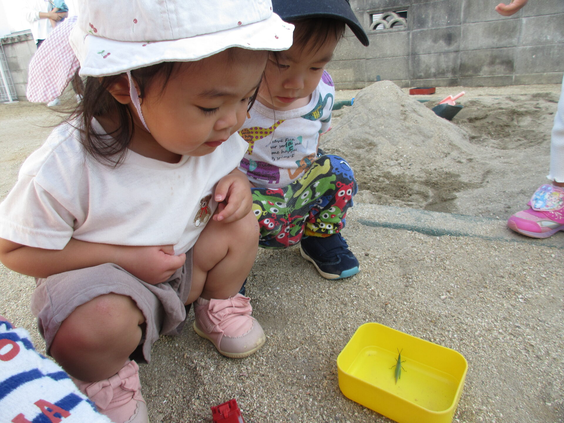 バッタが怖い子は、遠くから眺めています。