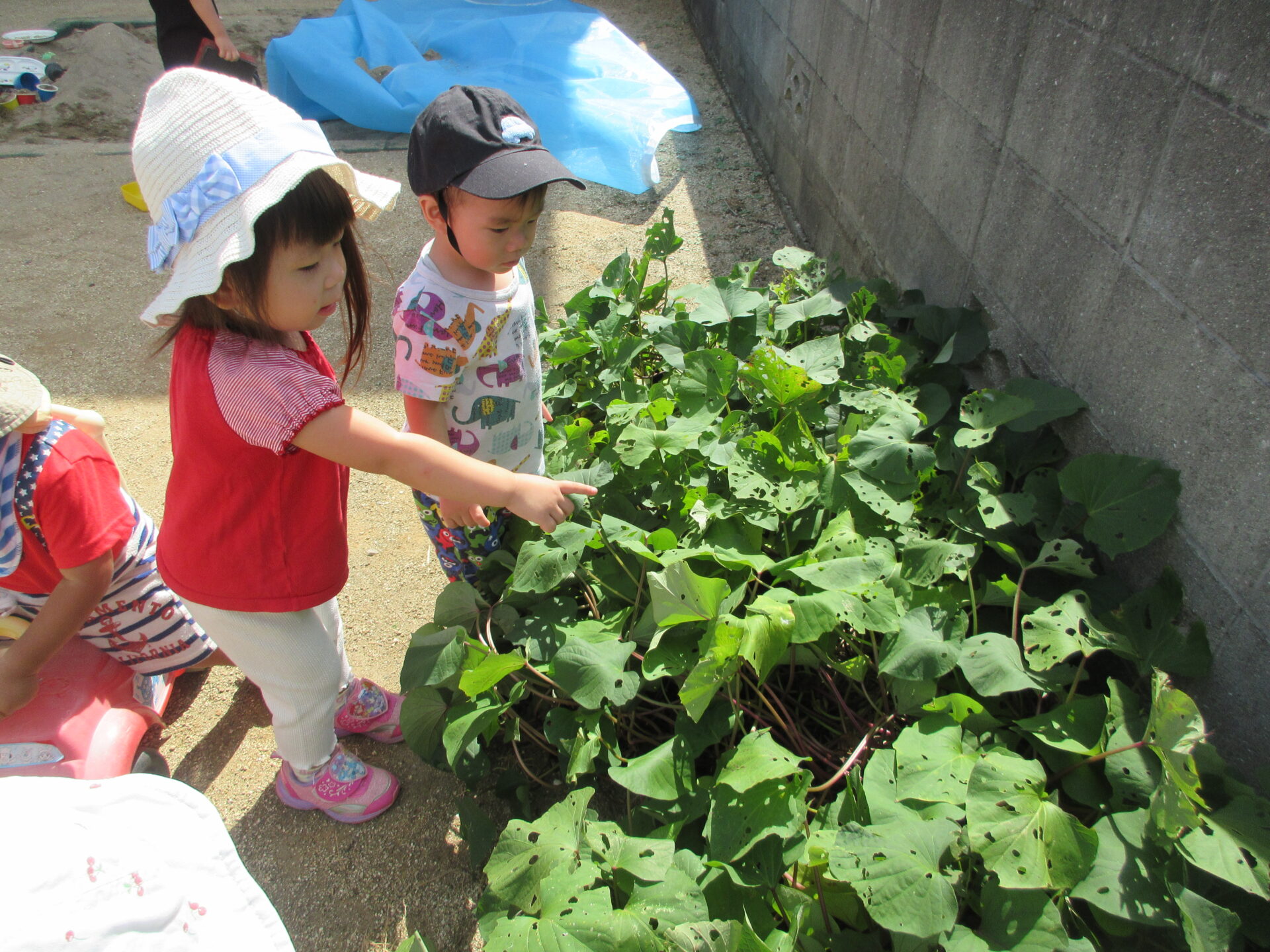 保育園の畑に植えたサツマイモが成長し、葉っぱが青々と茂っています。