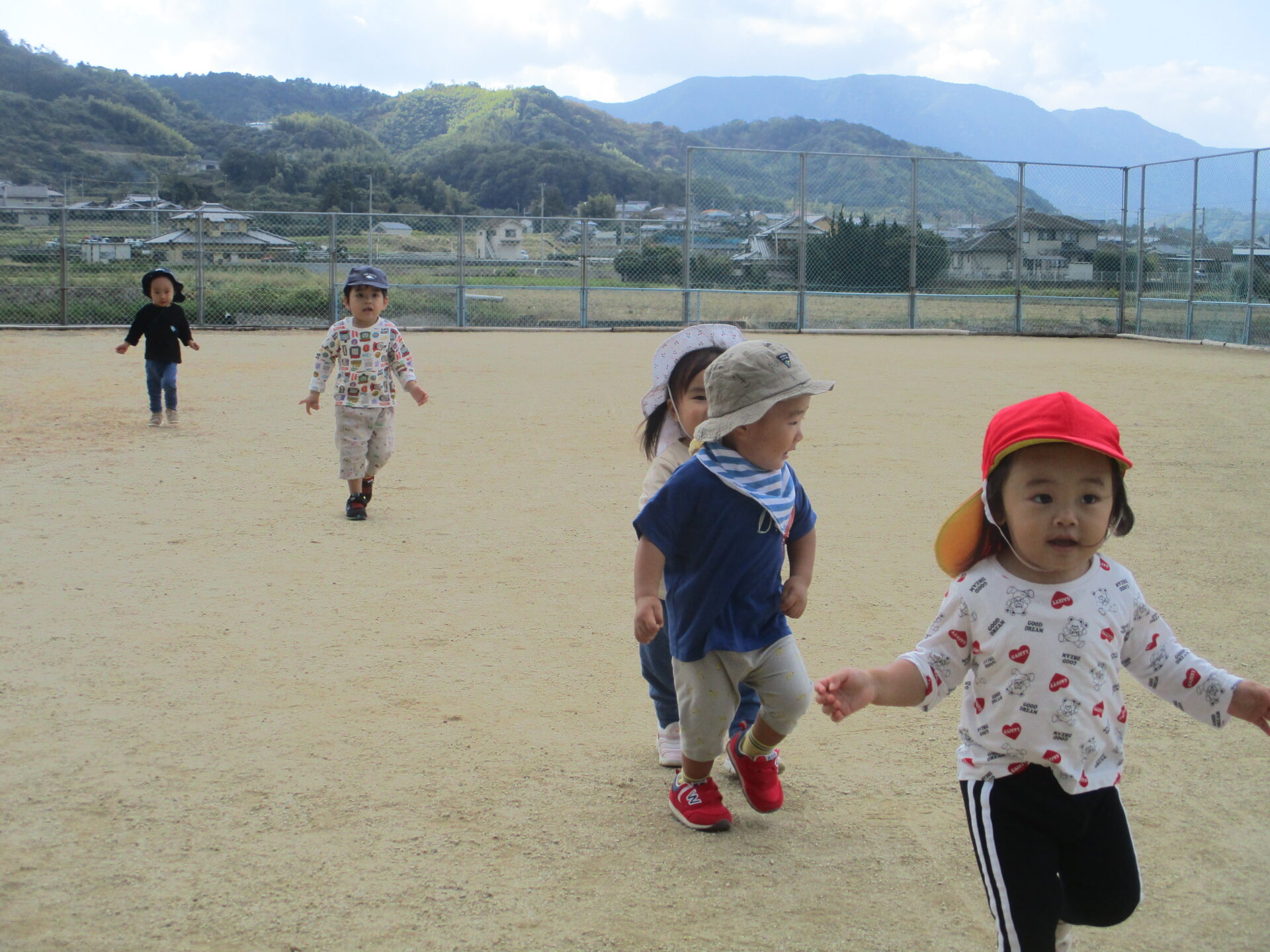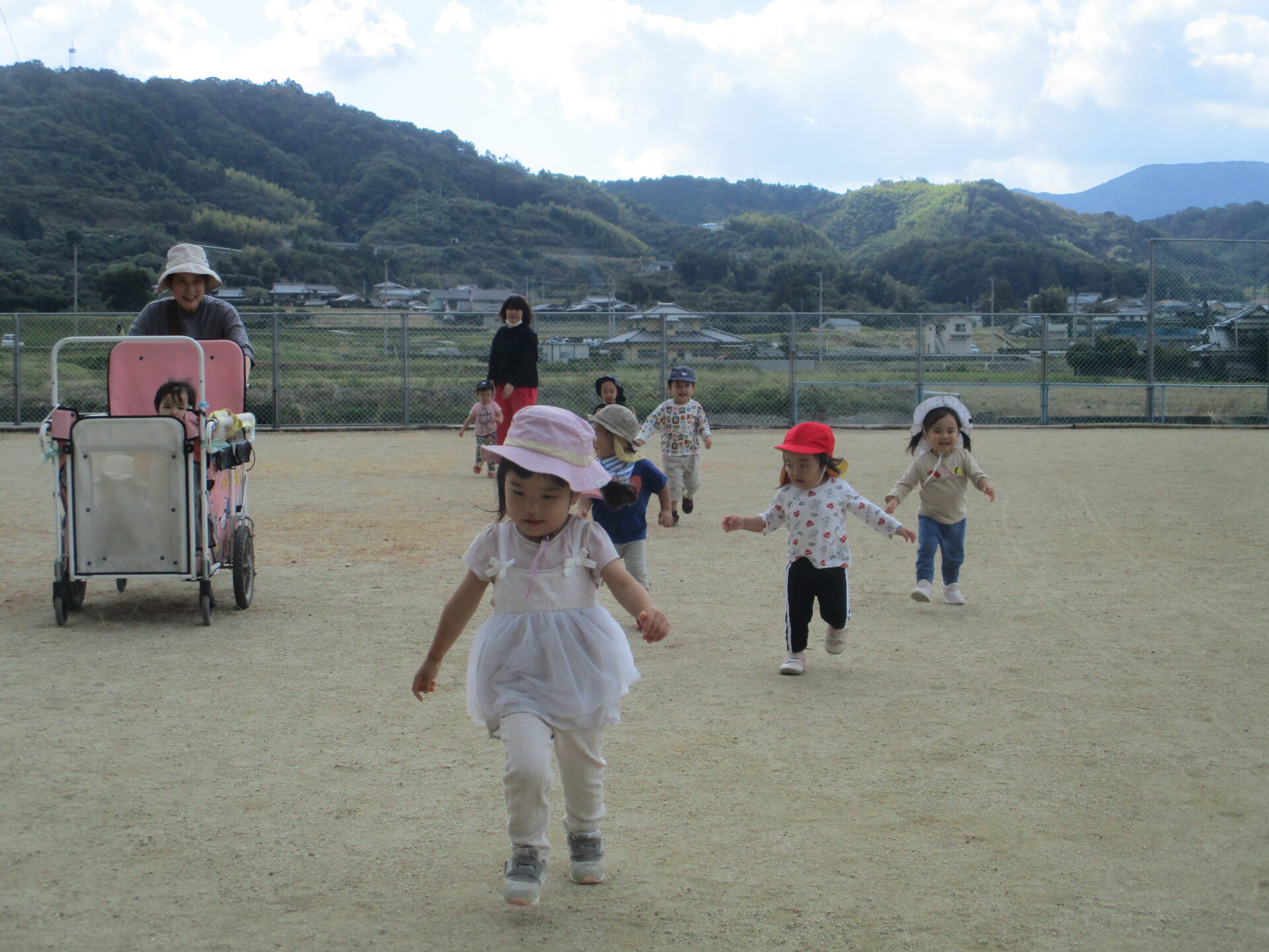 ここは、日中、ご高齢の方が、ゲートボールをする広い場所があります。ウォーミングアップ代わりにみんなで「よーい どん!」をしました。