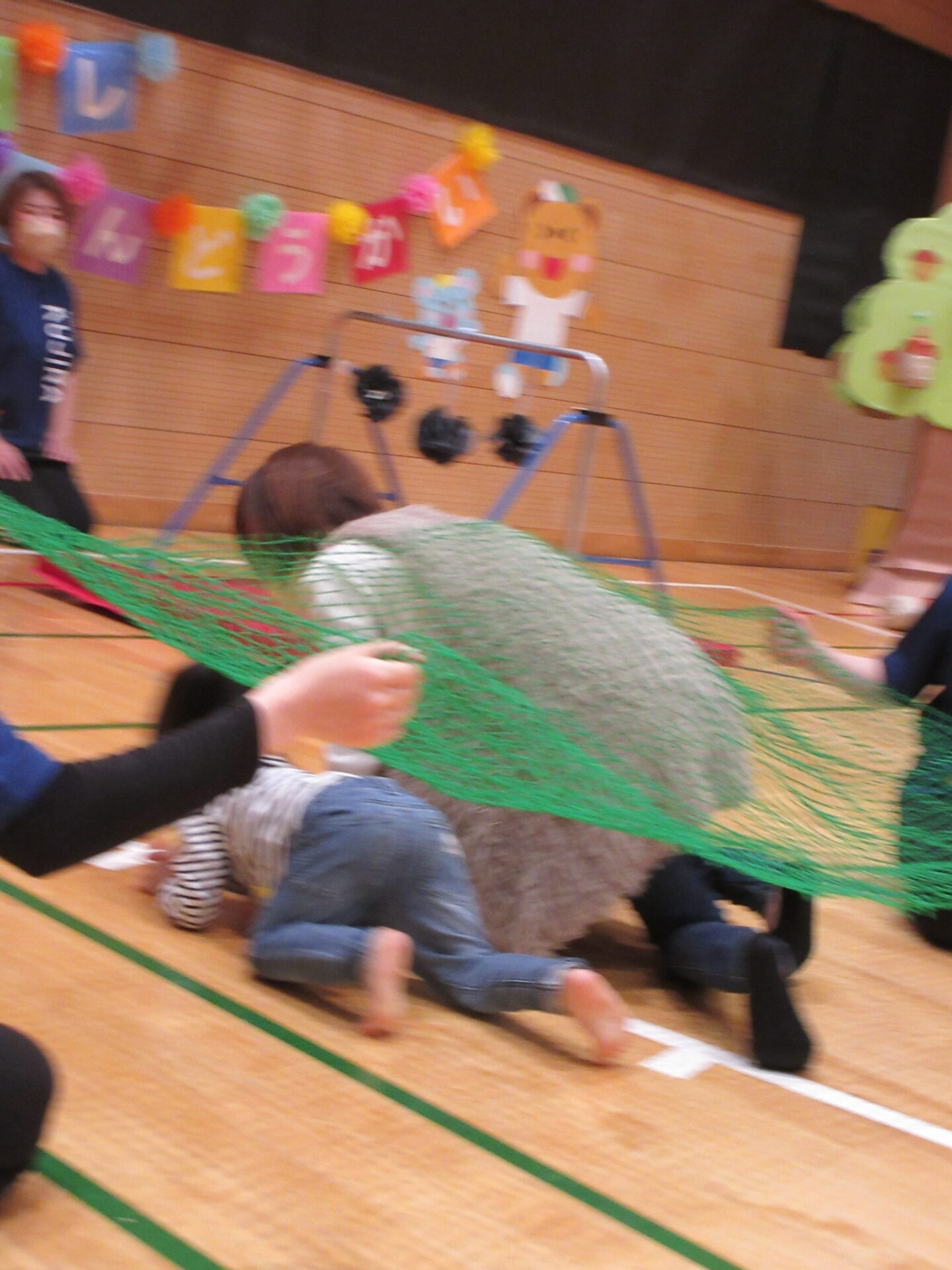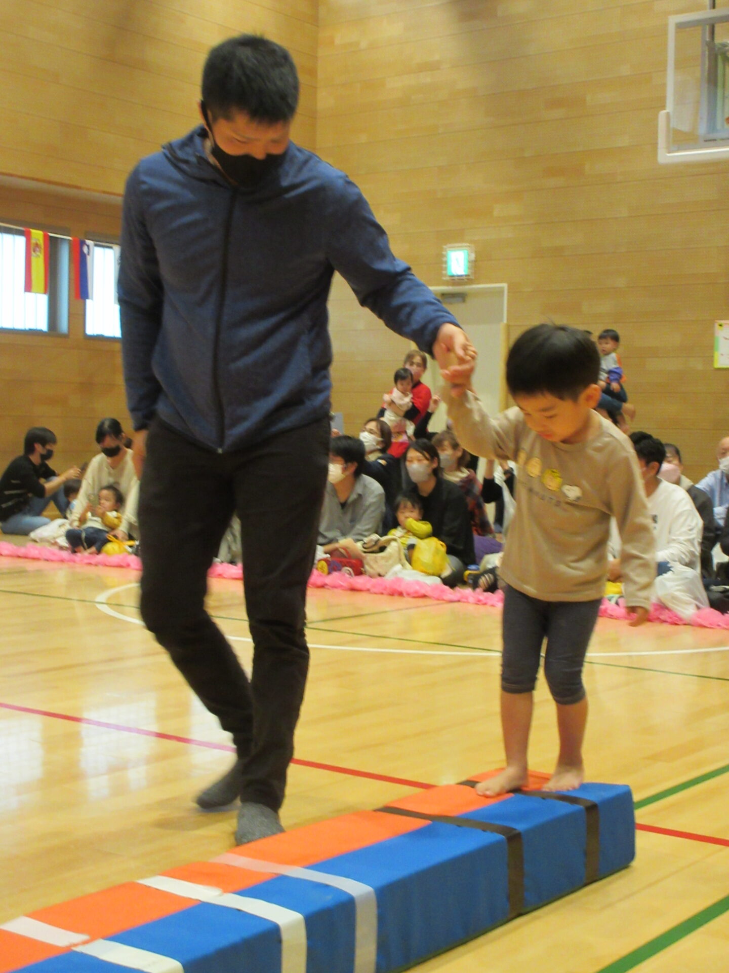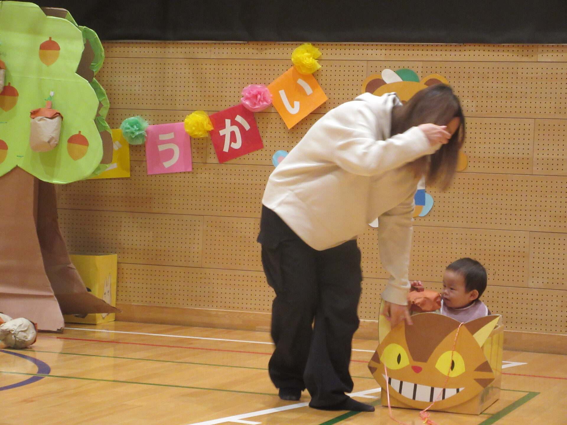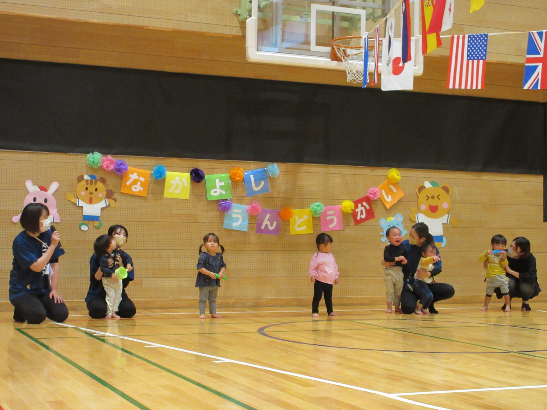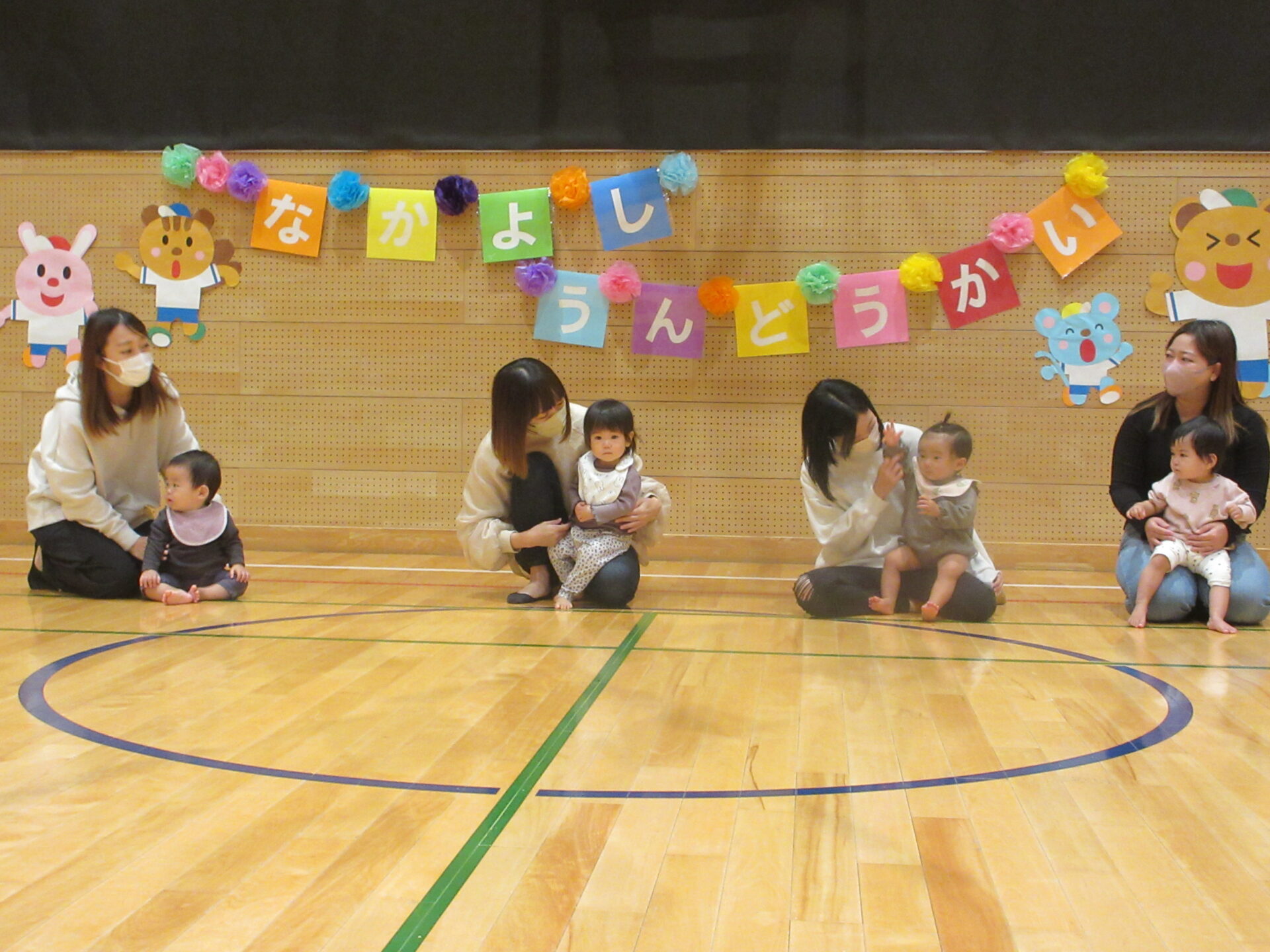 かけっこ(0歳児は、ハイハイのお友だちもいました。)や親子競技、体操教室など、みんなで楽しみました。最後は、触れ合い遊び。おうちの方の膝の上で、みんな満面の笑顔でした。