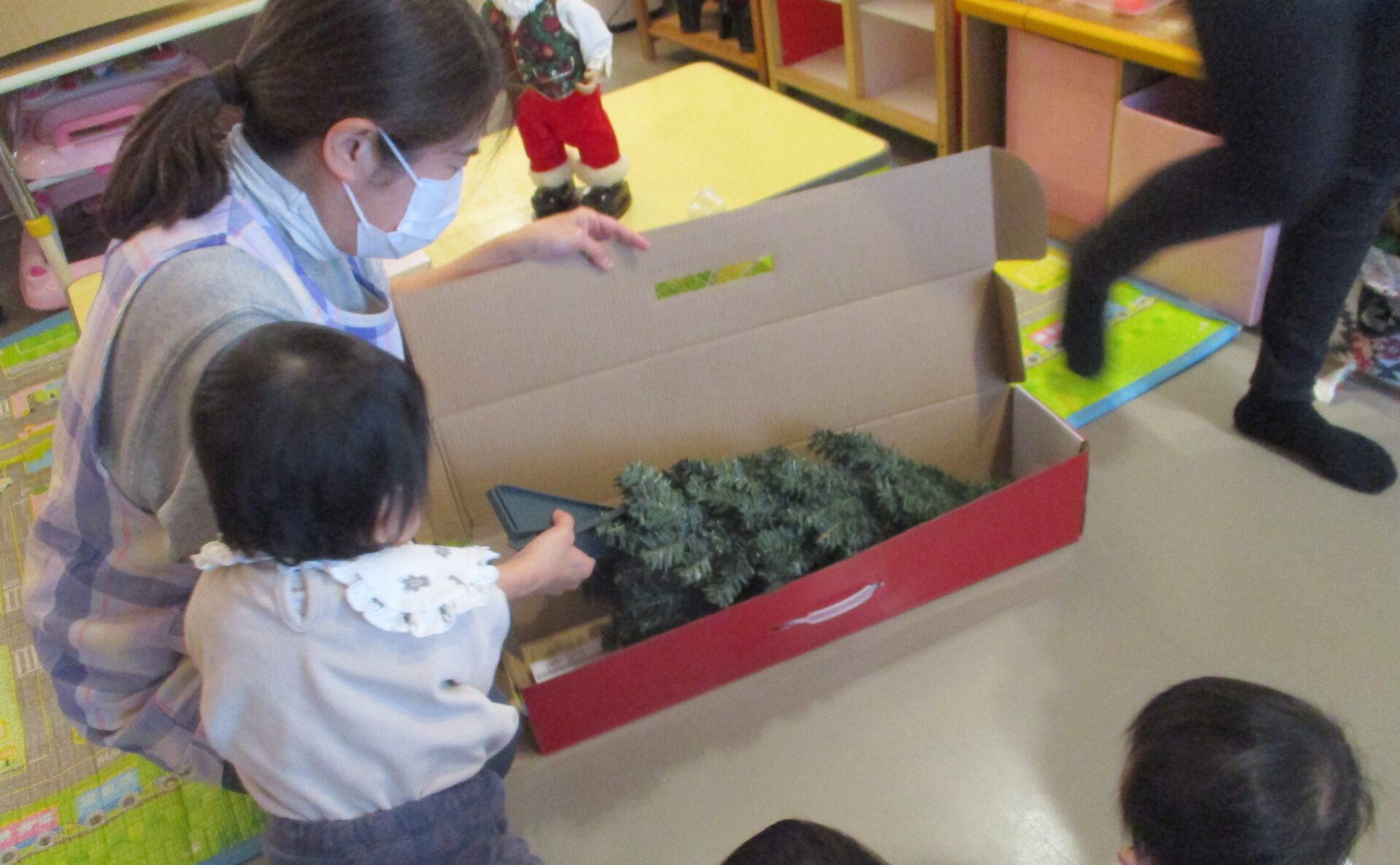 箱からツリーを取り出す様子から見ていた子どもたち。