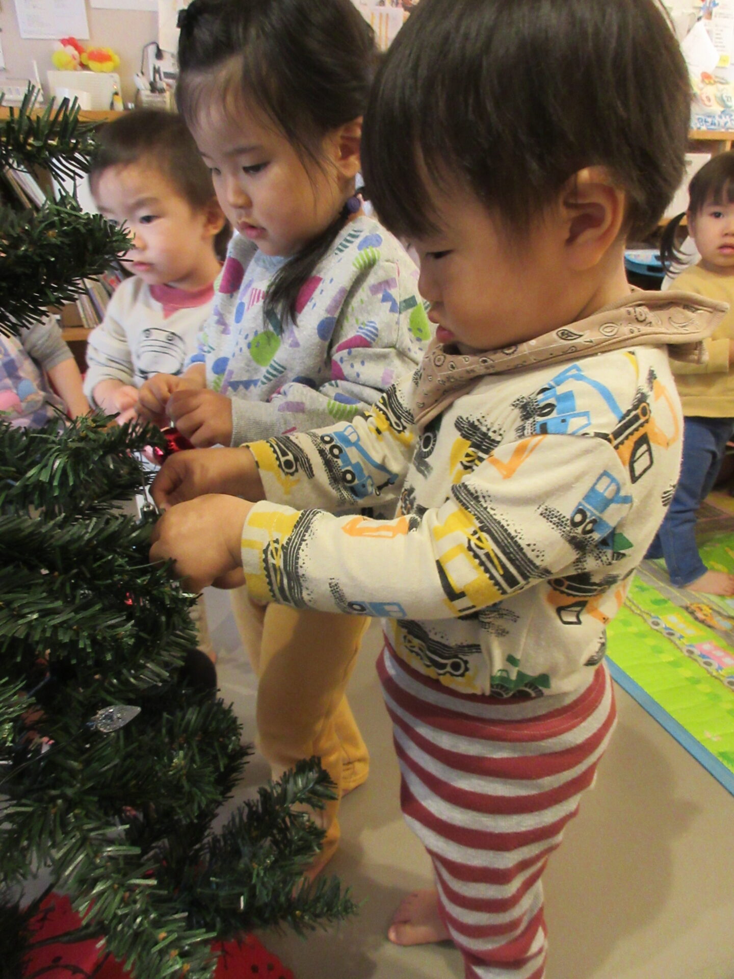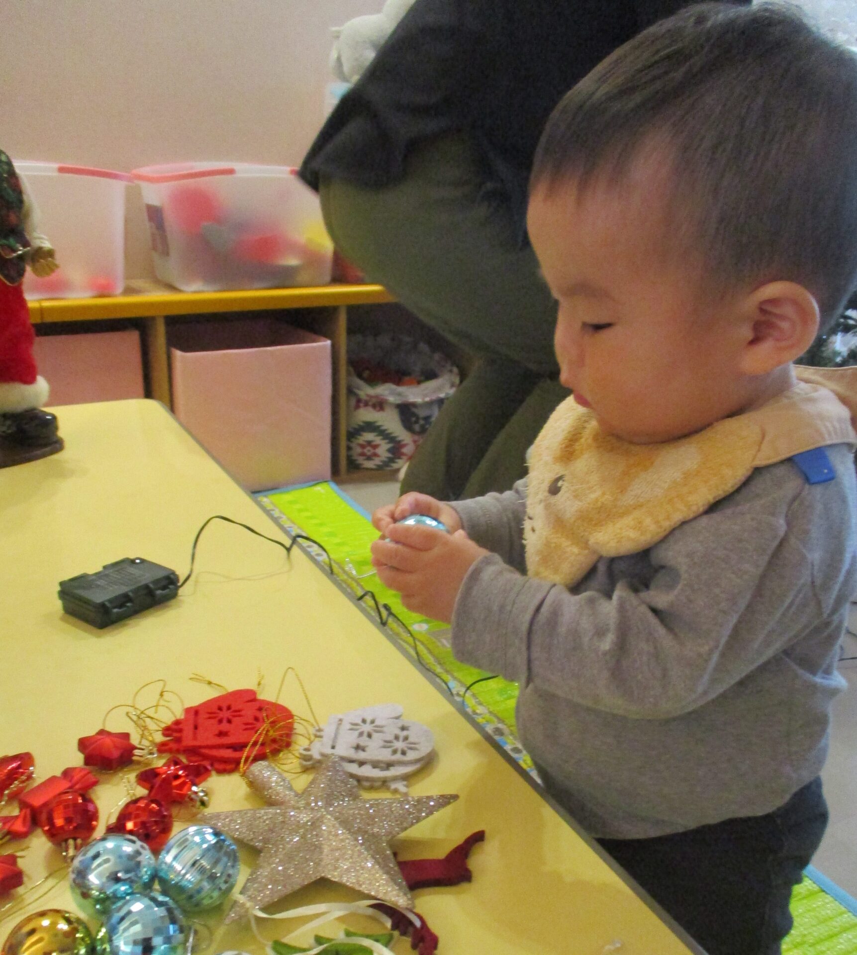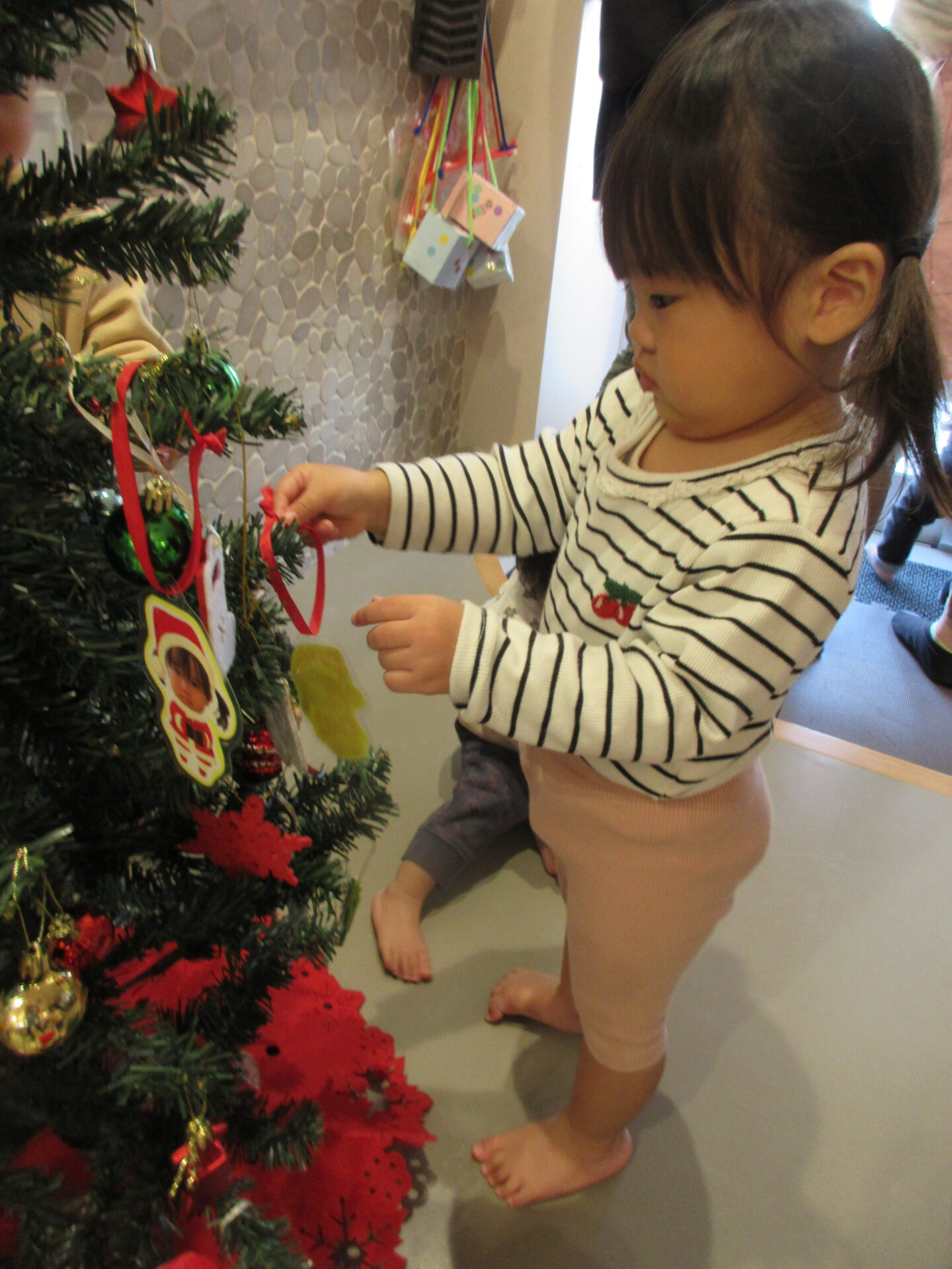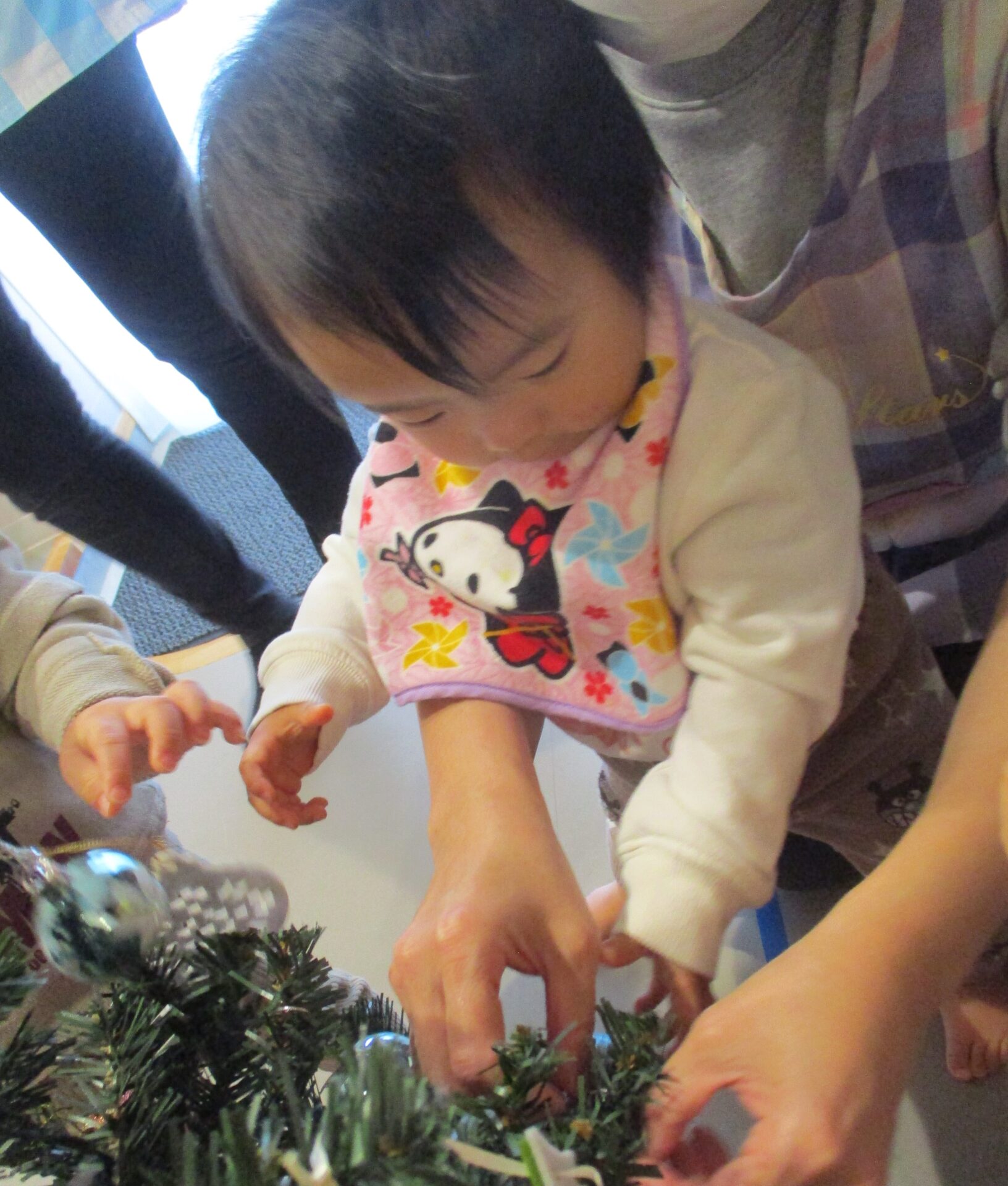 指先に神経を集中させて、一生懸命に輪を大きくし、ツリーへ。でも、上手くいかないときもあったりして。けれど、自分で吊り下げることが出来たときは、とても満足そうでした。
