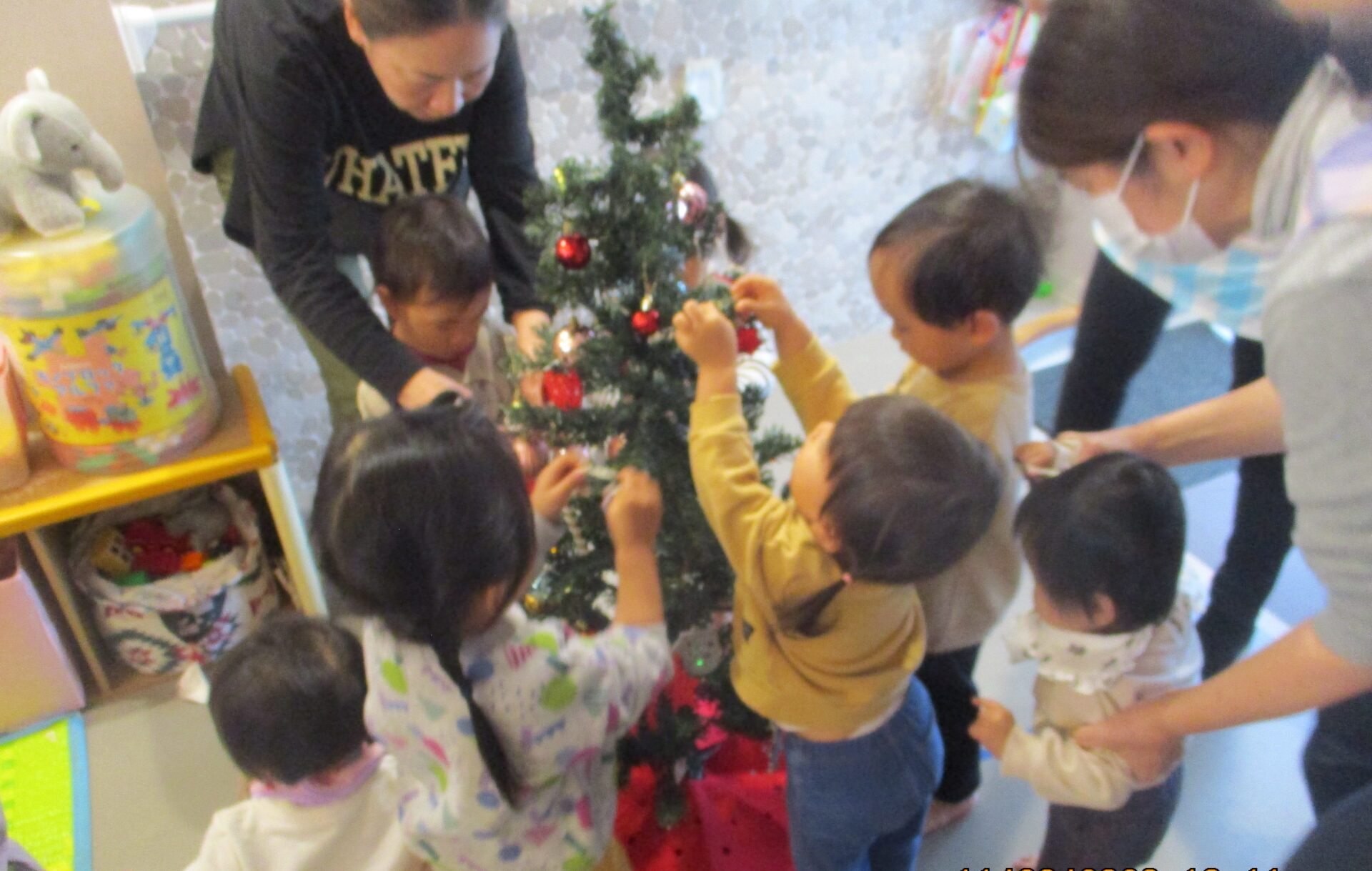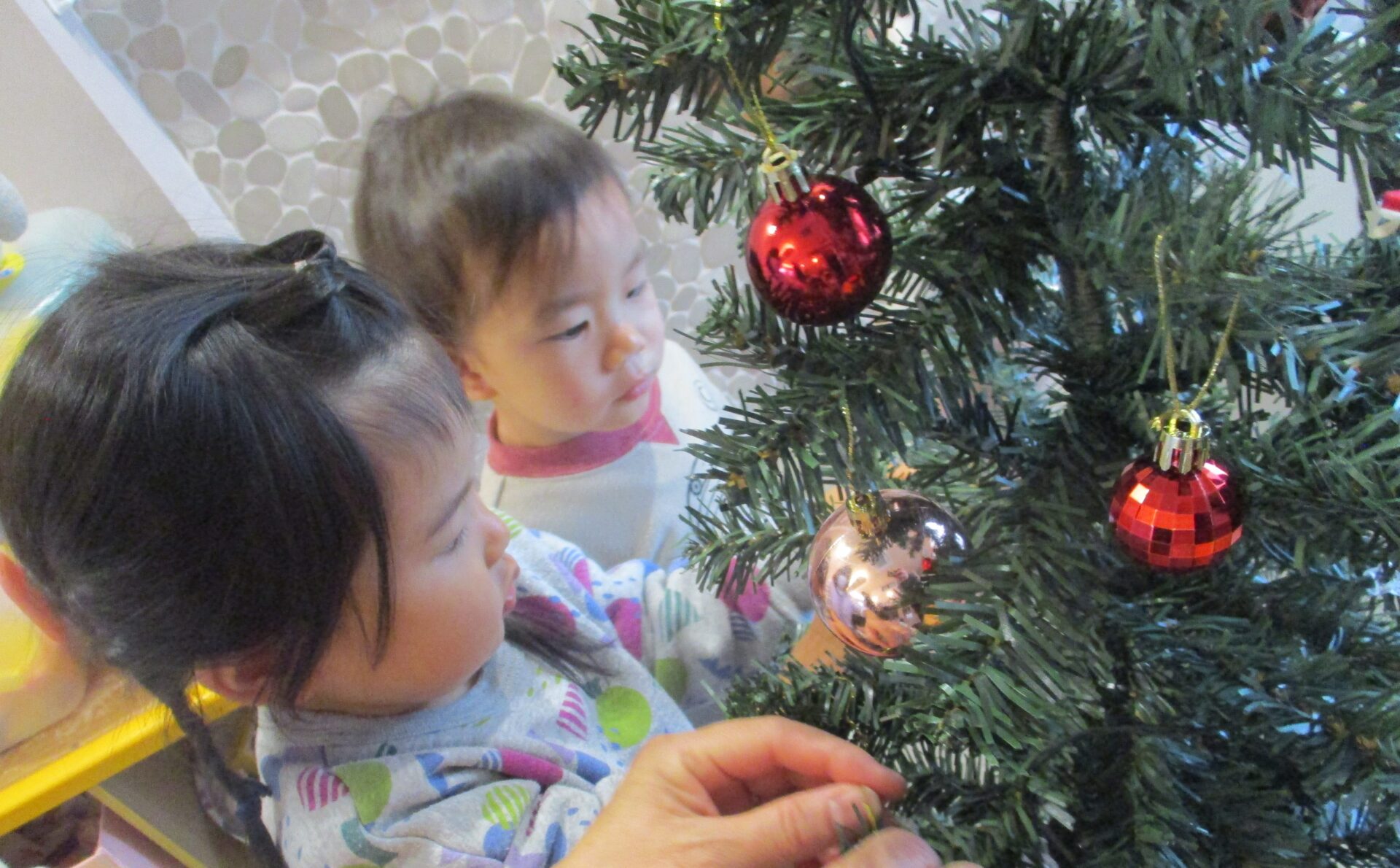 小さい子どもたちには、吊り下げ紐を輪にして、その輪をツリーの先に吊り下げるのは、至難の業。