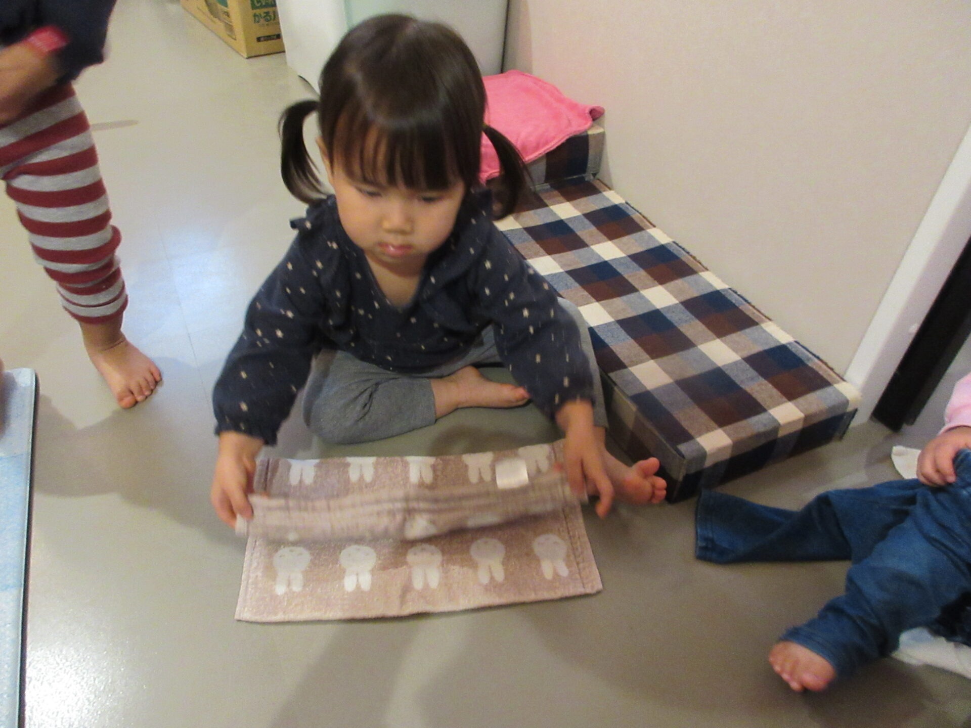 お家でもトイレトレーニングをしている子がいます。寝起きが排尿しやすいので、無理のない範囲で誘ってみてください。排尿出来たら、排尿している姿を見せ、いっぱい褒めてあげてください。その繰り返しで、排尿の感覚が分かってくると思います。