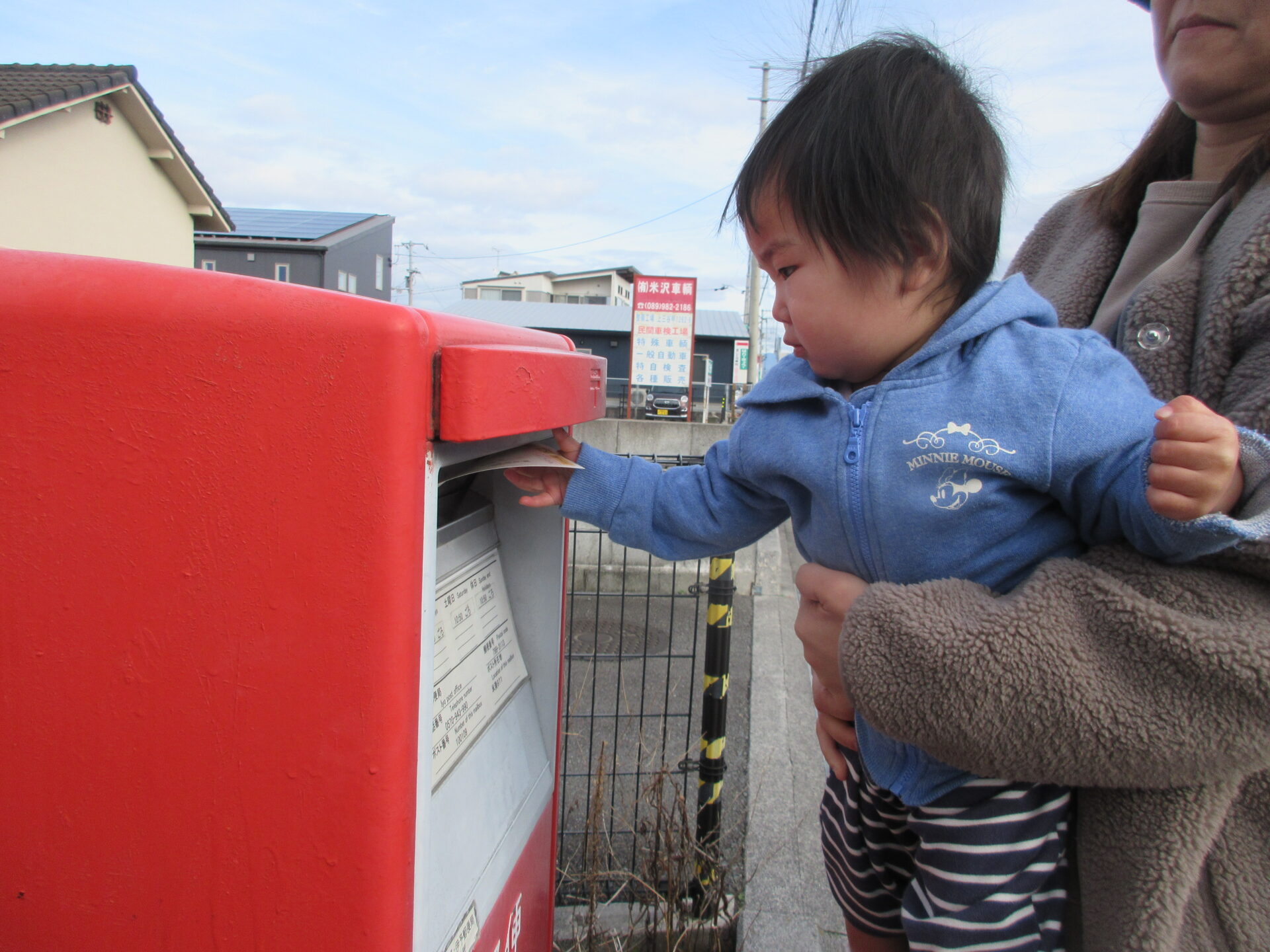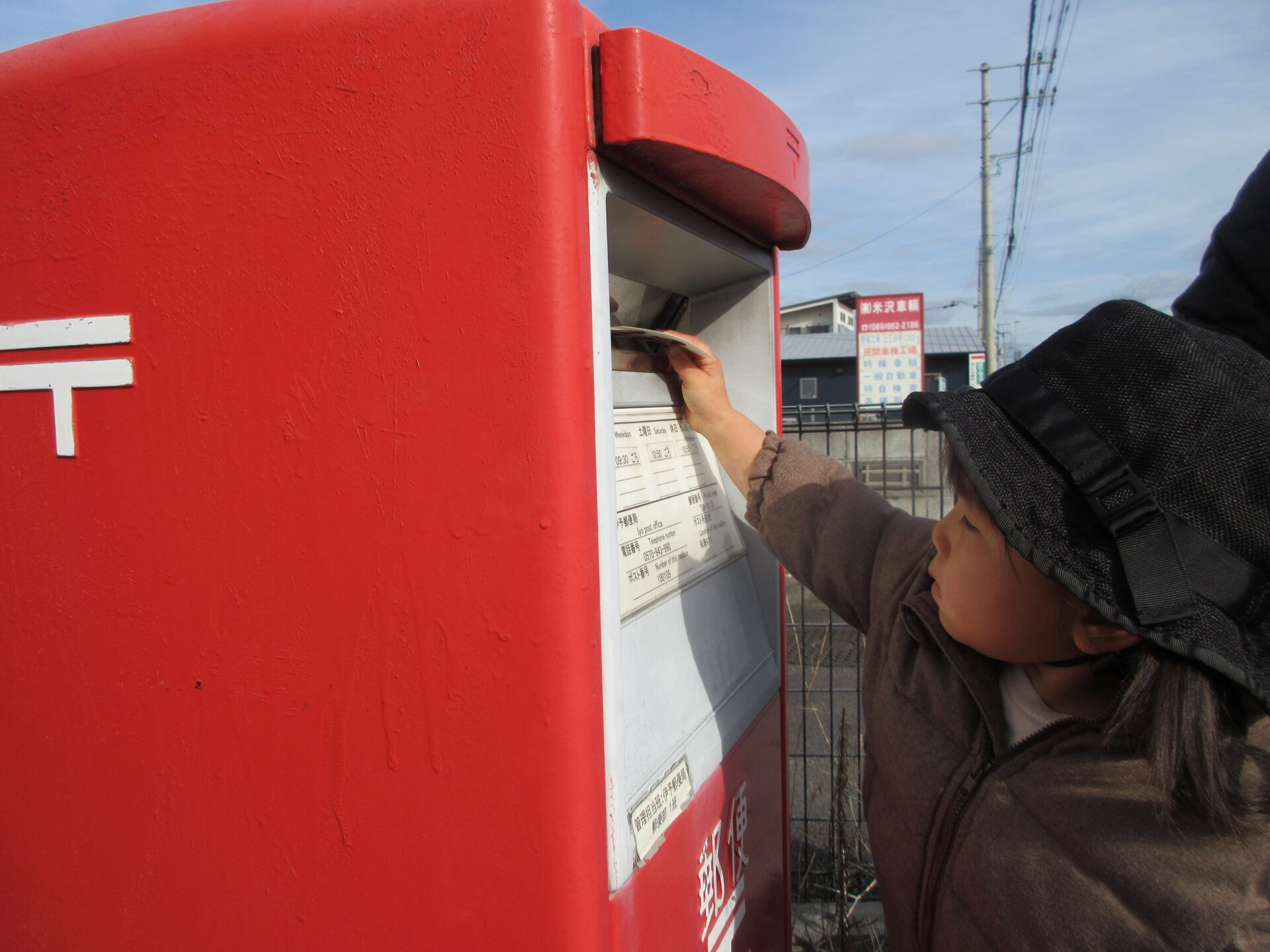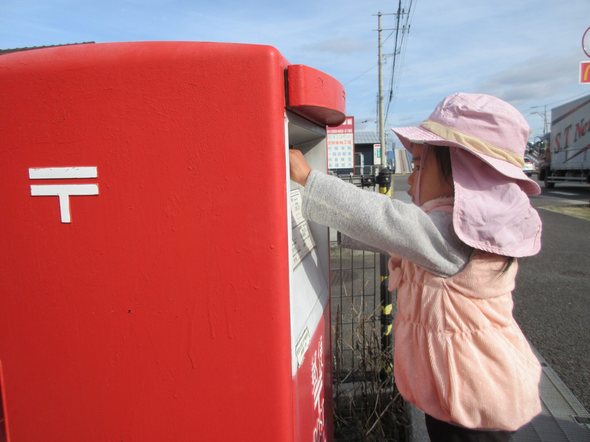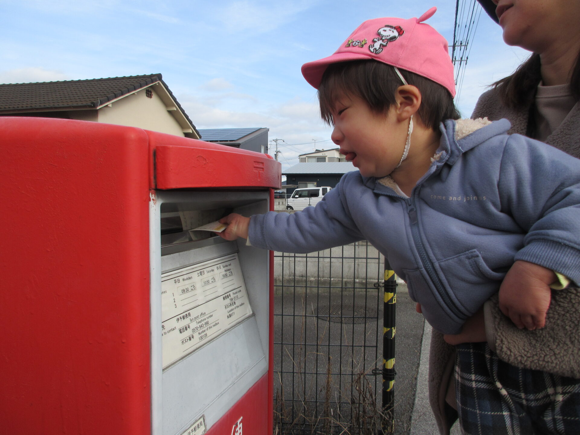 お正月にみんなの家に年賀状が届くように、近くのポストにみんなで出しに行きました。