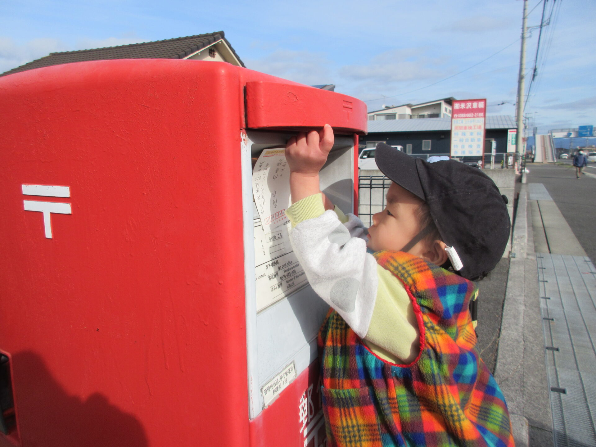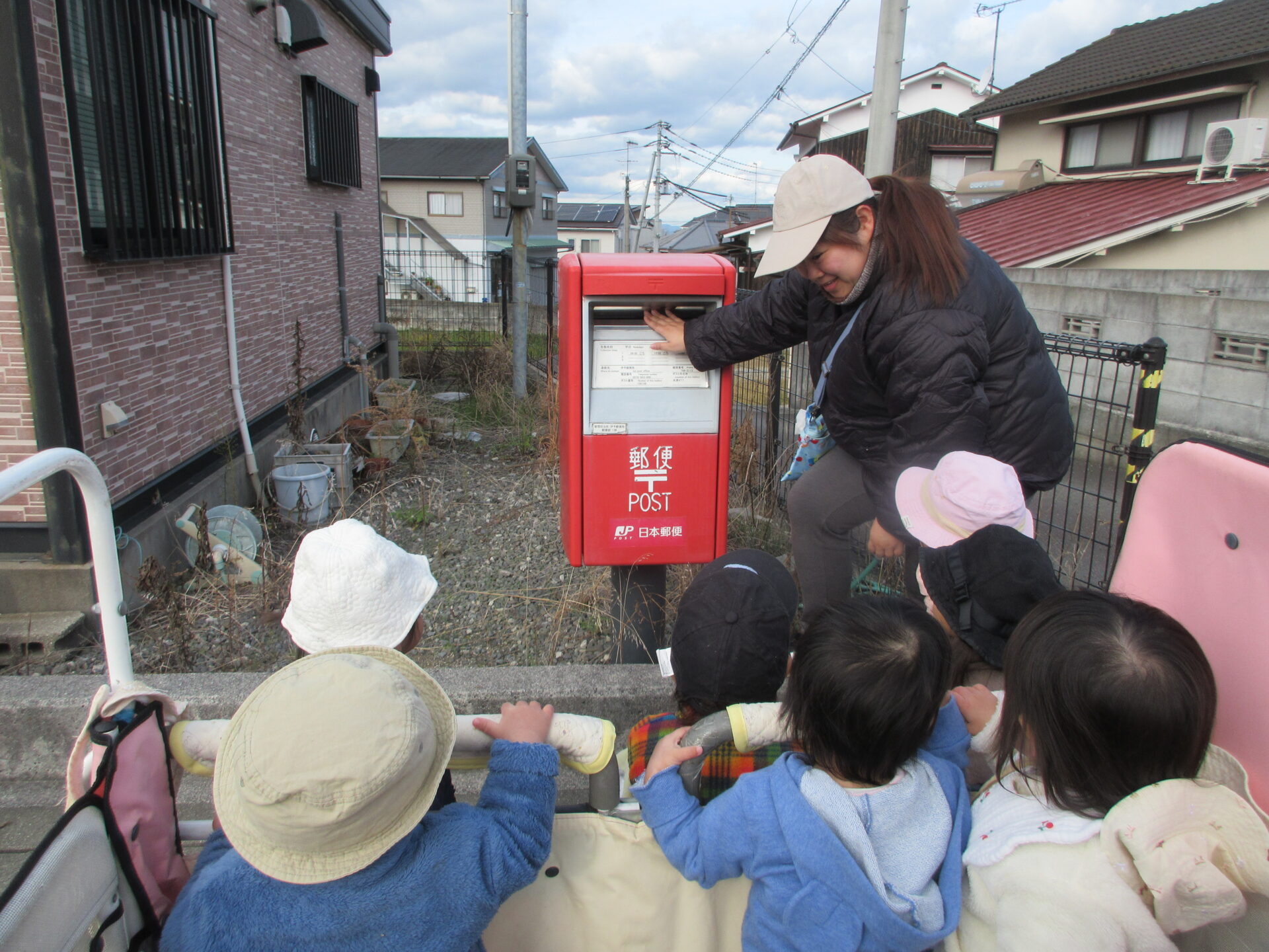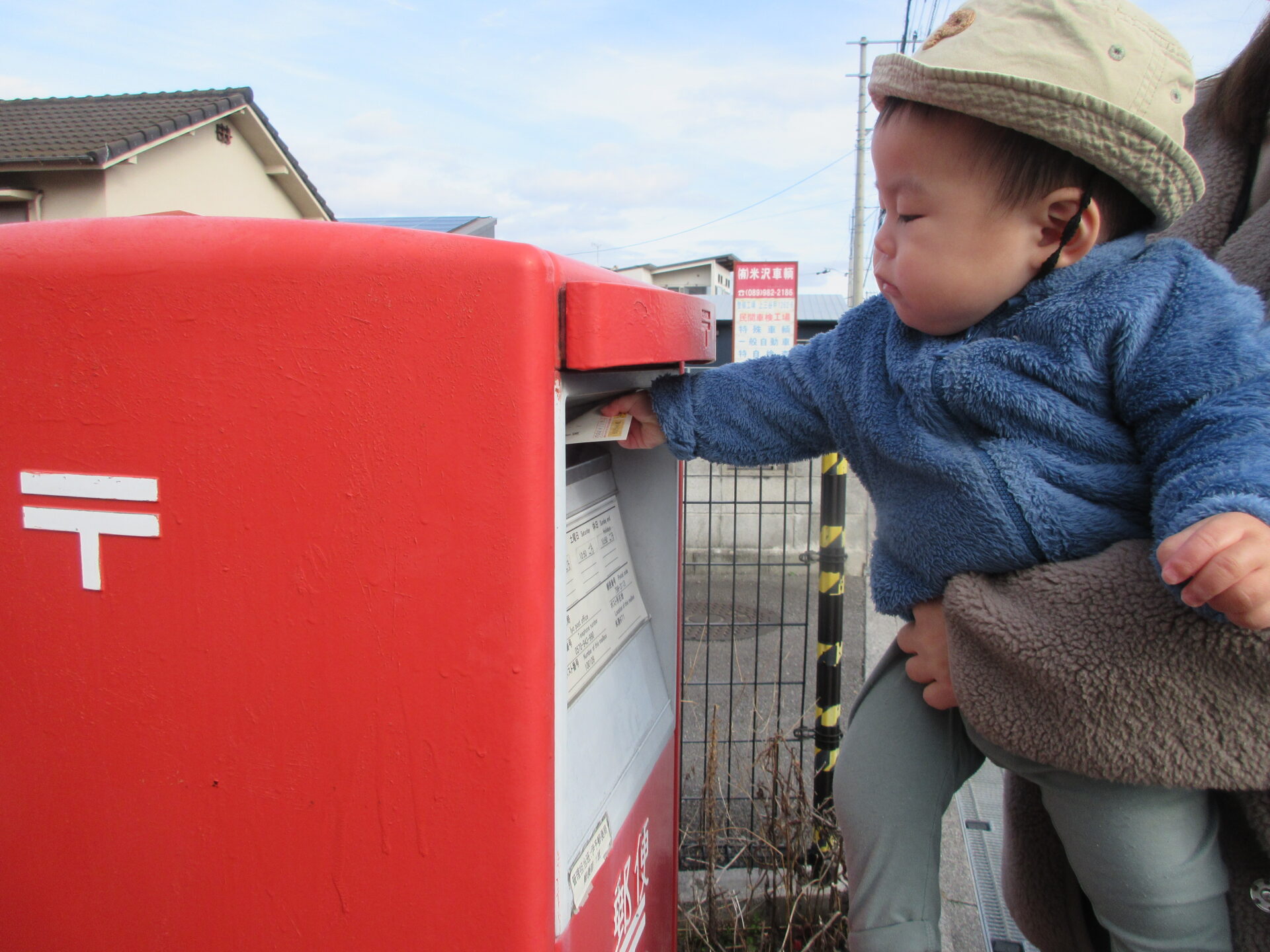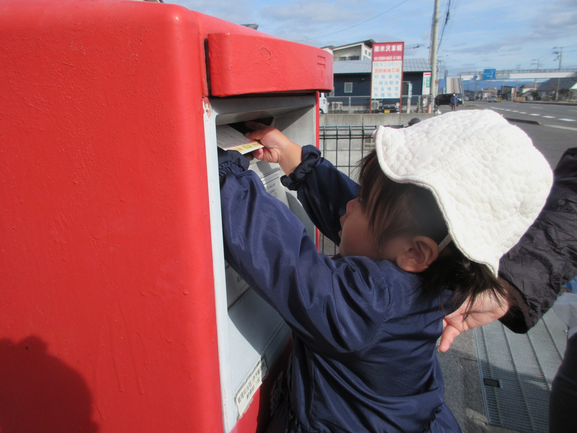 お正月にみんなの家に年賀状が届くように、近くのポストにみんなで出しに行きました。