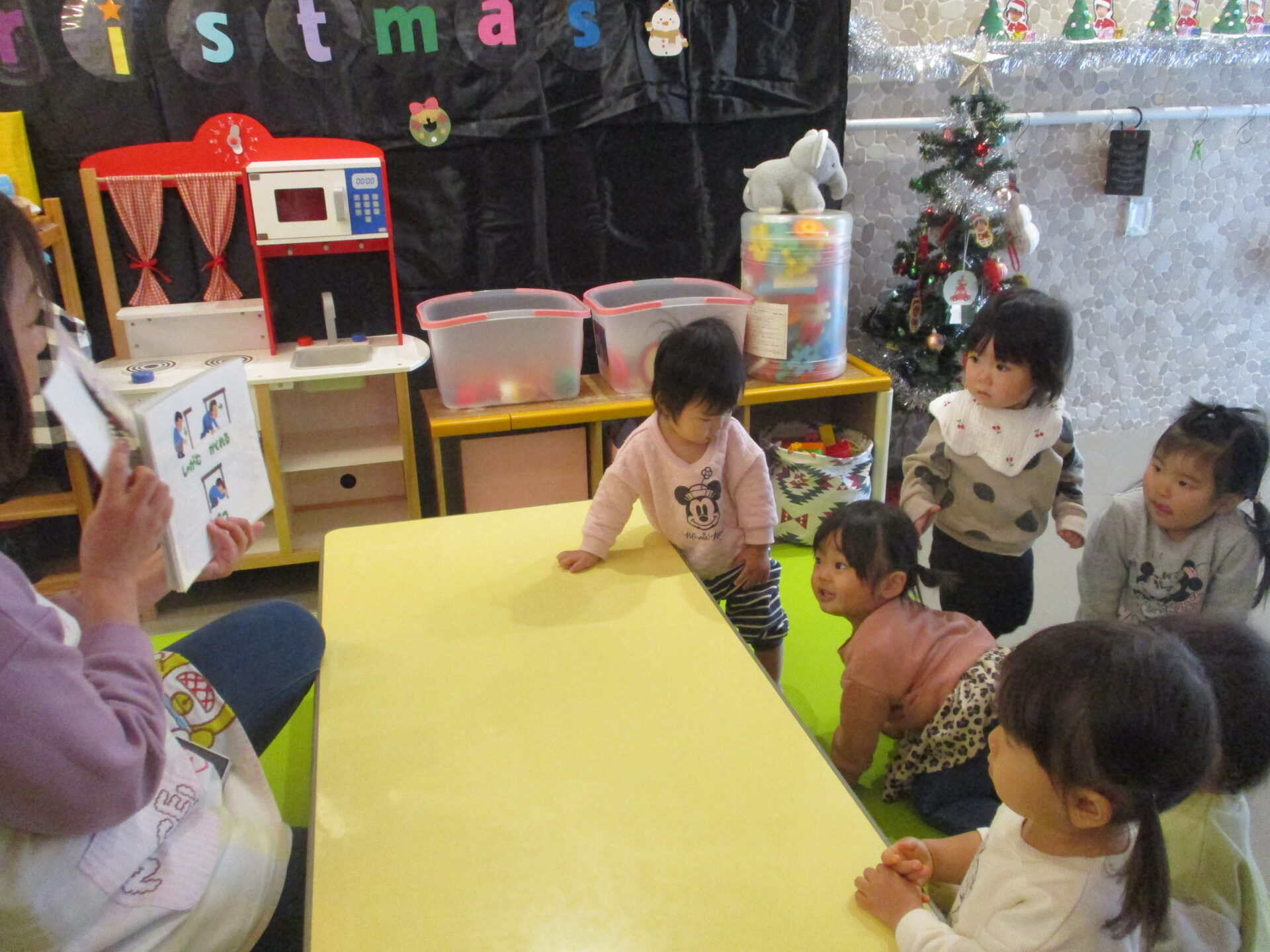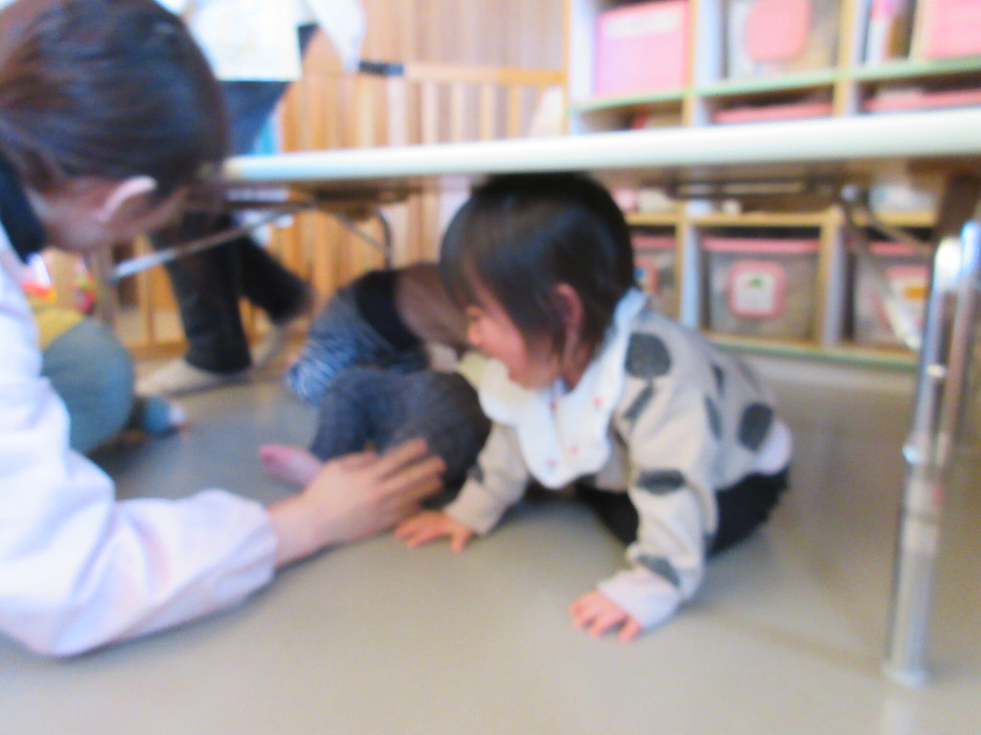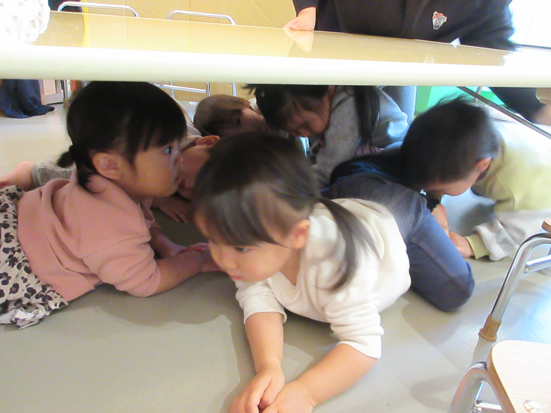 事前に地震が起きたら、頭を守るために机の下に隠れることを伝えておきました。地震の合図で、すぐに机の下に隠れる子もいれば、固まって動けない子もいました。