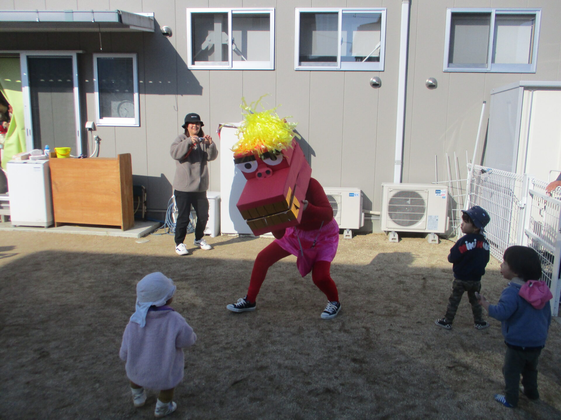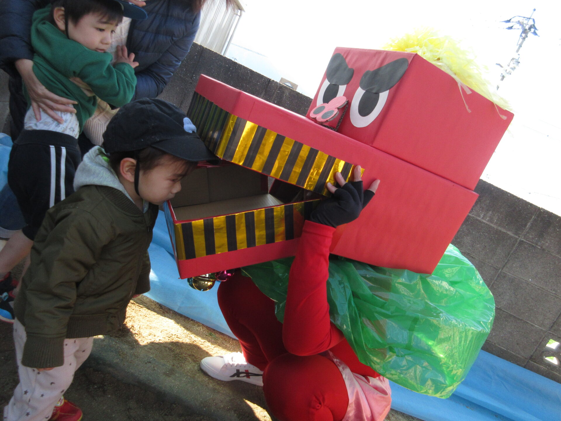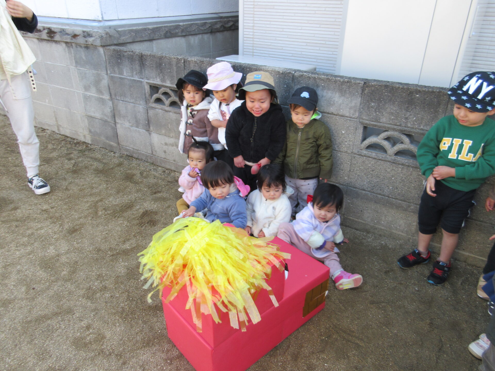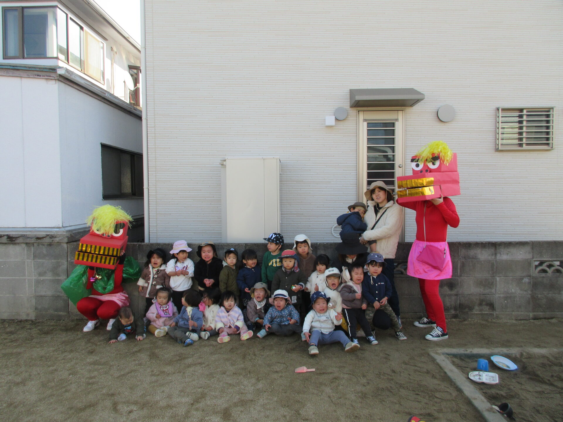 まんぼう小規模保育園と伊予ぺんぎん小規模保育園のお友だちが、今年も元気に過ごせるように獅子舞に、来てもらいました。