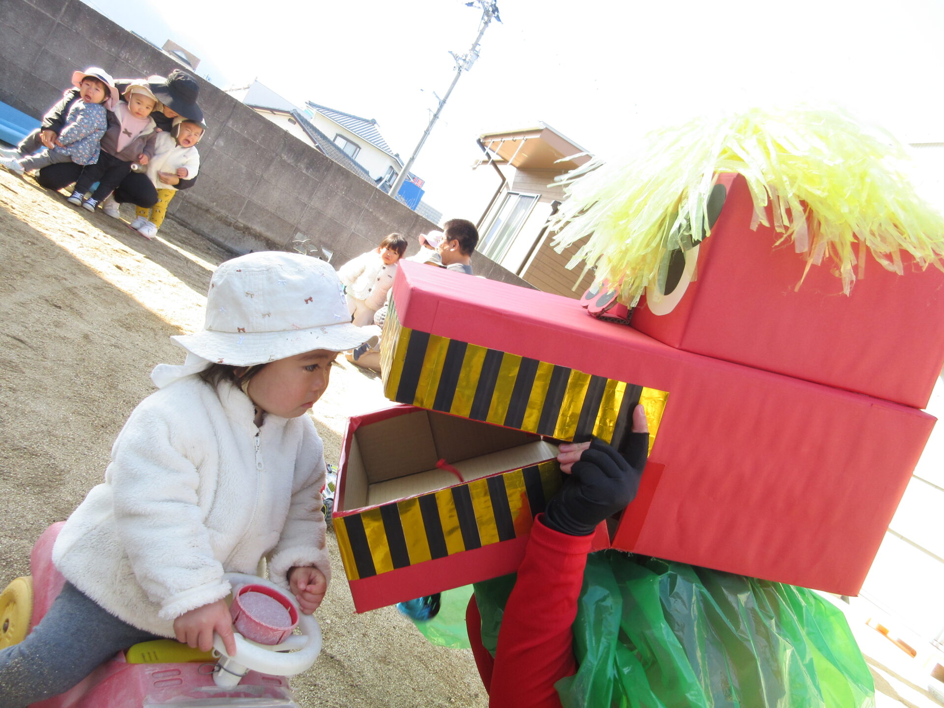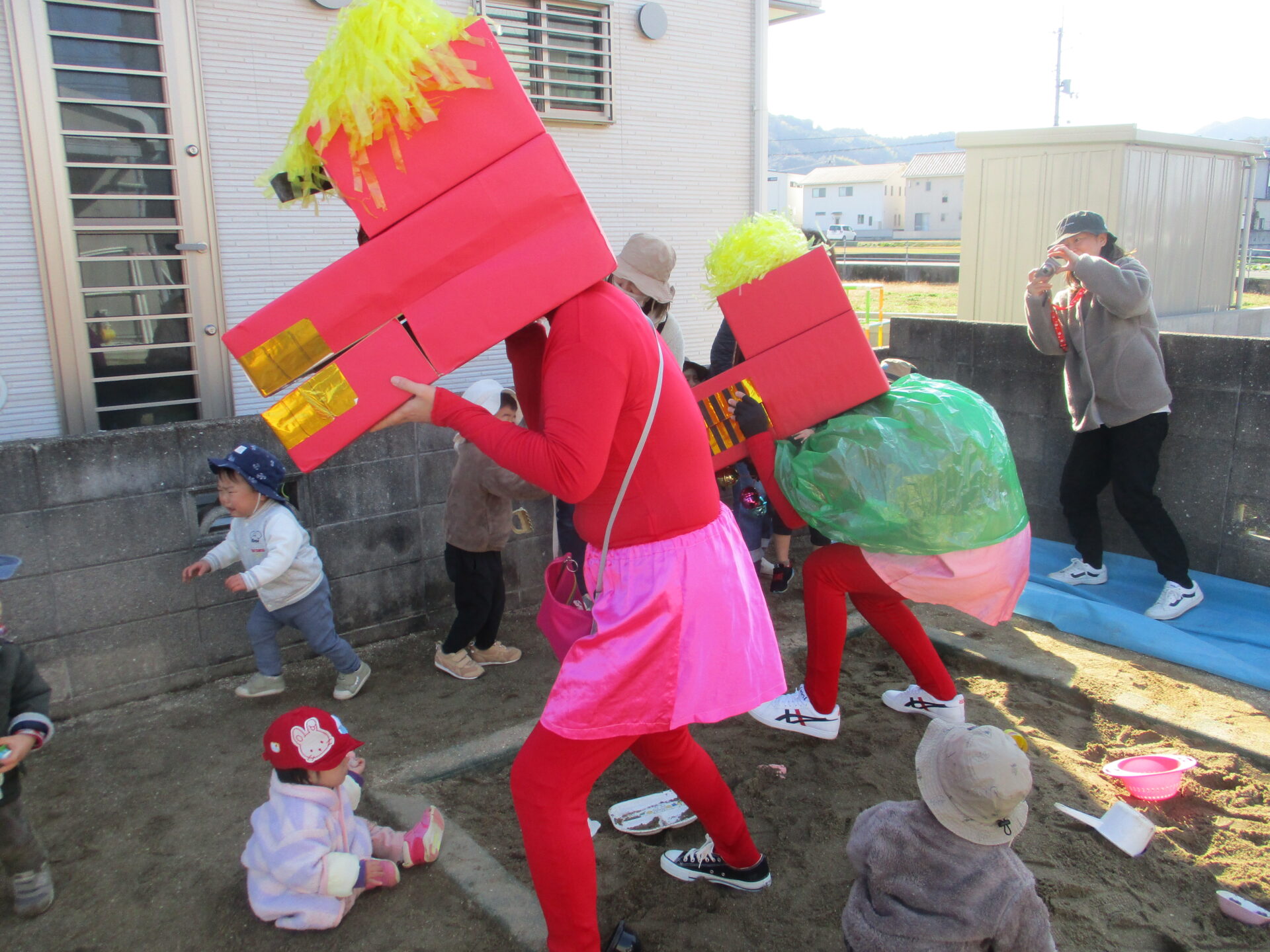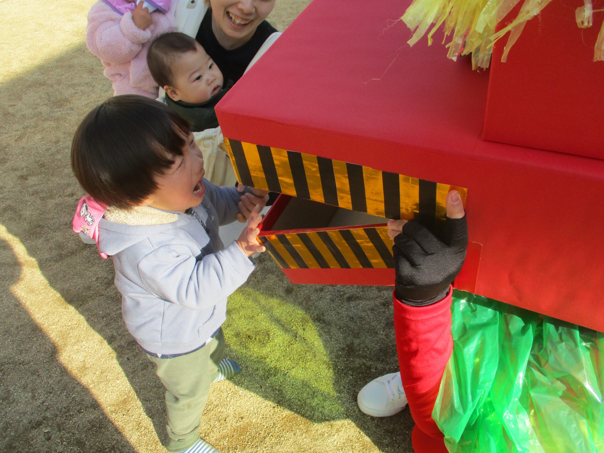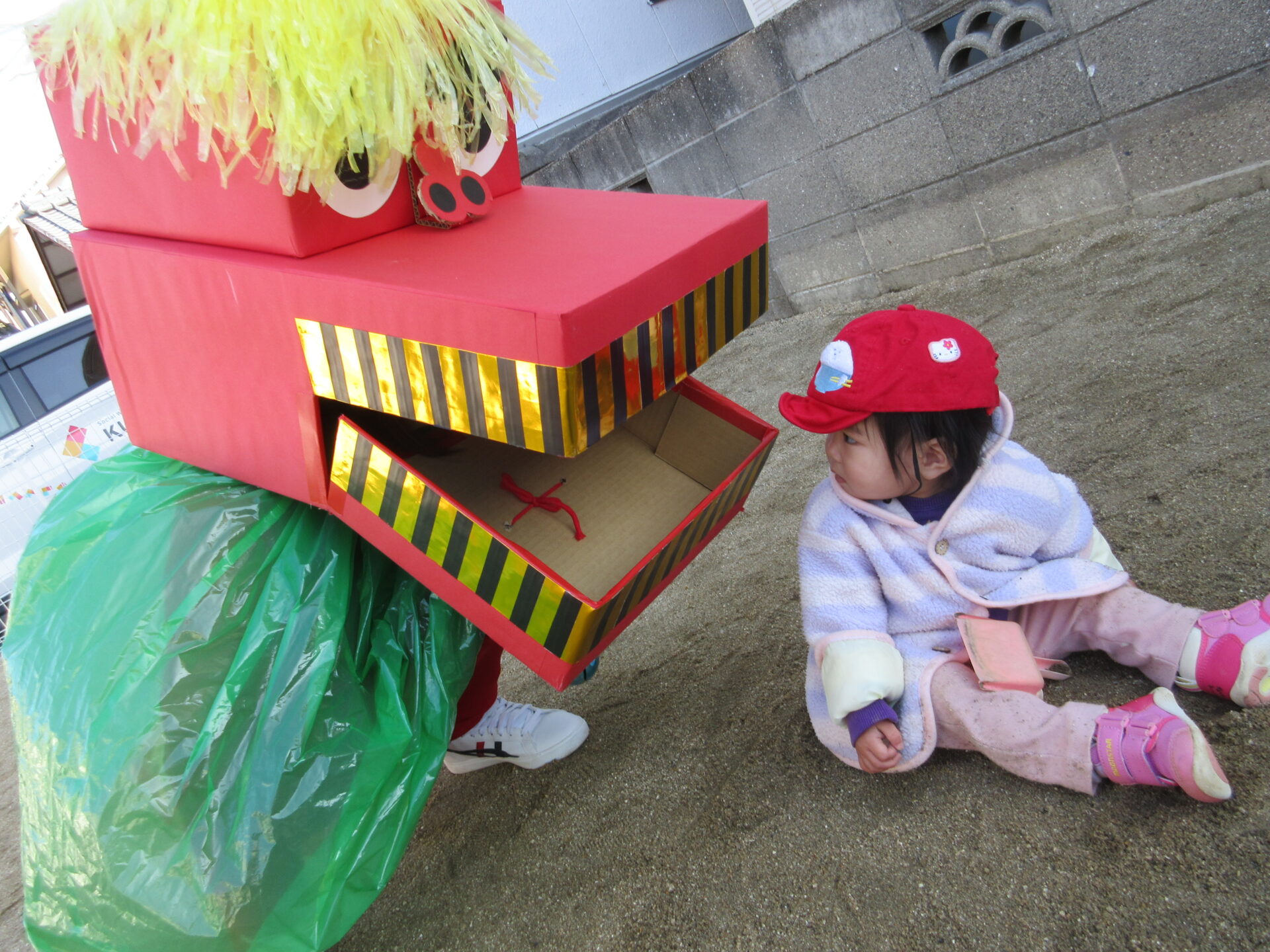 遊んでしばらくすると、音楽に合わせて赤い生き物が、やって来ました。