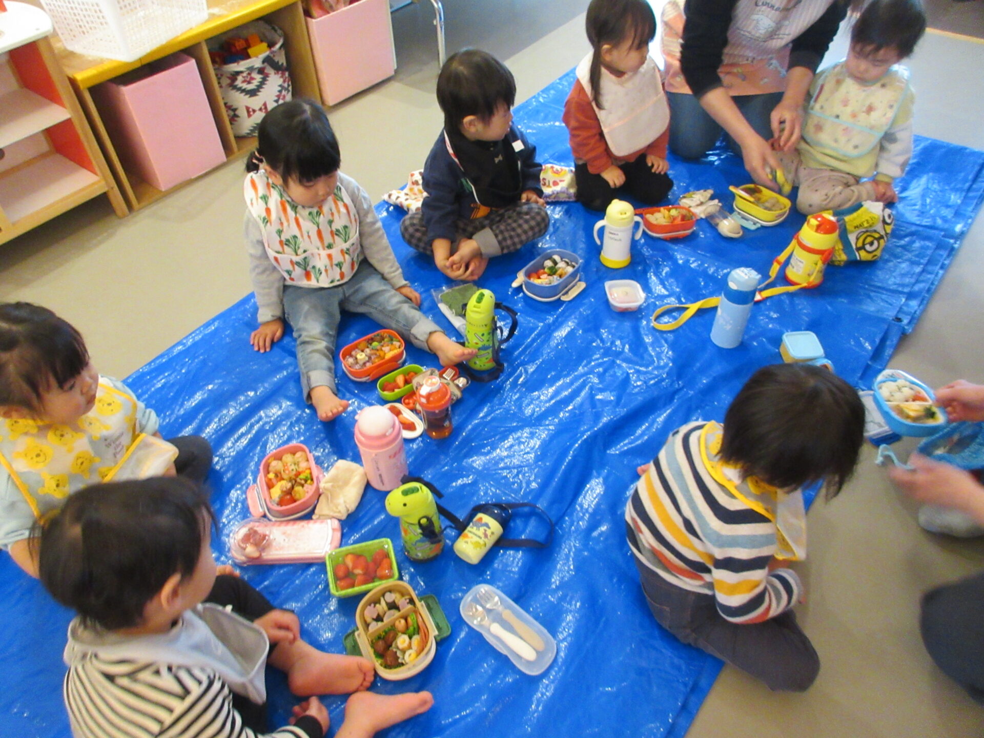 おうちの方には、素敵なお弁当を準備していただいたのですが、この日は、少し風が吹いていたので、保育園に帰ってからお弁当を食べました。