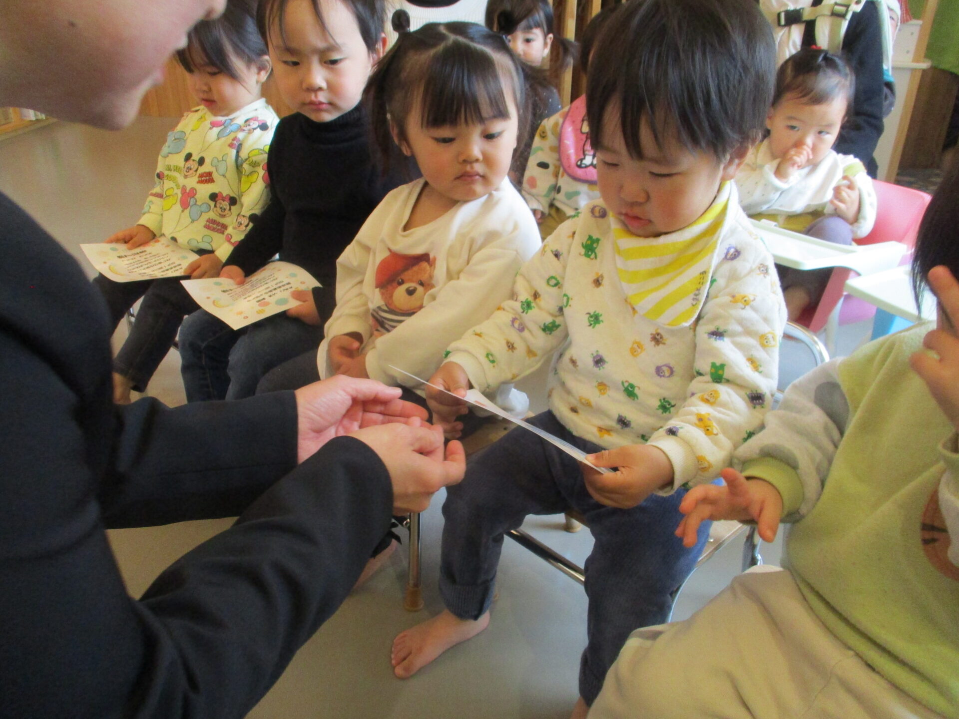 今年度は、卒園児は、一人でした。練習では、きちんと座り、返事もし、証書も受け取ることが出来ていたのですが、本番は、いつもと違う環境で、おうちの方の前だったこともあり、甘えてしまったようです。