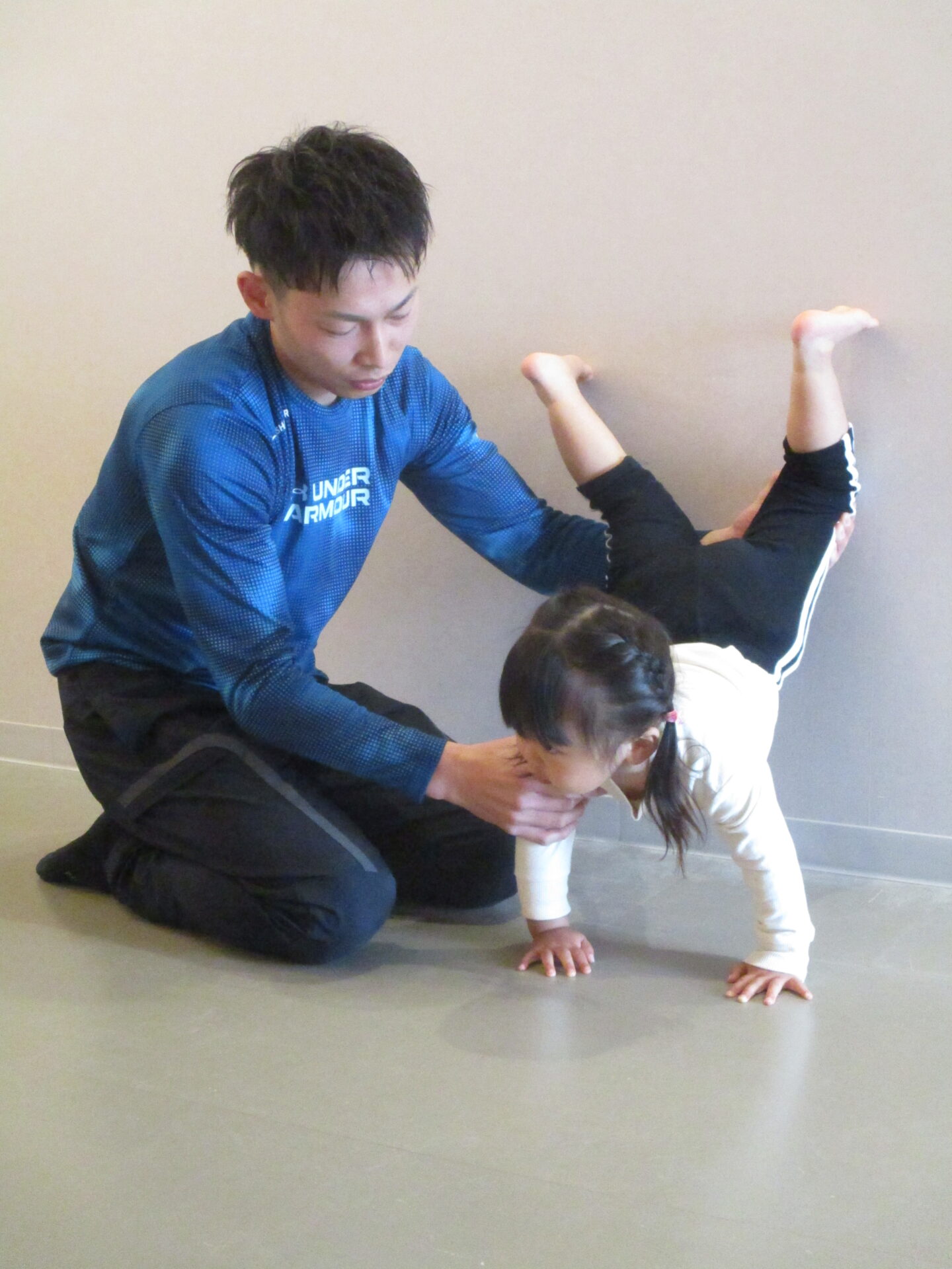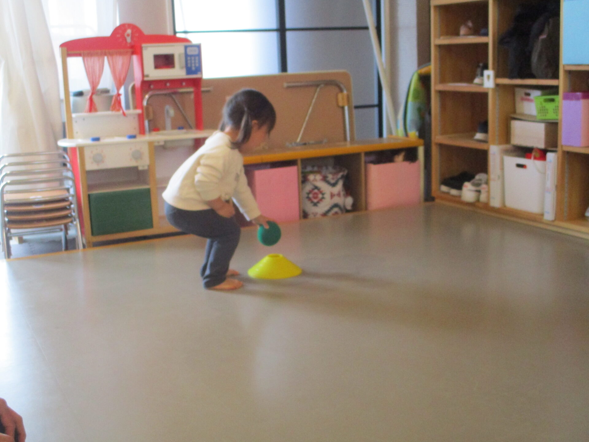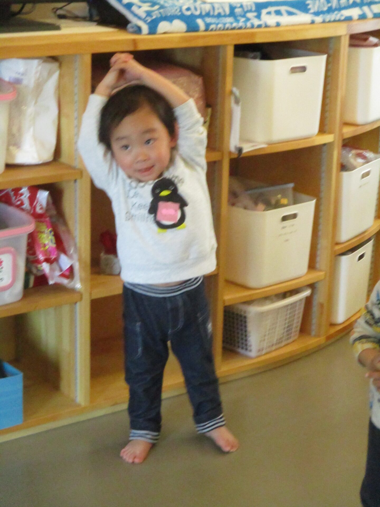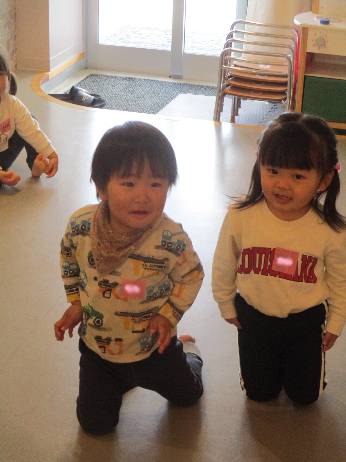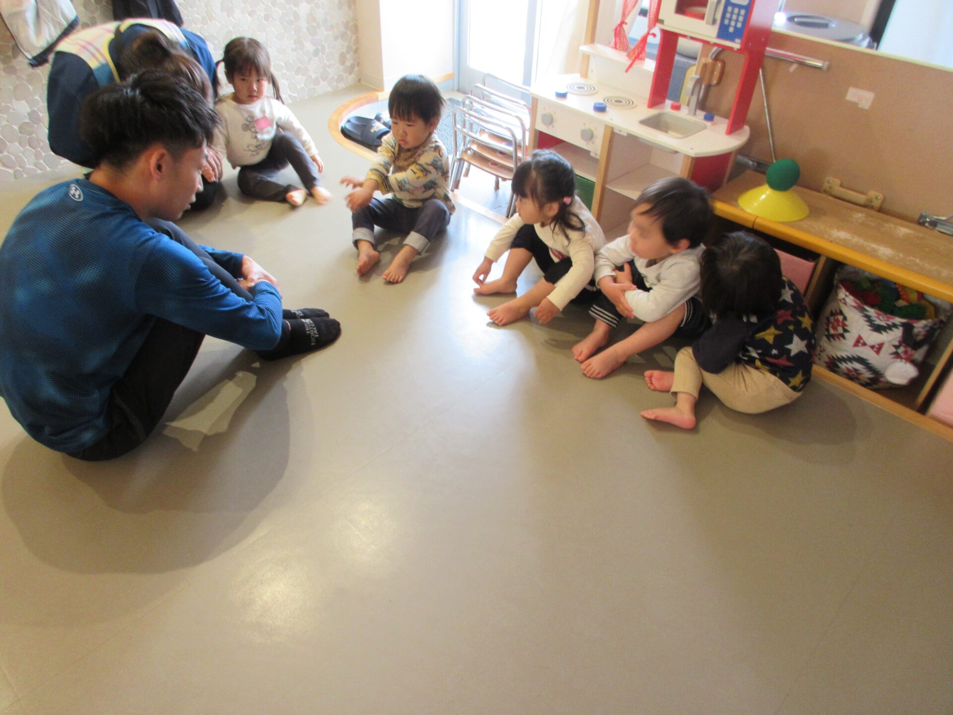 「よろしくお願いいたします。」の挨拶で緊張気味のまんぼう組さん。優しく、かっこいいけんしょう先生のまねっこをしながら、いっぱい体を動かして楽しみました。