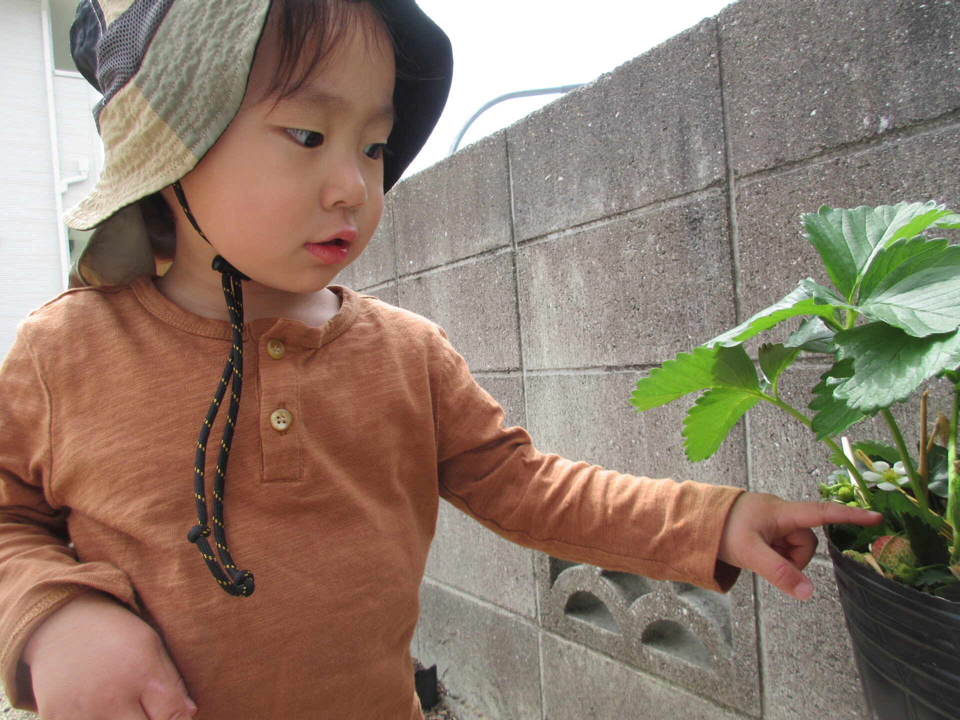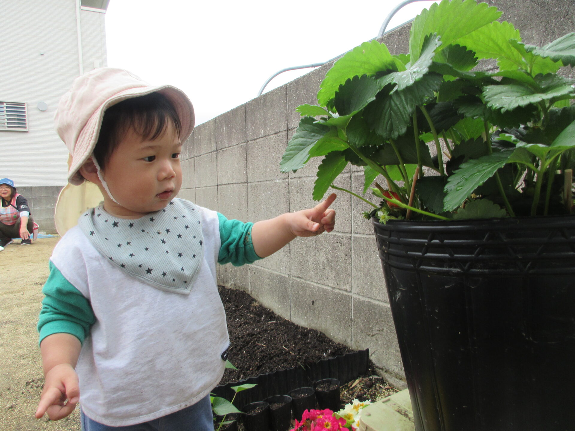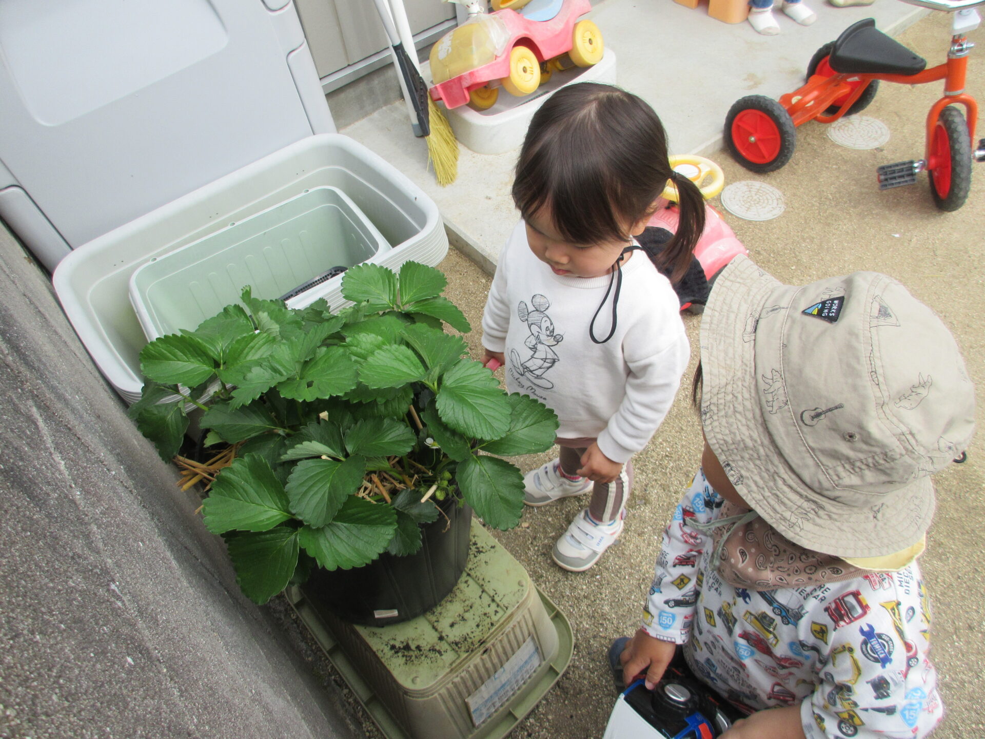 少しずついちごも色付いてきて、子どもたちも指さして、赤くなっていることを教えてくれました。