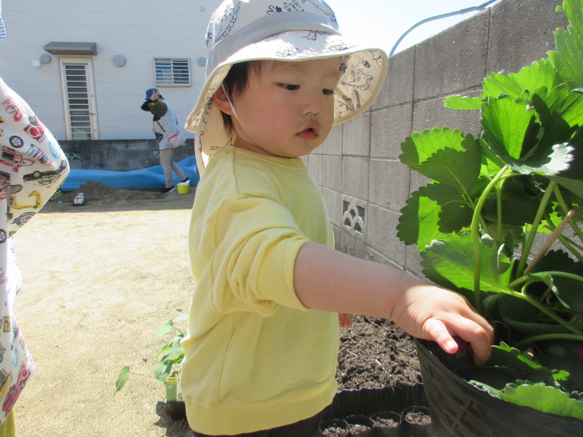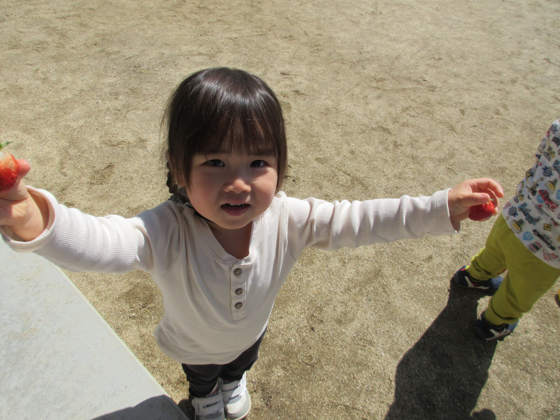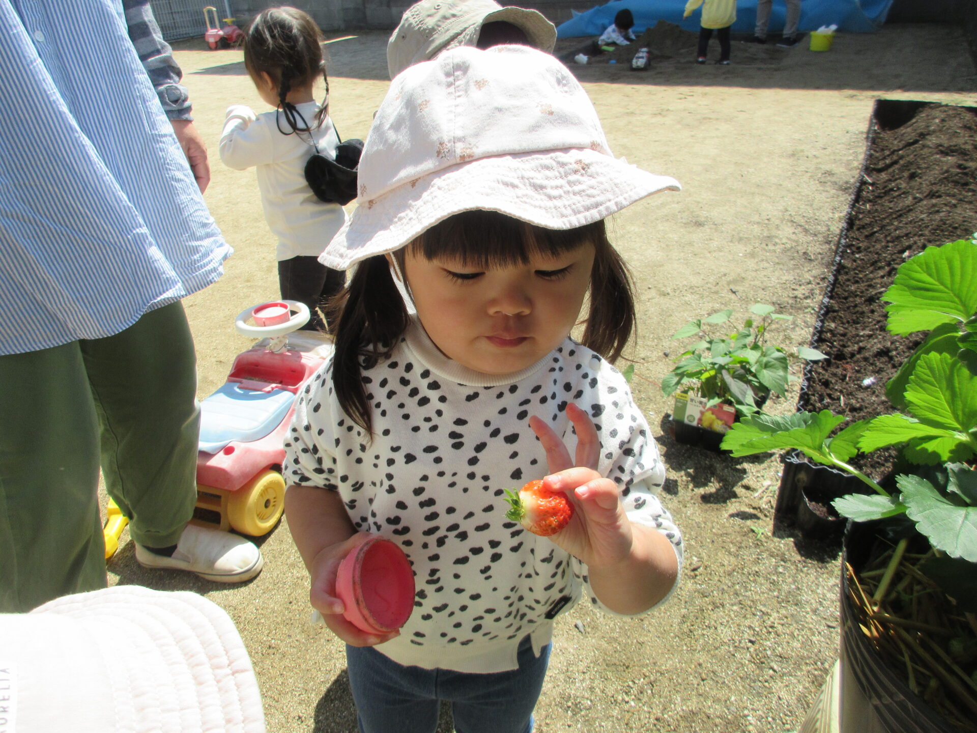 少しずついちごも色付いてきて、子どもたちも指さして、赤くなっていることを教えてくれました。