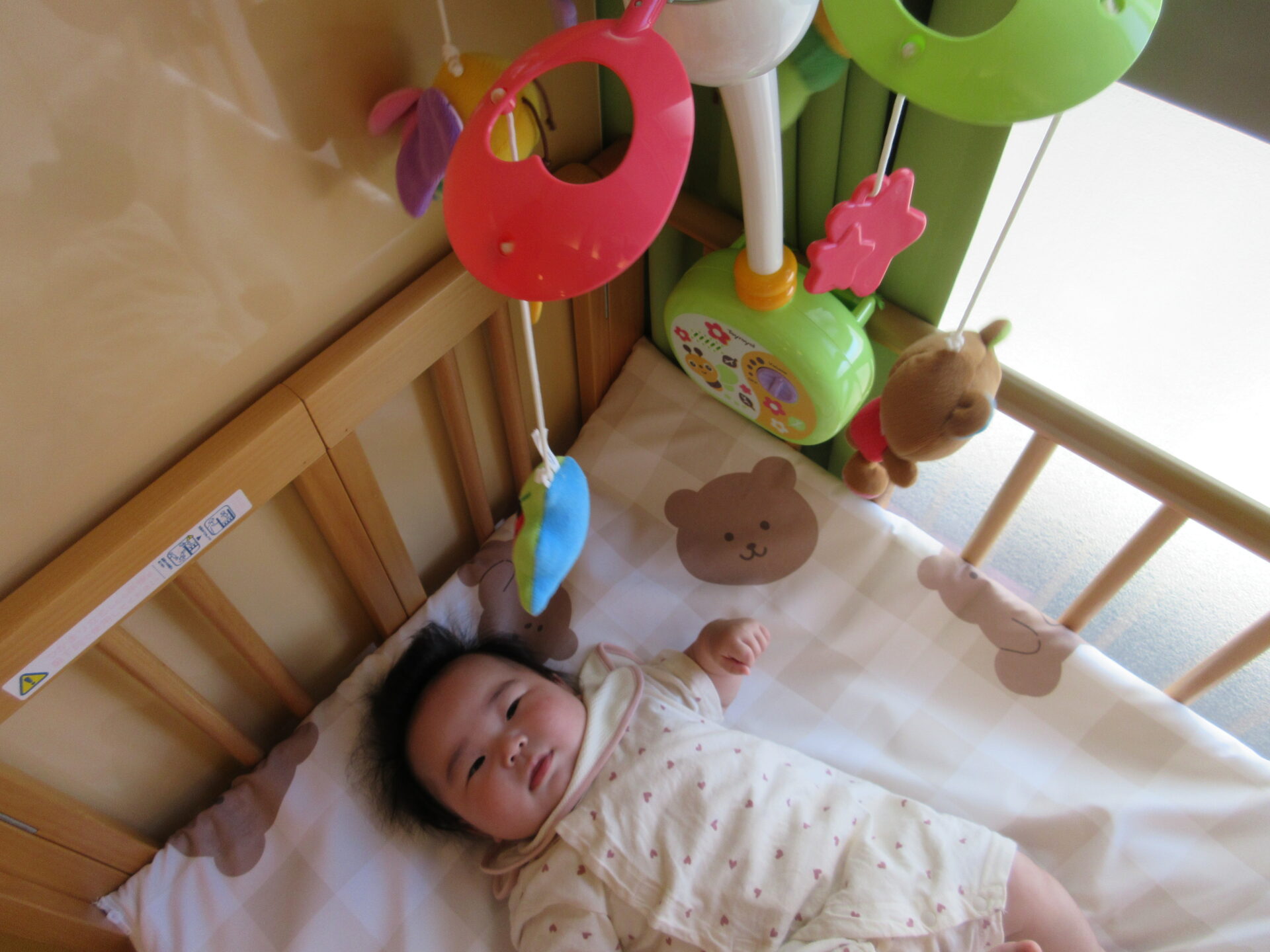 ベッドメリーが大好きで、じーっと目で追って見ています。