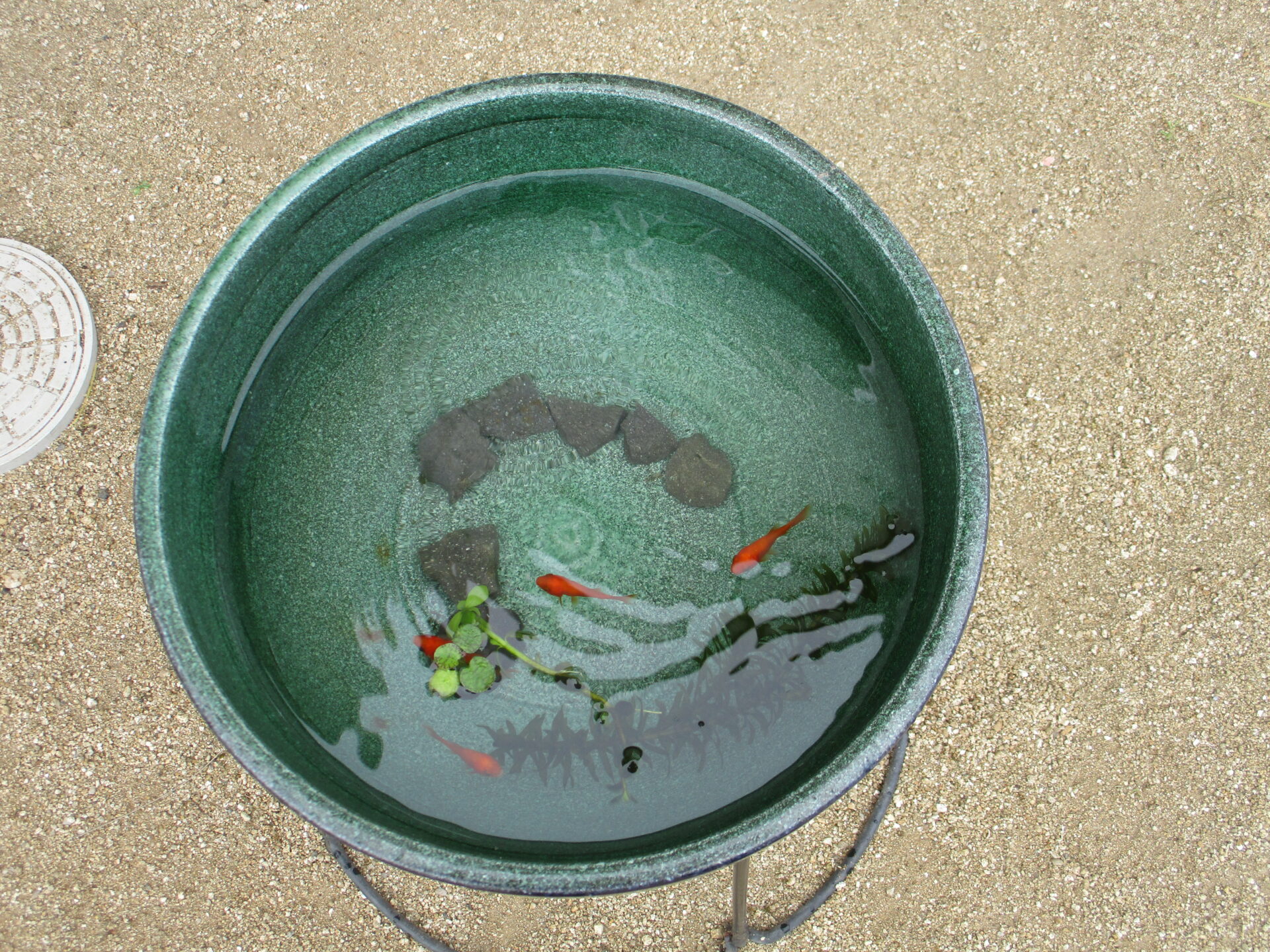 室内だけではなく、園庭でも金魚が見れるようにしました。