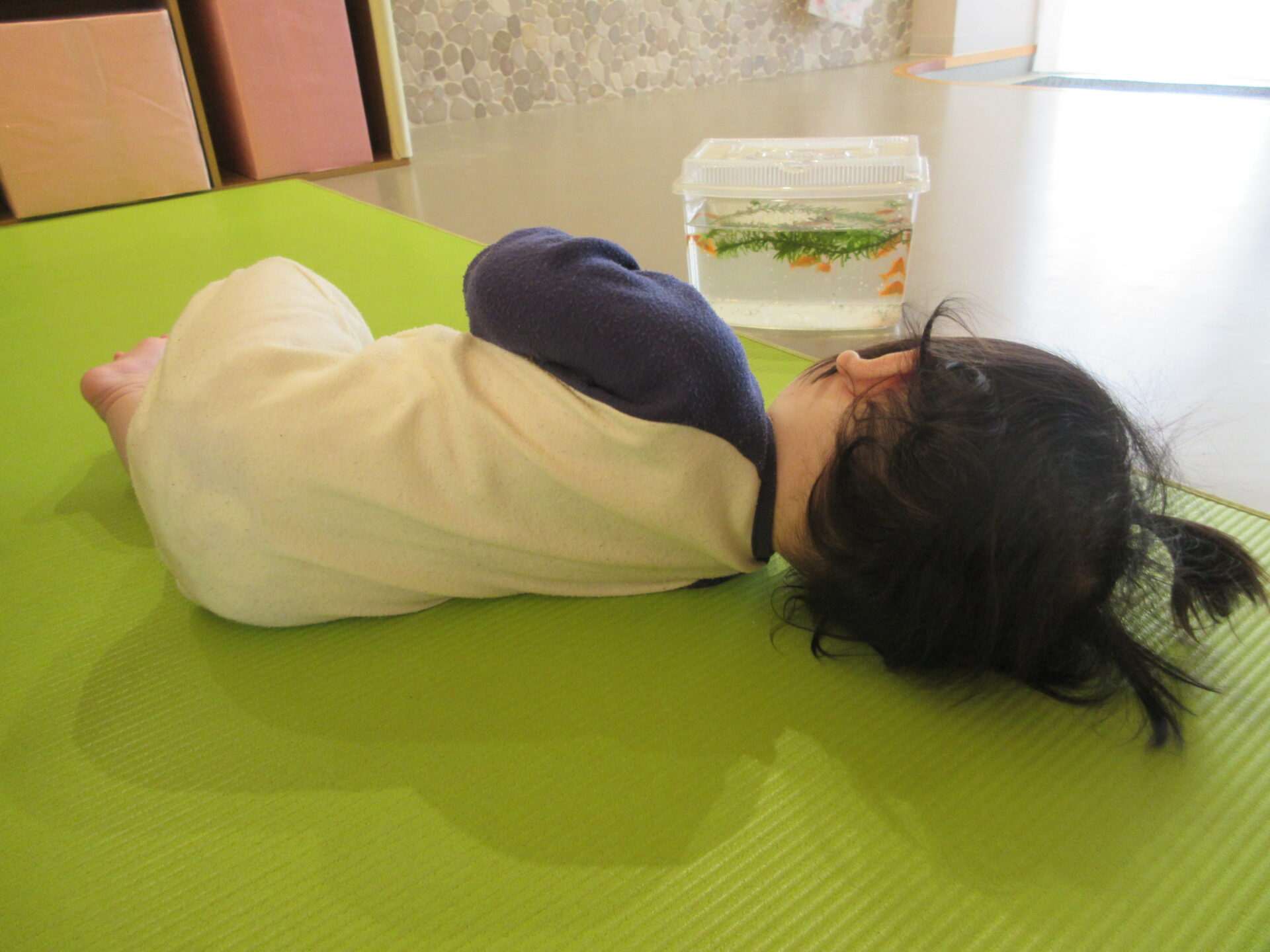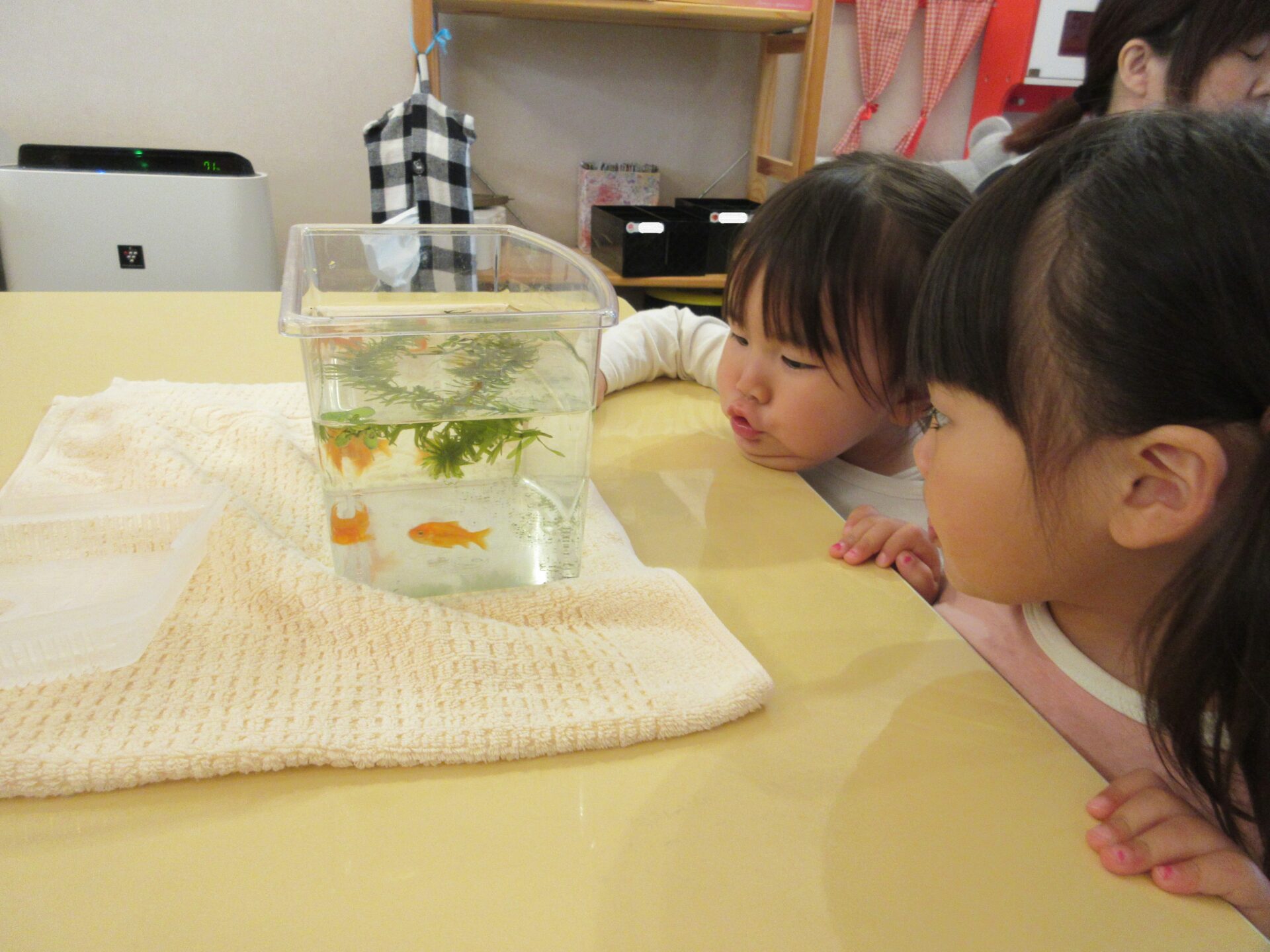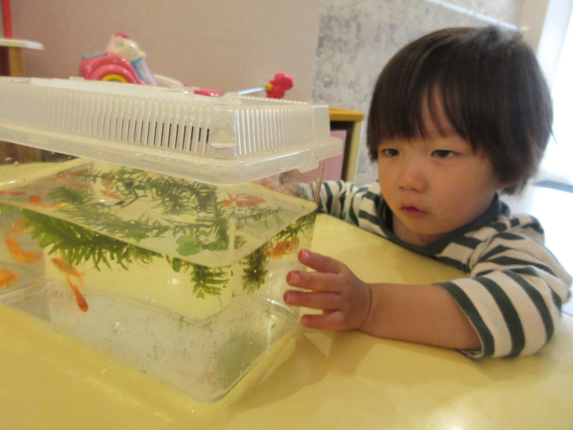 「おさかな見たい?」と聞くと、「うん」と言うので、先生が家から金魚を持ってきてくれました。