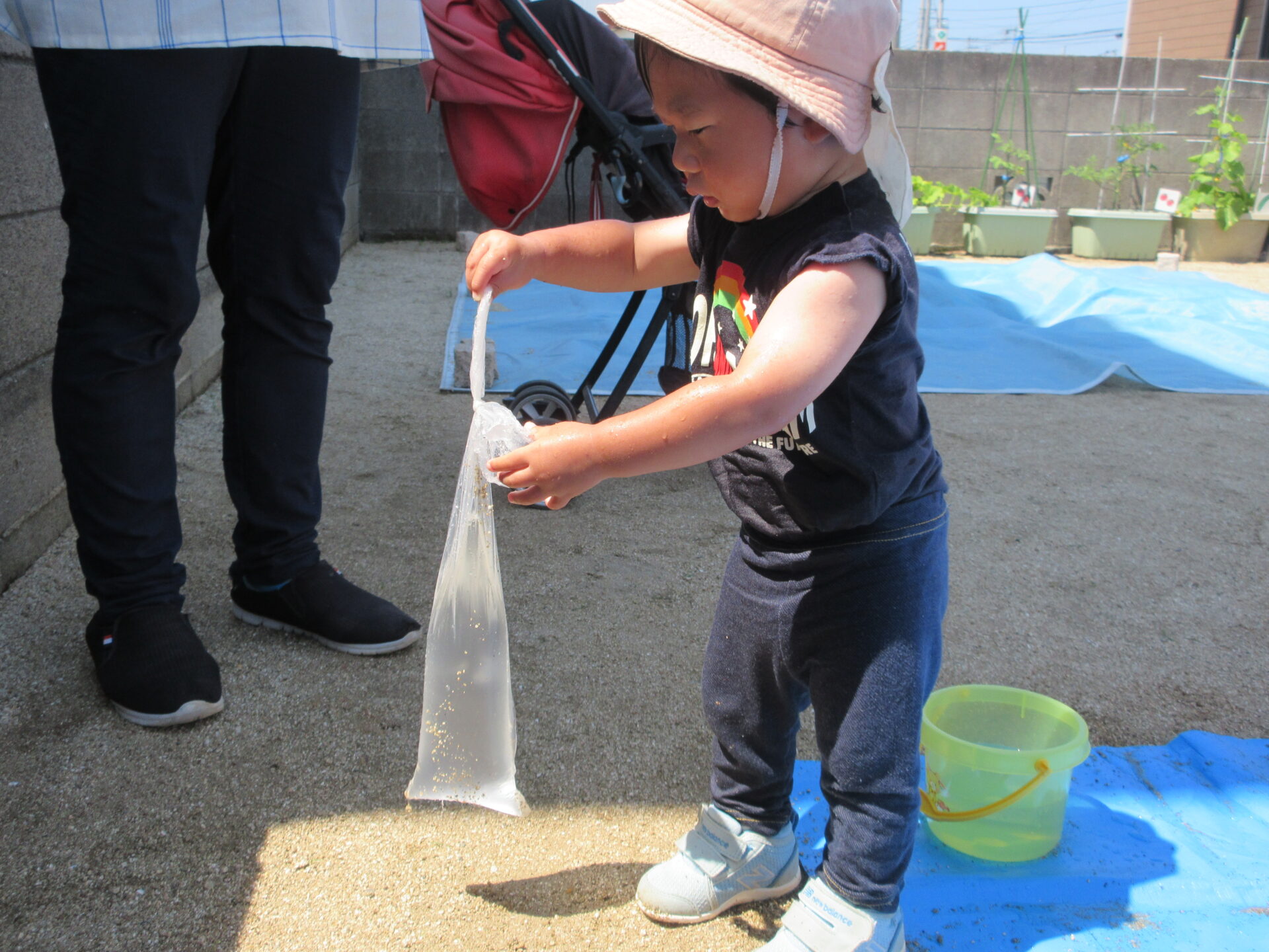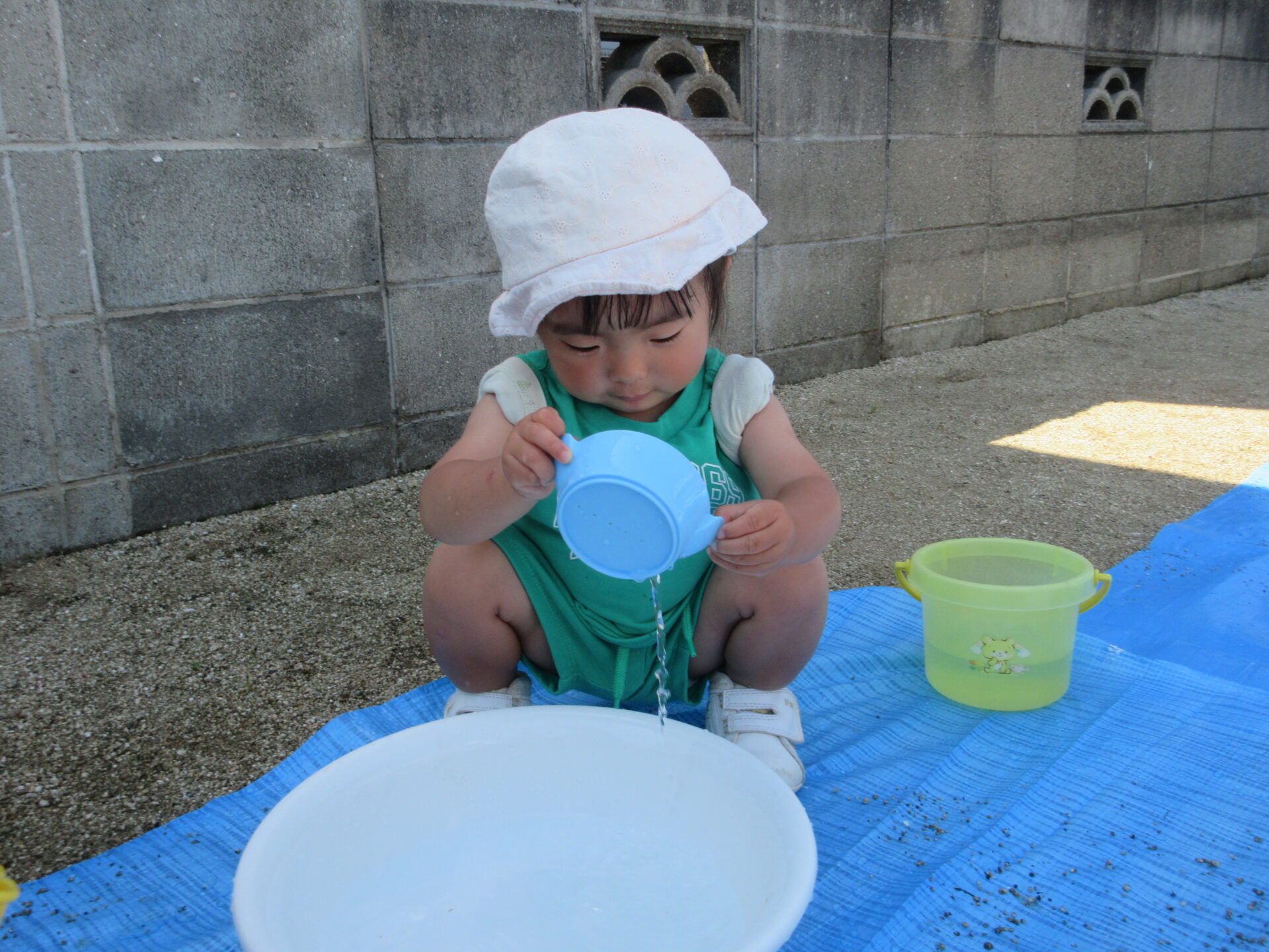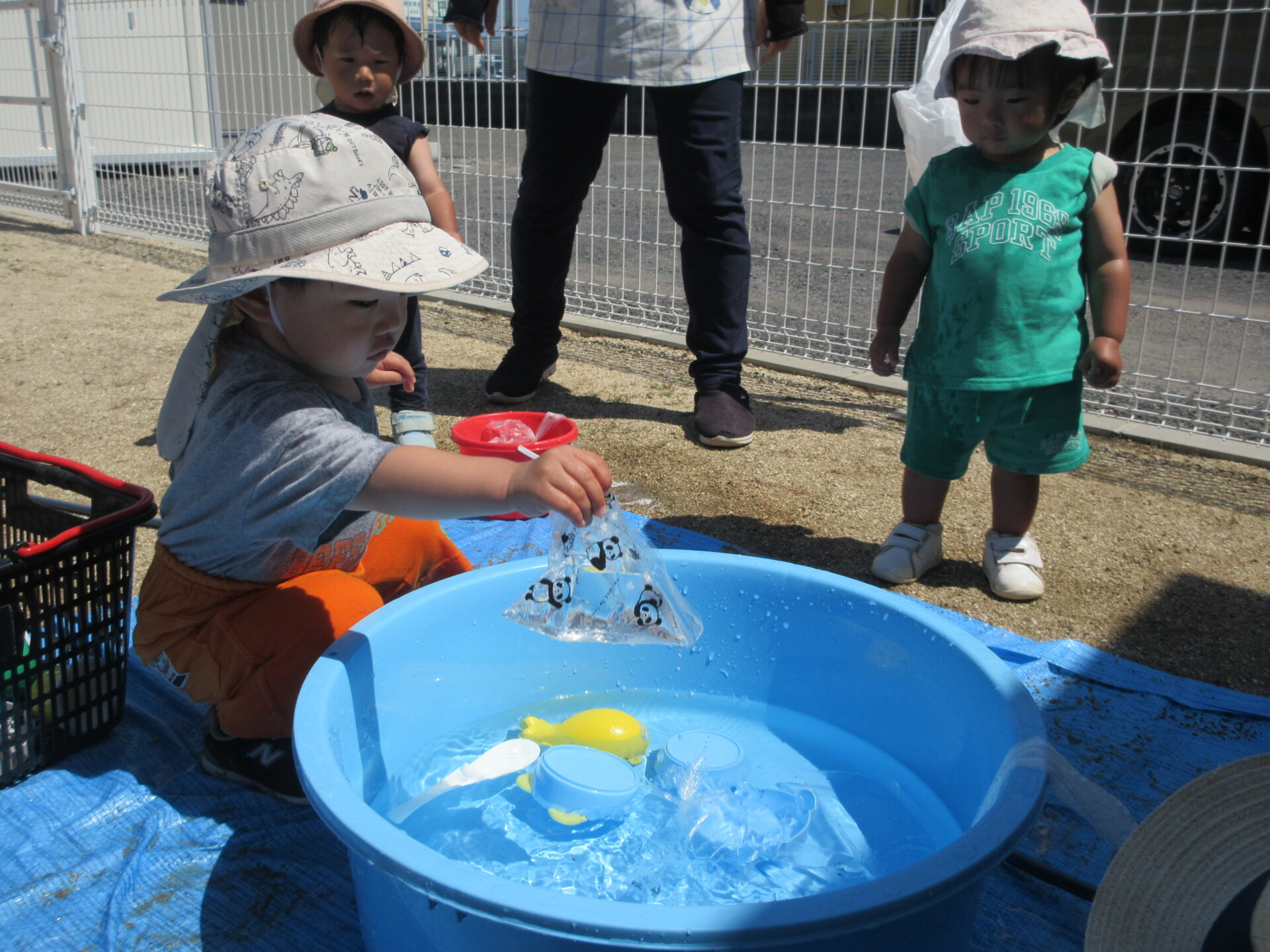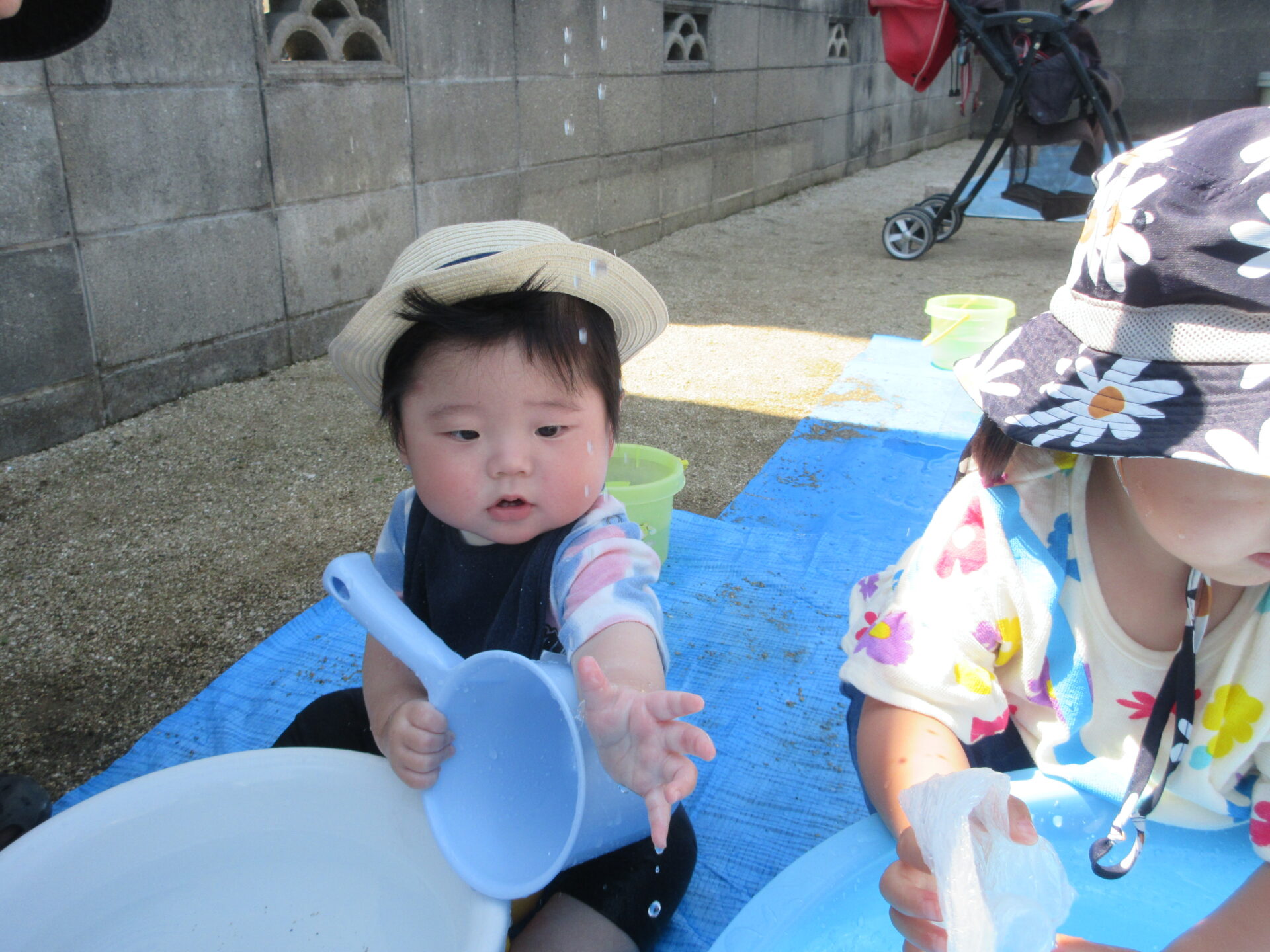 外で遊ぶには暑い季節になってきた6月。タライに水を入れて、少しでも涼しく遊べるように水遊びをしました。