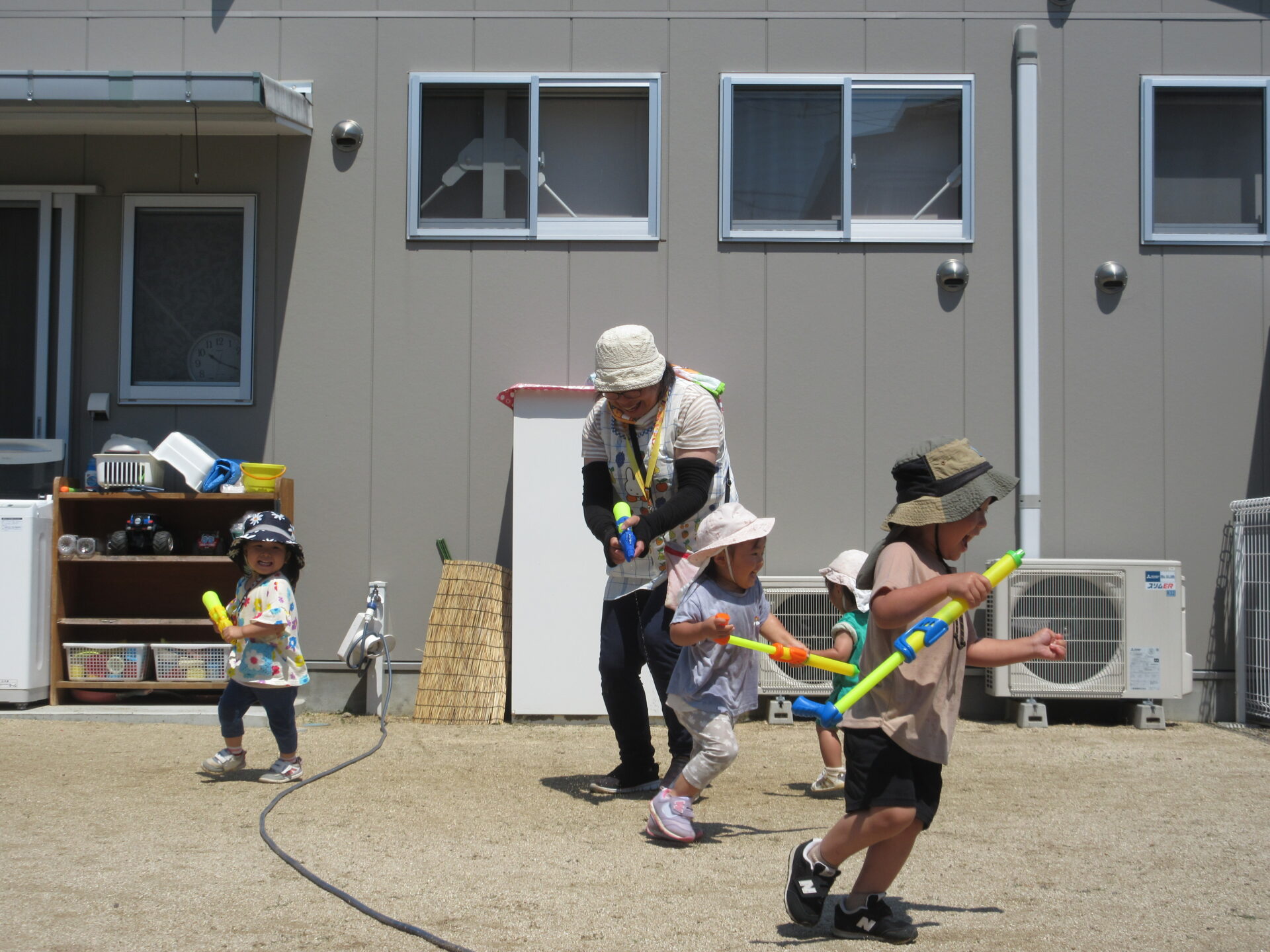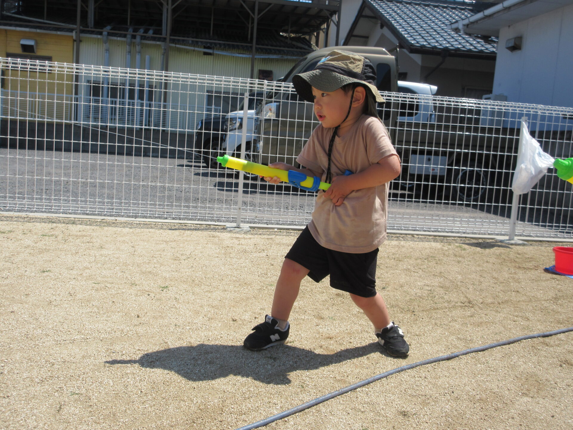 2歳児は水鉄砲に水を入れて、的にめがけて、消防士のようにポーズを決めて放水したり、水の当てあいこで、友だちを追いかけたり、水に当たらないように逃げたりして楽しんでいました。