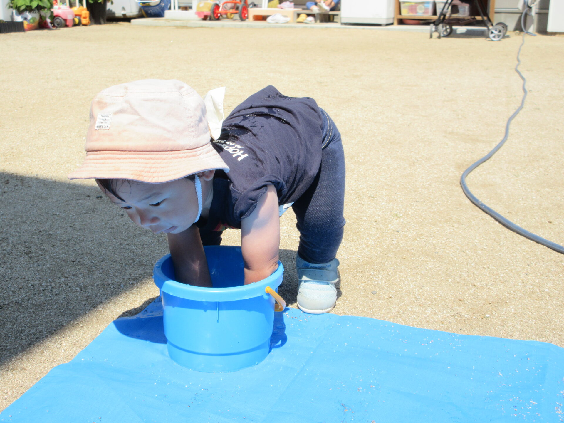 最初は、「タライの水を触って良いのかな?」という感じで遠くで見ていた子どもたちでしたが、保育士が触って見せると、徐々に遊び始めました。