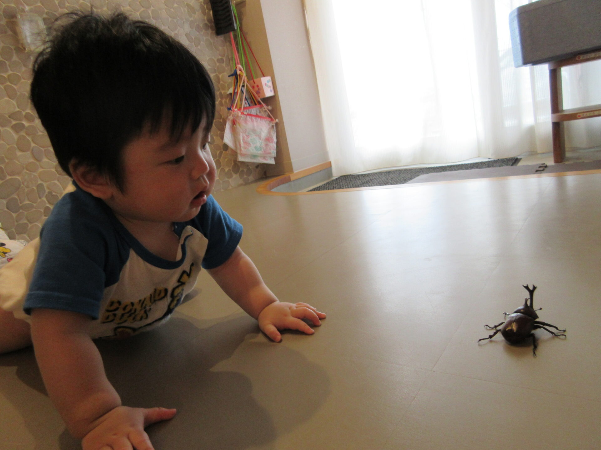 赤ちゃんも、初めて見るカブト虫に興味津々で、じっと見つめていました。