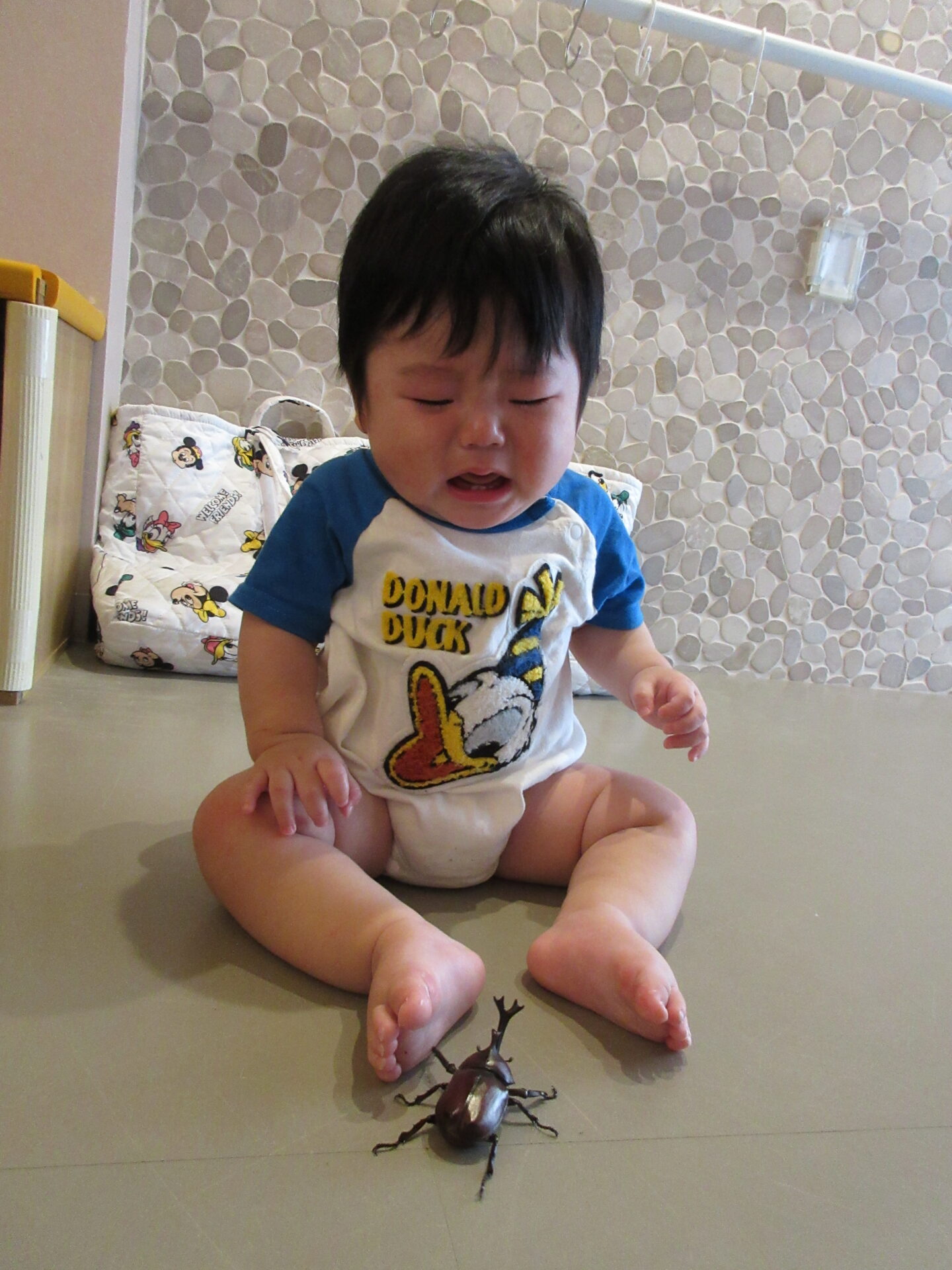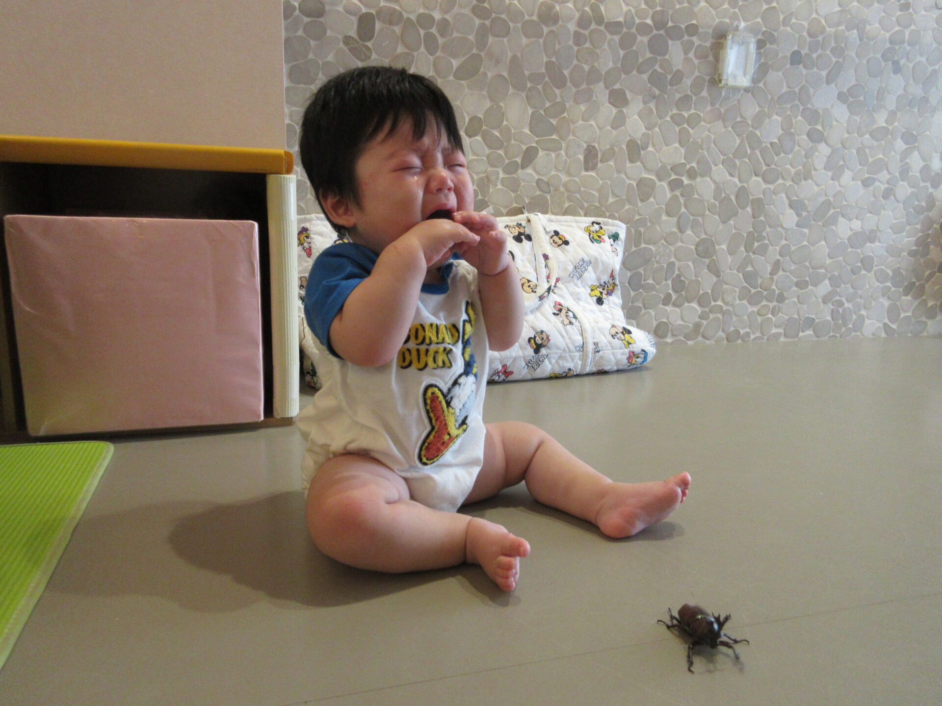 興味津々にカブト虫を見ていた赤ちゃんも、カブト虫のチクチクした足が、自分の足に触れると、ビックリして泣いていました