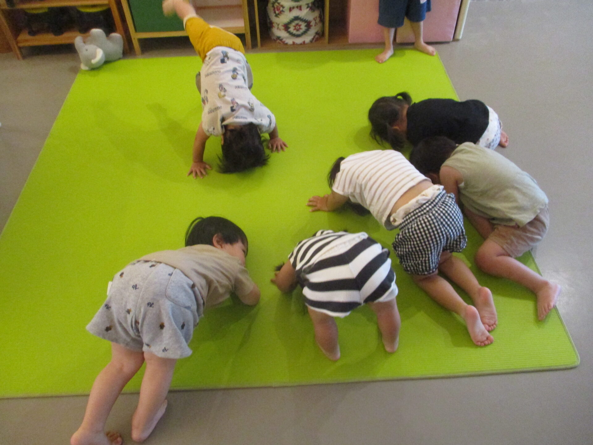 保育士が、はっている間子どもたちは ”ダンゴムシポーズ”で待ちます。